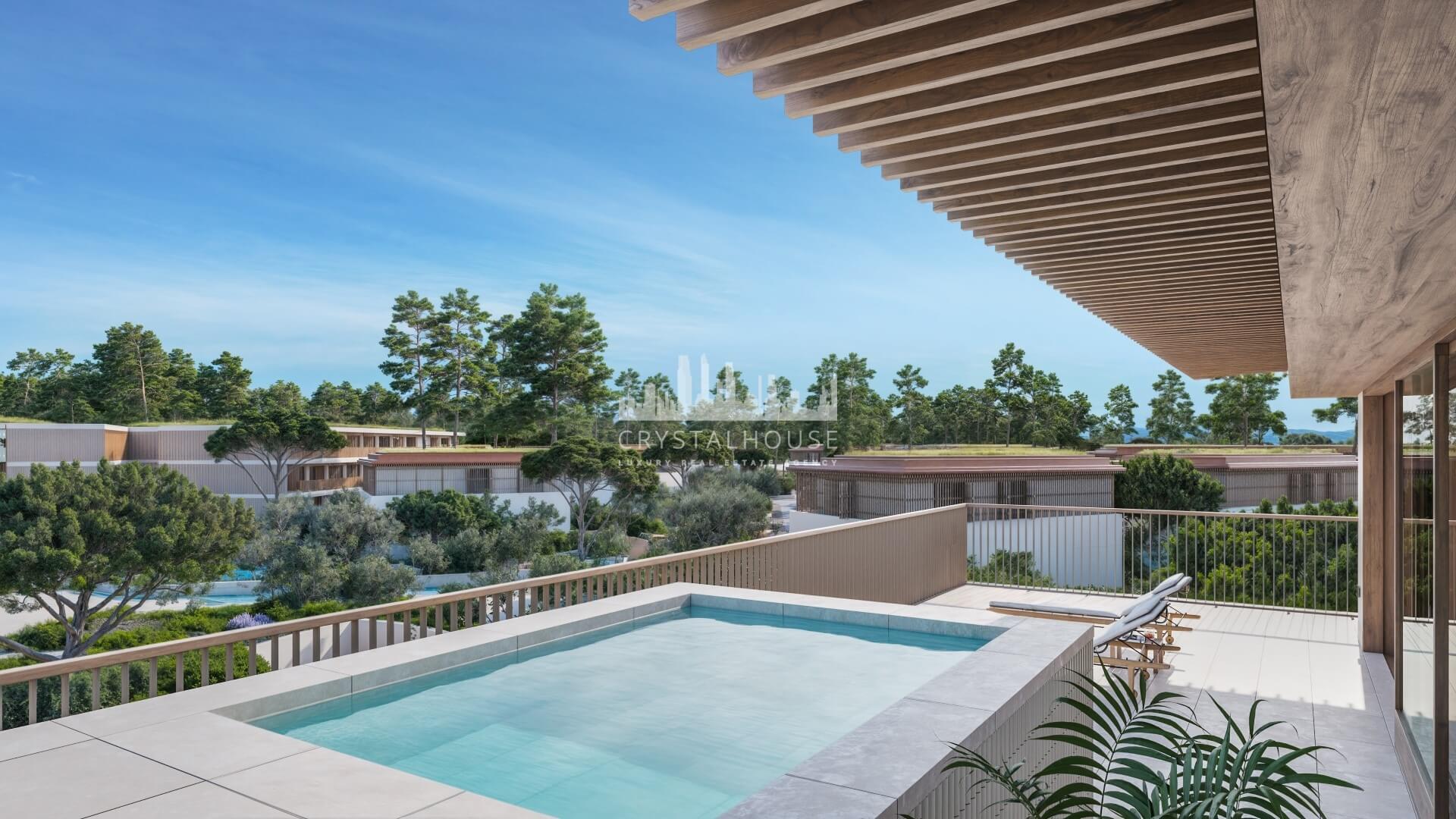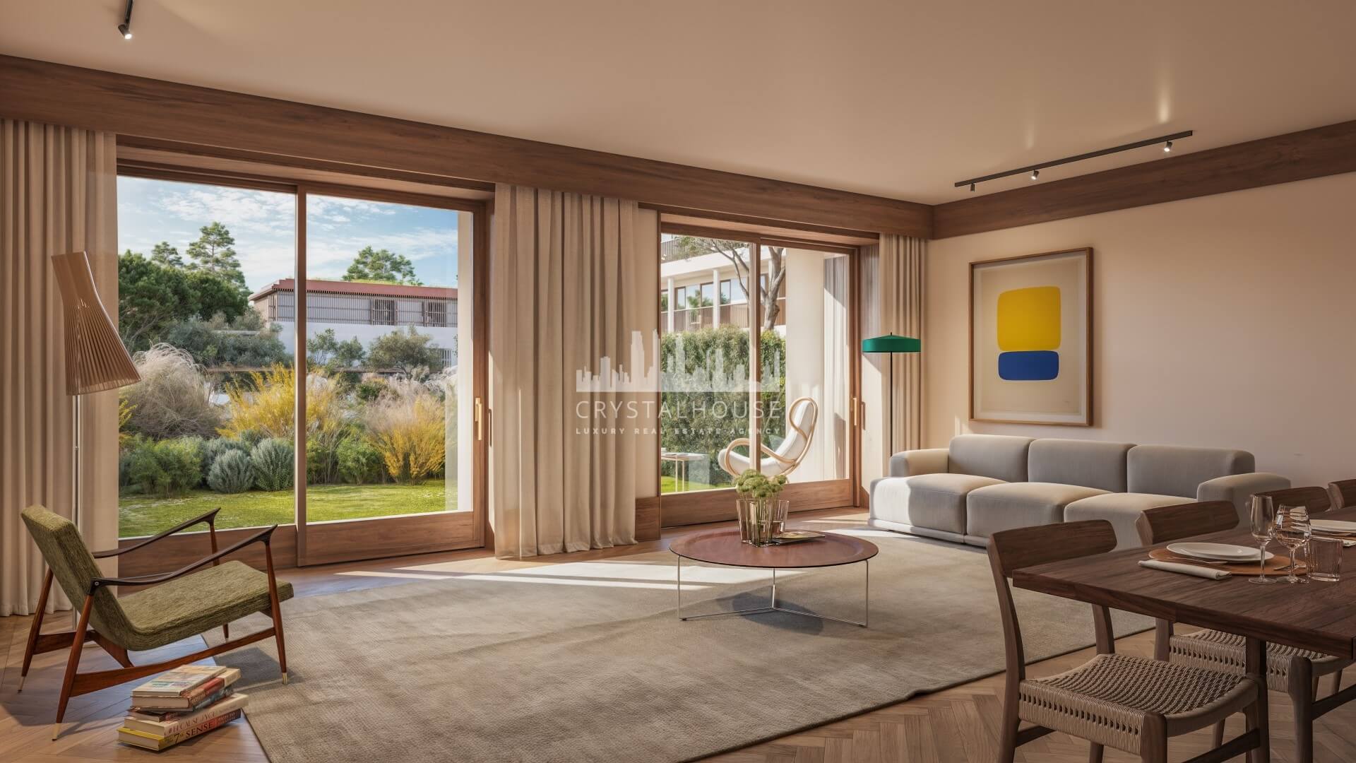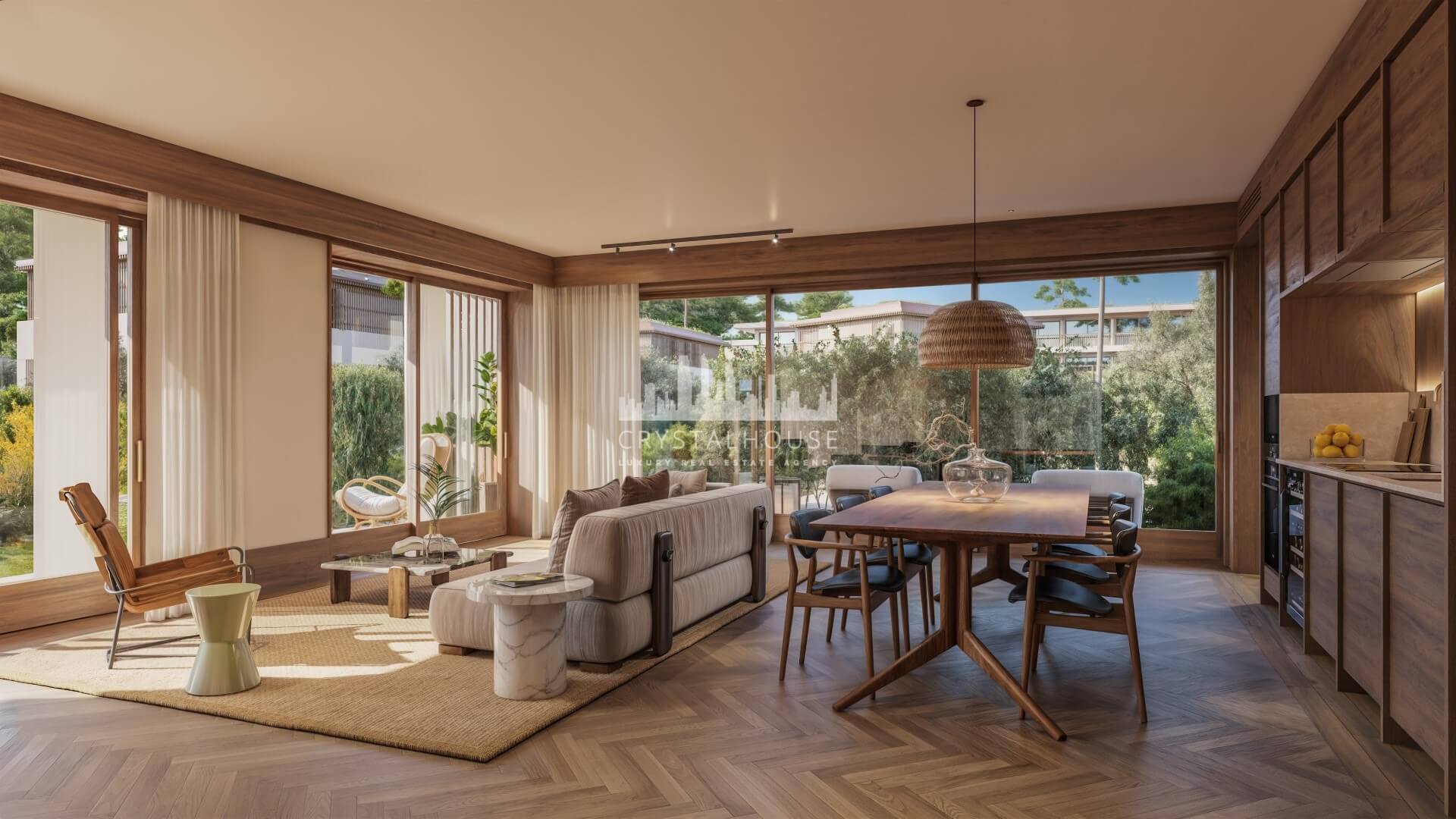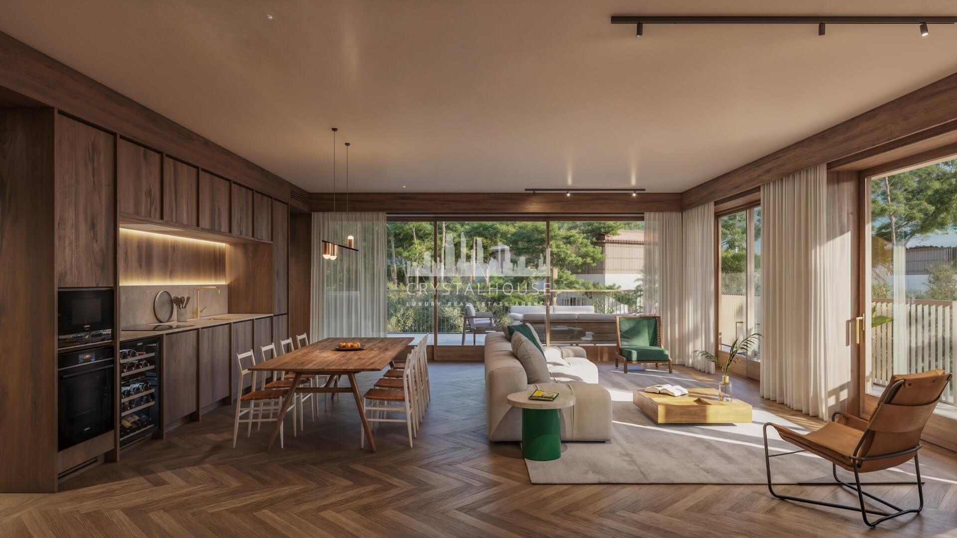 The living area unfolds in open plan, integrating the living room, dining area and kitchen, all with direct access to the terrace, creating a fluid indoor–outdoor experience — perfect for everyday living as well as entertaining.