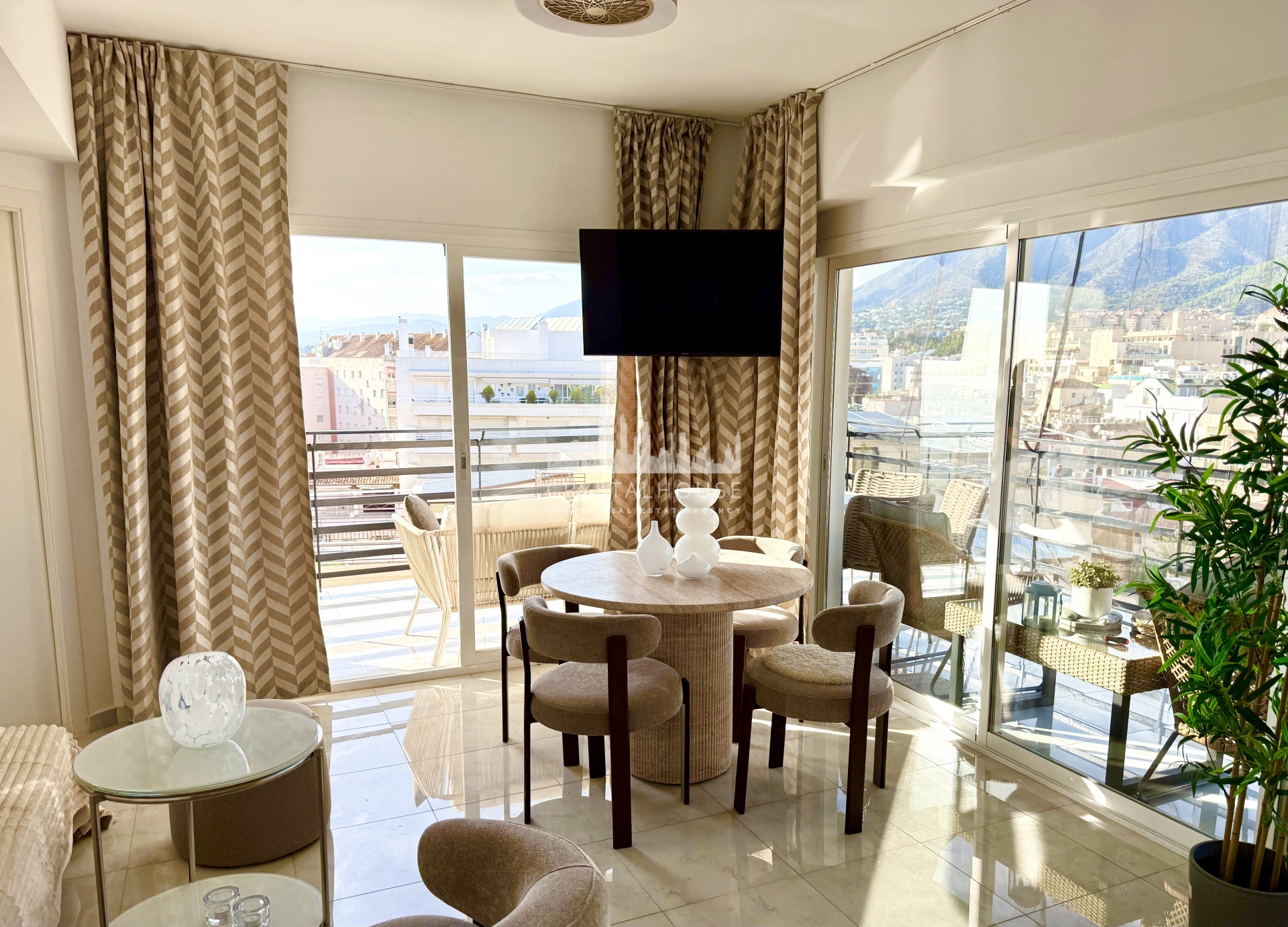 The property has a total area of 72 sqm, consisting of 52 sqm of living space and a generous 20 sqm wrap-around terrace. The terrace offers views of the sea and beach, as well as the mountains and the Old Town. Large panoramic windows provide abundant natural light and an open, airy atmosphere. Enjoy stunning sunsets, and in the evening, the rear side of the terrace reveals Marbella’s sparkling lights against the mountains and the Old Town – truly the best of both worlds.