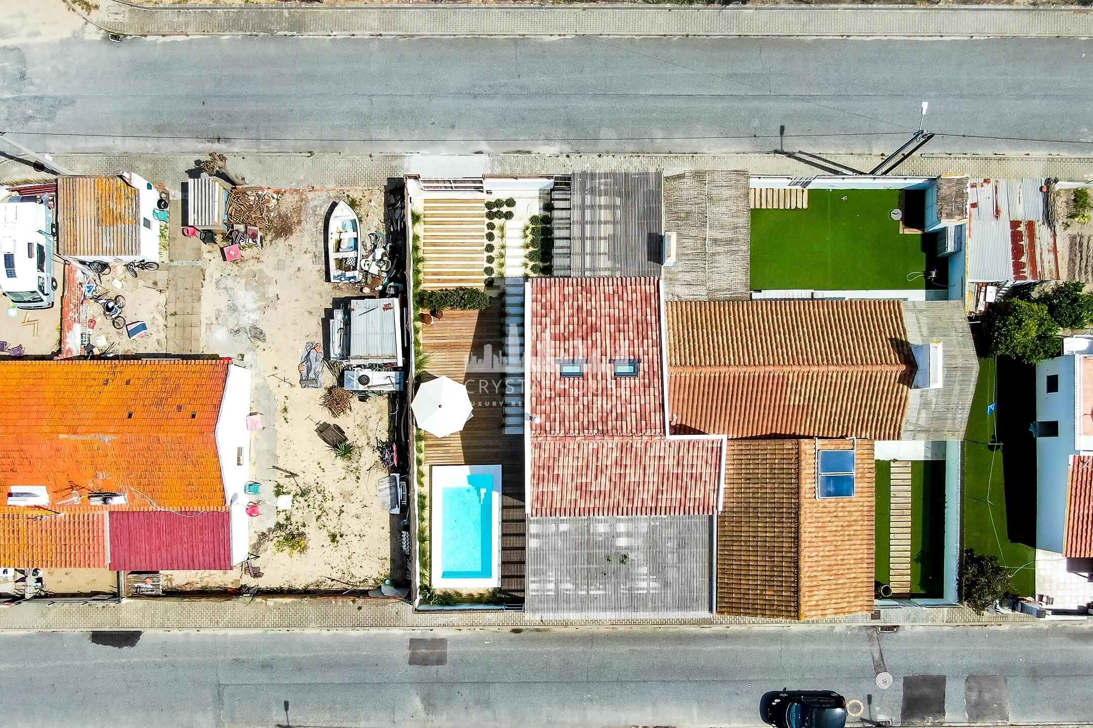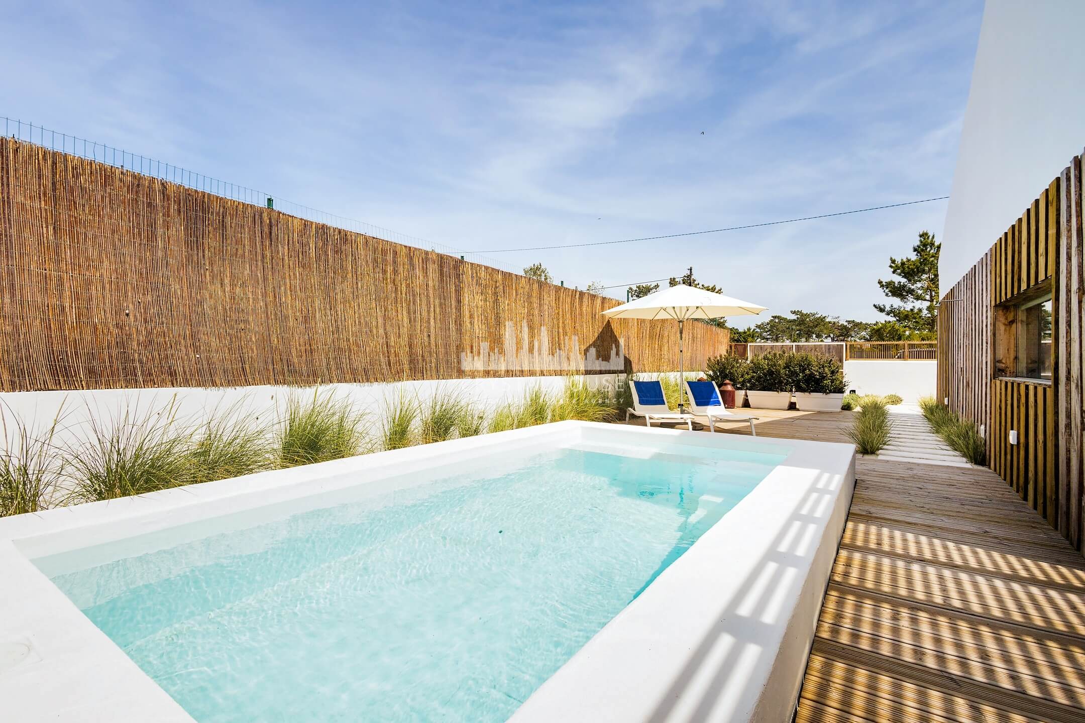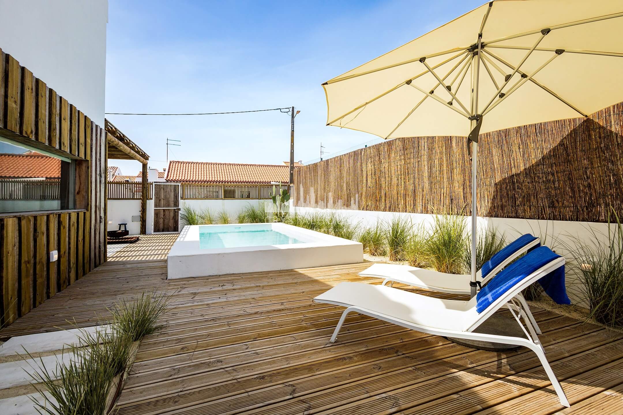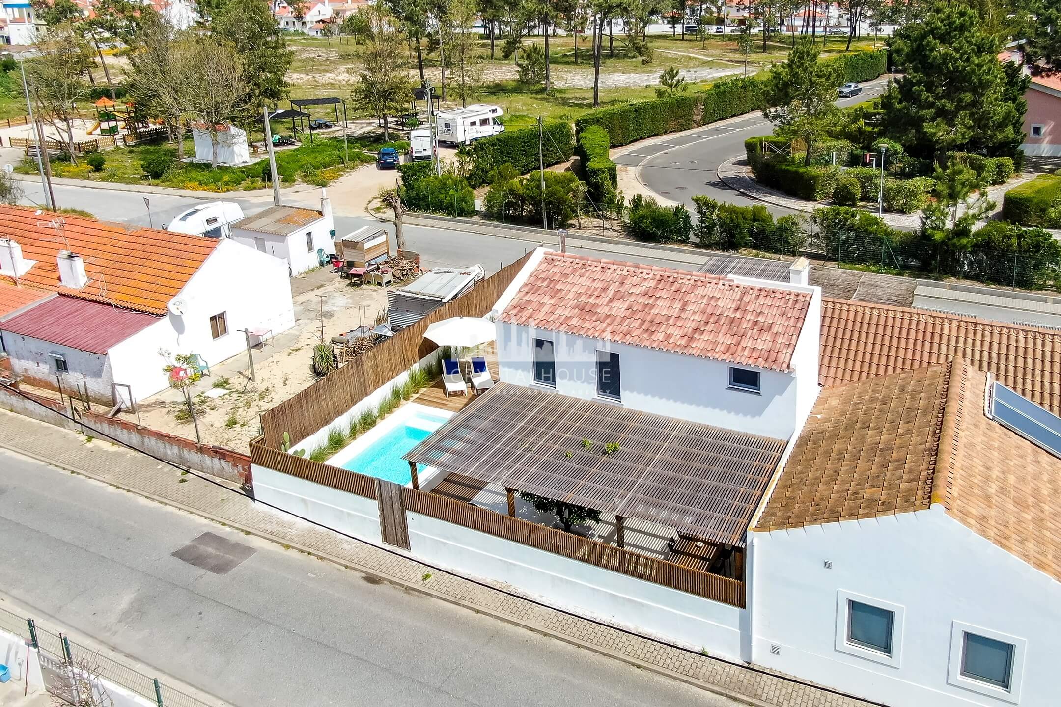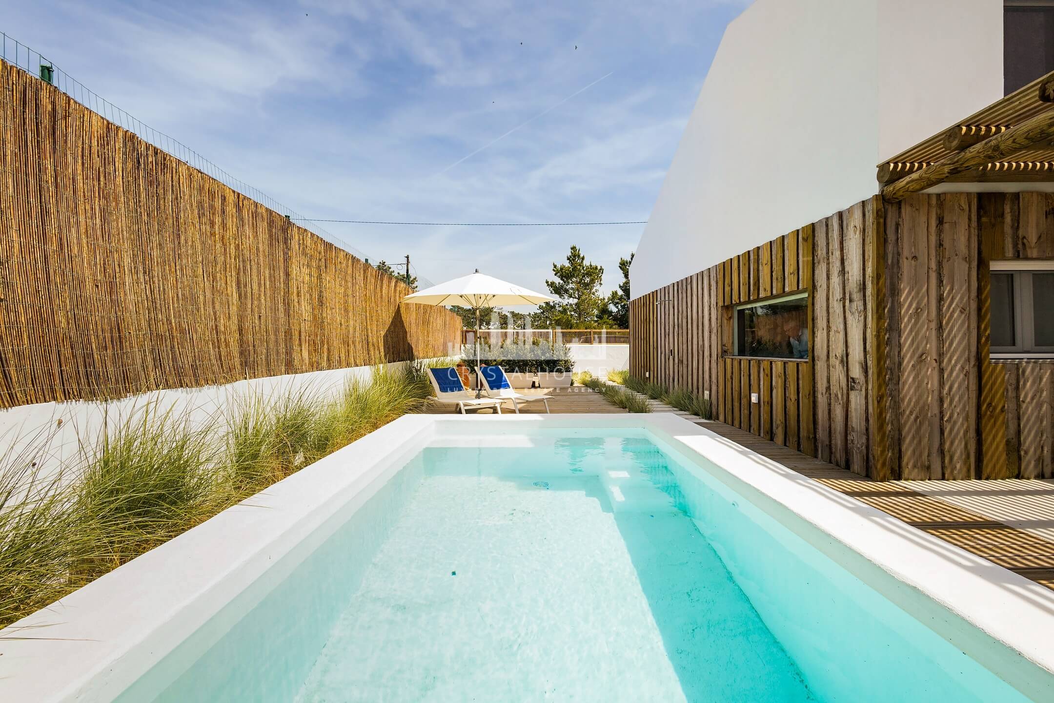 Charming traditional villa in the center of the village of Comporta. It is located a short distance from the beach and close to Comporta’s local stores, cafés and restaurants. It is set in a plot of land with 256.25 m2 and has around 100 m2 of constructed area. A vacation home with all the comforts: air conditioning, fully-equipped kitchen, swimming pool, barbecue, porch with leisure area, garden and parking, while retaining its traditional features. It has 3 bedrooms. On the first floor there is a living room, a kitchen, a suite, a bedroom and a guest toilet. On the second floor there are 2 bedrooms and a guest toilet. Porches for outdoor lounges on the east and west sides of the house.