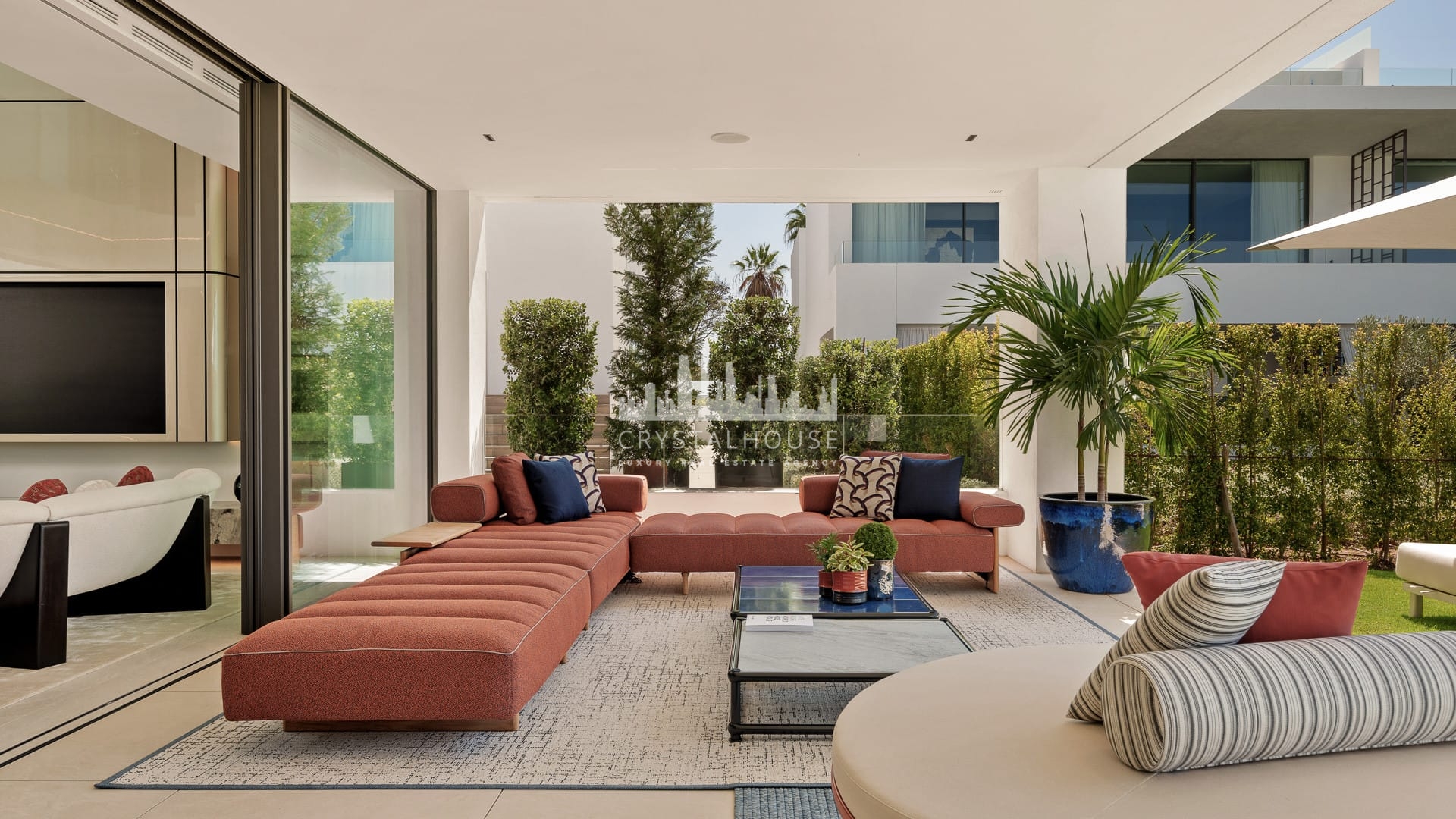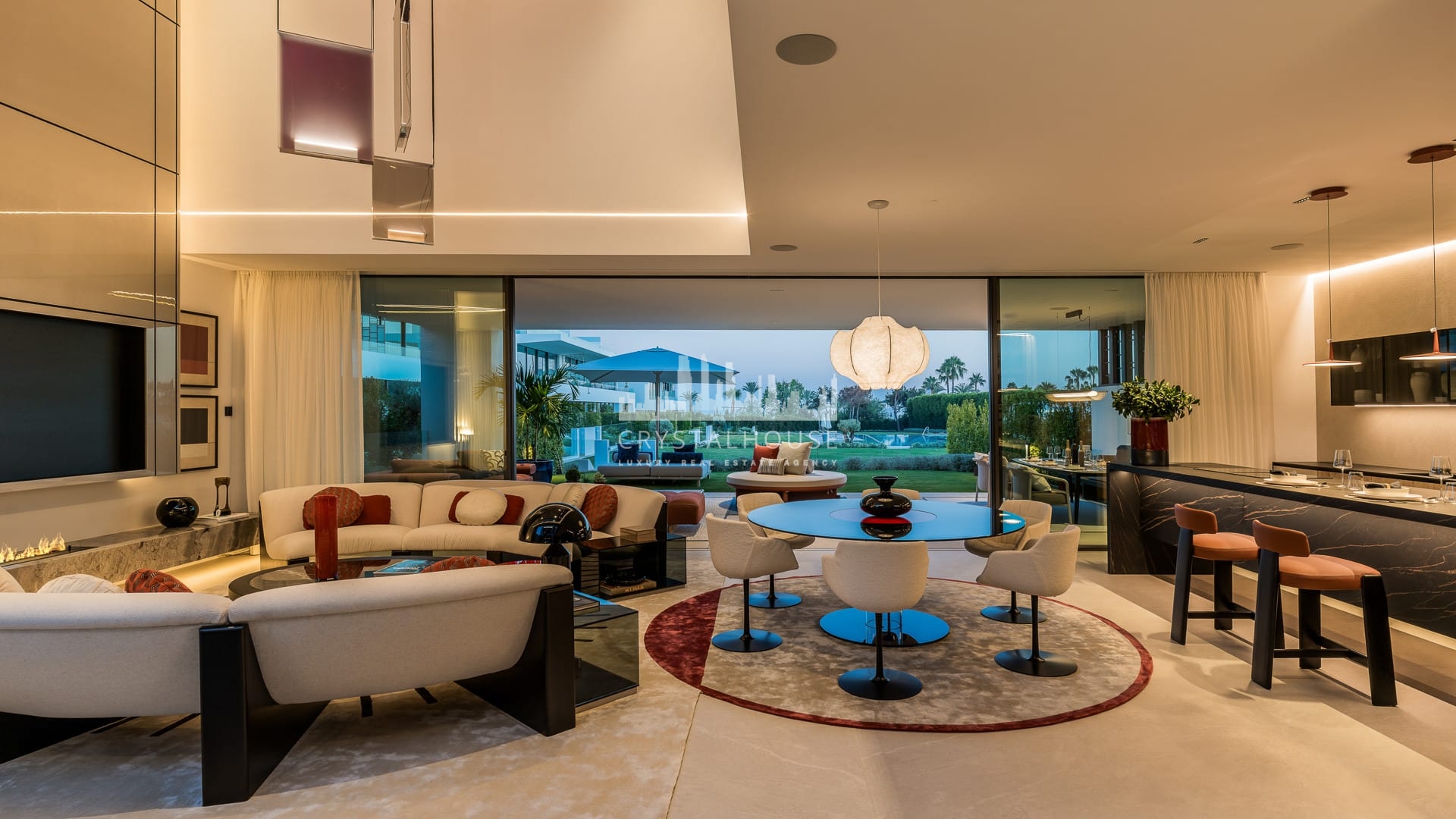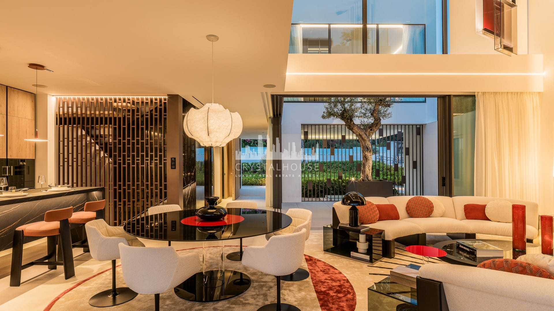 The villa’s interior showcases elegant modern design by Pedro Peña, featuring a soaring double-height living area, designer Gaggenau kitchen, and refined finishes throughout. Large floor-to-ceiling glass doors open to a beautifully landscaped terrace with a mature olive tree, creating a seamless connection between indoor and outdoor living.