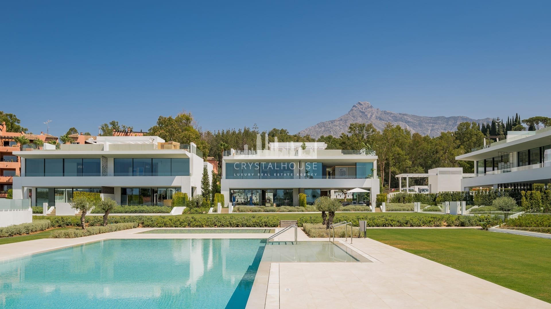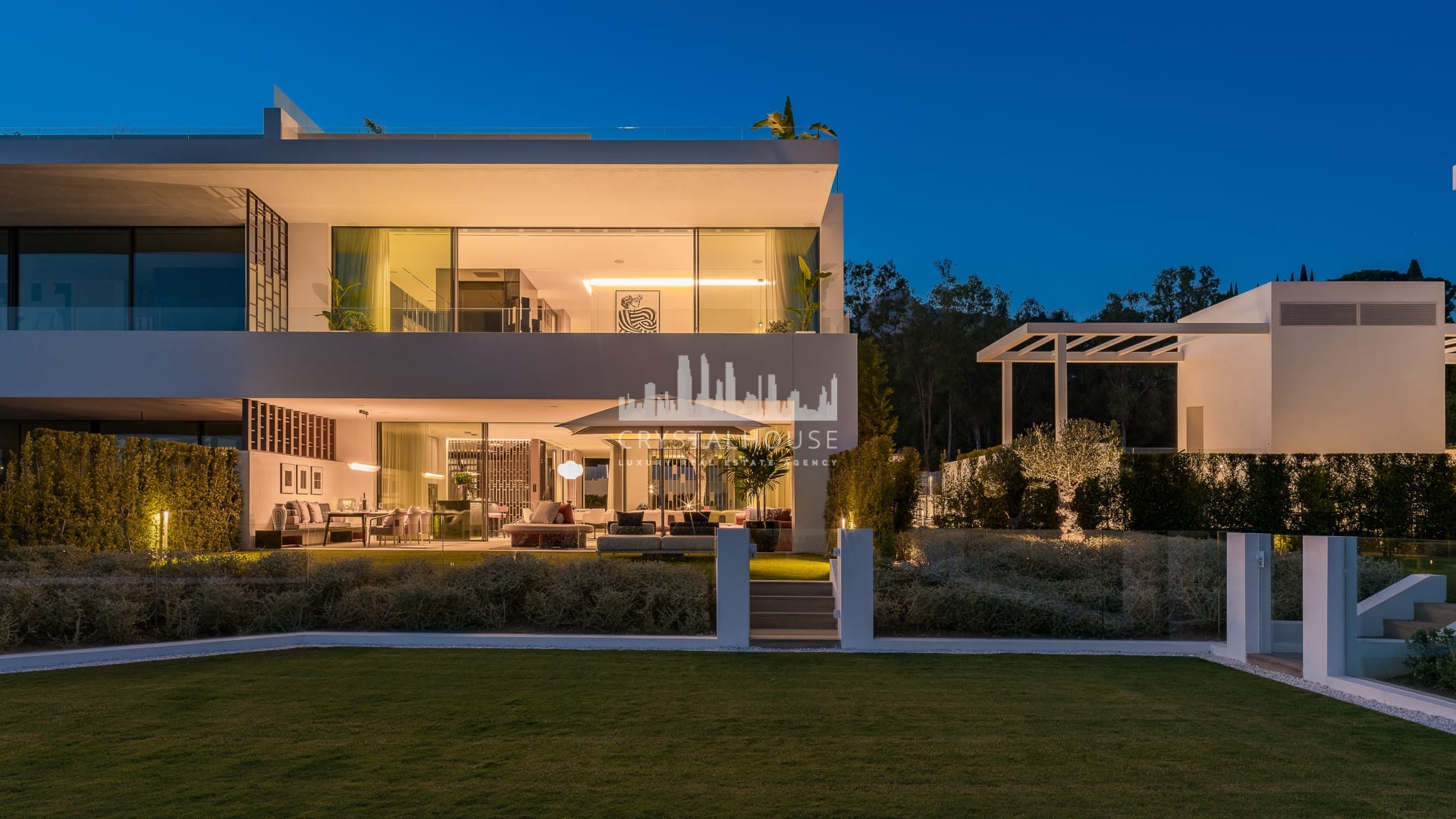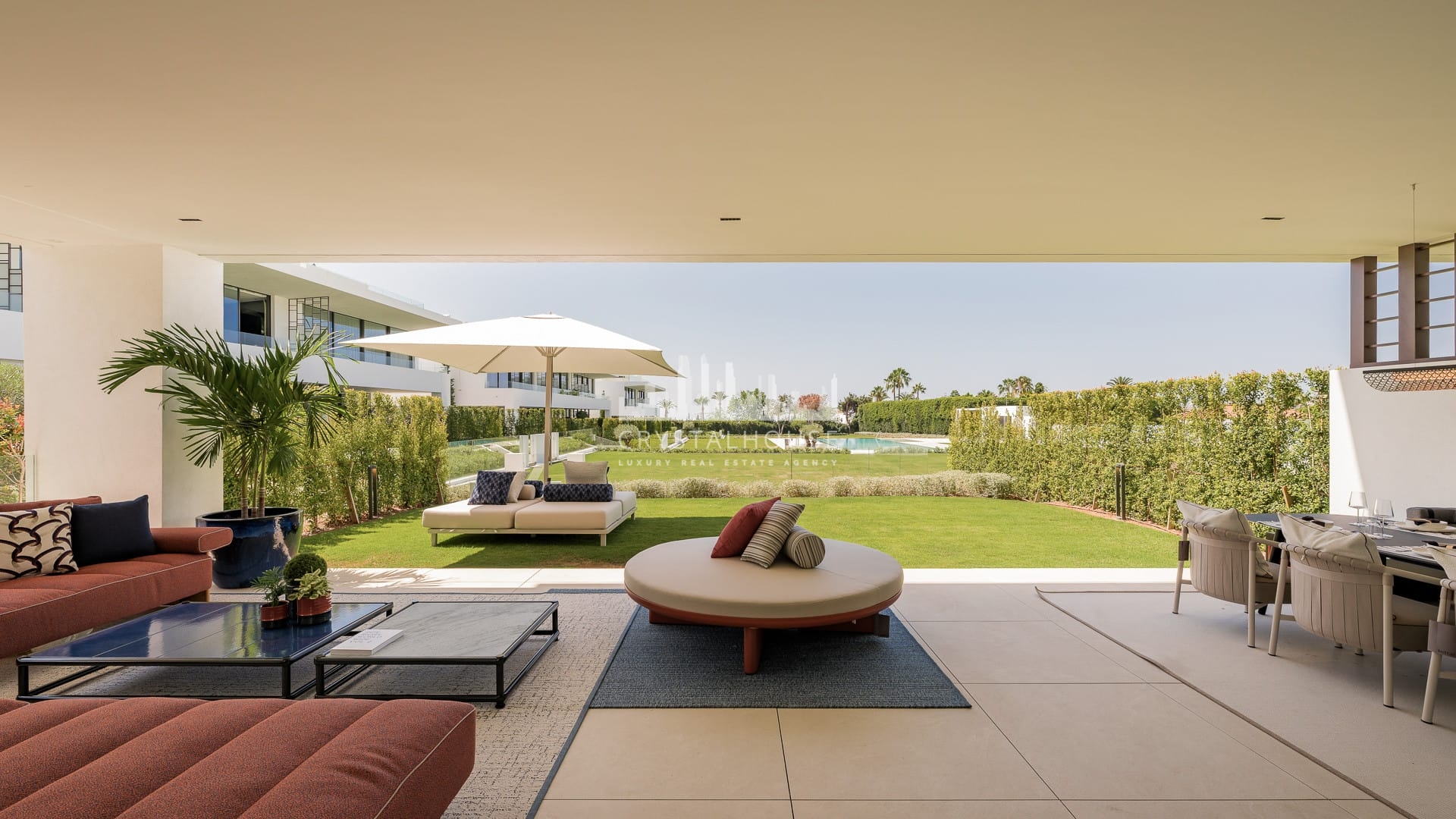 The villa’s interior showcases elegant modern design by Pedro Peña, featuring a soaring double-height living area, designer Gaggenau kitchen, and refined finishes throughout. Large floor-to-ceiling glass doors open to a beautifully landscaped terrace with a mature olive tree, creating a seamless connection between indoor and outdoor living.