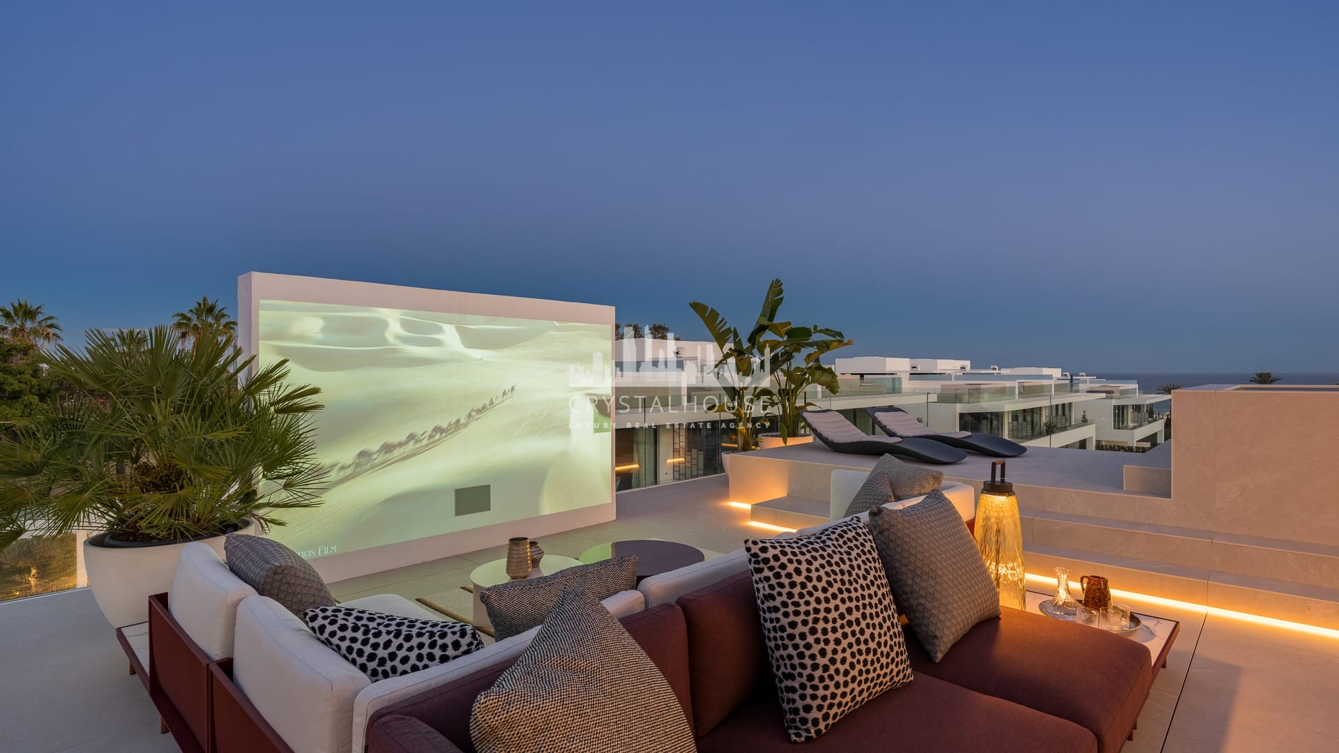The rooftop terrace is the ultimate entertainment space—complete with a private pool, outdoor kitchen, and a projector for open-air cinema nights overlooking the Mediterranean Sea and La Concha mountain.