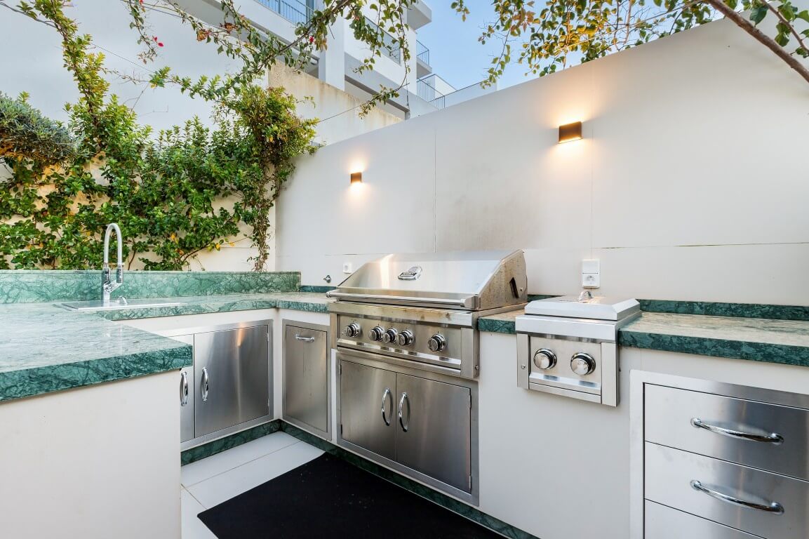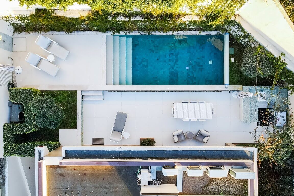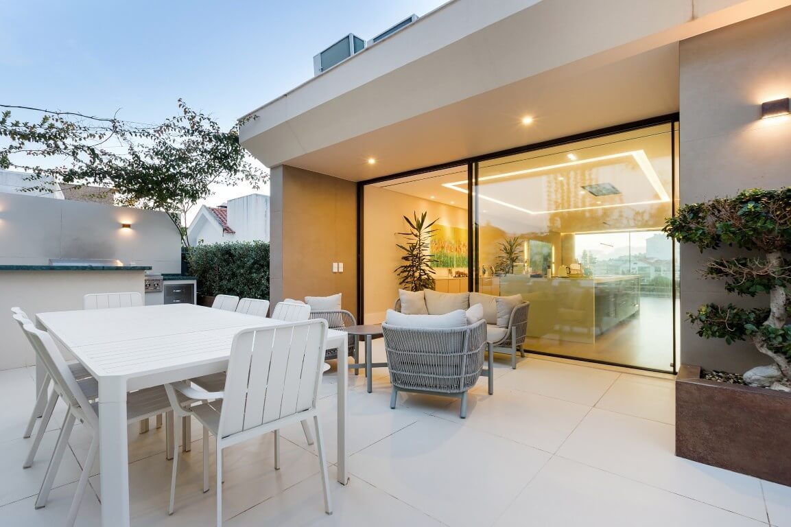 On the upper floor, the living room, dining area, and open-plan kitchen create a spacious, bright, and functional environment, where everything connects seamlessly with the outdoors. Large glass surfaces naturally extend the interior into the outdoor area, featuring a swimming pool, garden, outdoor kitchen, and barbecue area. A full bathroom supports this exterior zone, ensuring total comfort for outdoor living, entertaining, and pool use. A space designed for those who enjoy hosting, cooking, and living outdoors as a natural extension of the home.