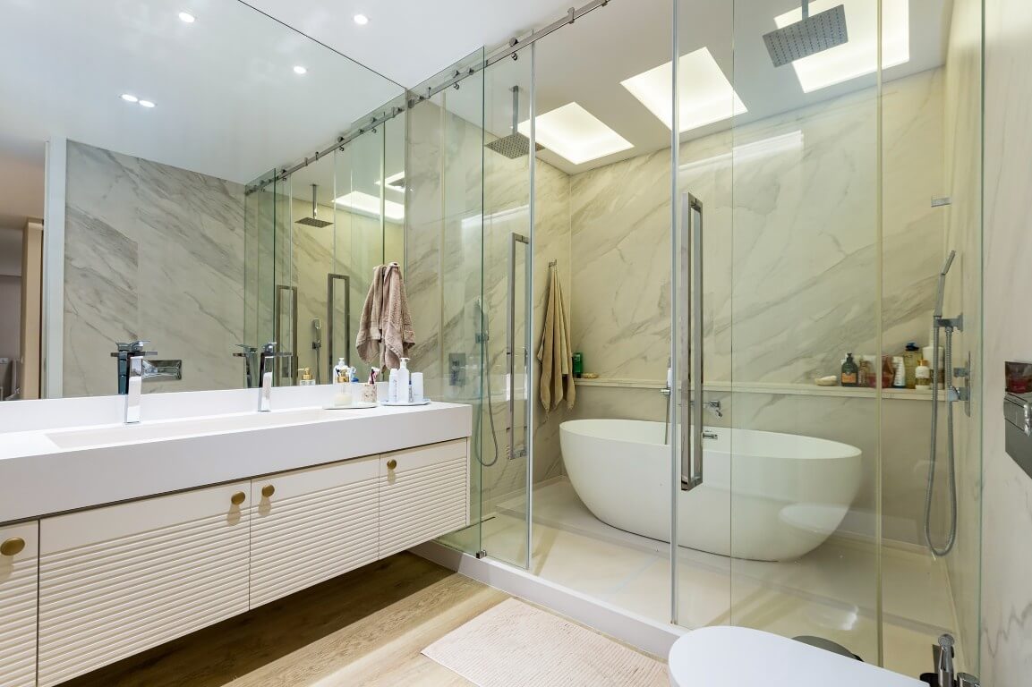 On the lower floor, the house adapts seamlessly to contemporary living. An office, lounge area, laundry room, guest bathroom, and an additional suite offer total flexibility: remote work, guests, an older child, or an independent living space within the villa. This level also features a Turkish bath, with independent access from both the interior and the exterior of the house — a rare and thoughtful addition that enhances wellness, privacy, and the overall living experience.