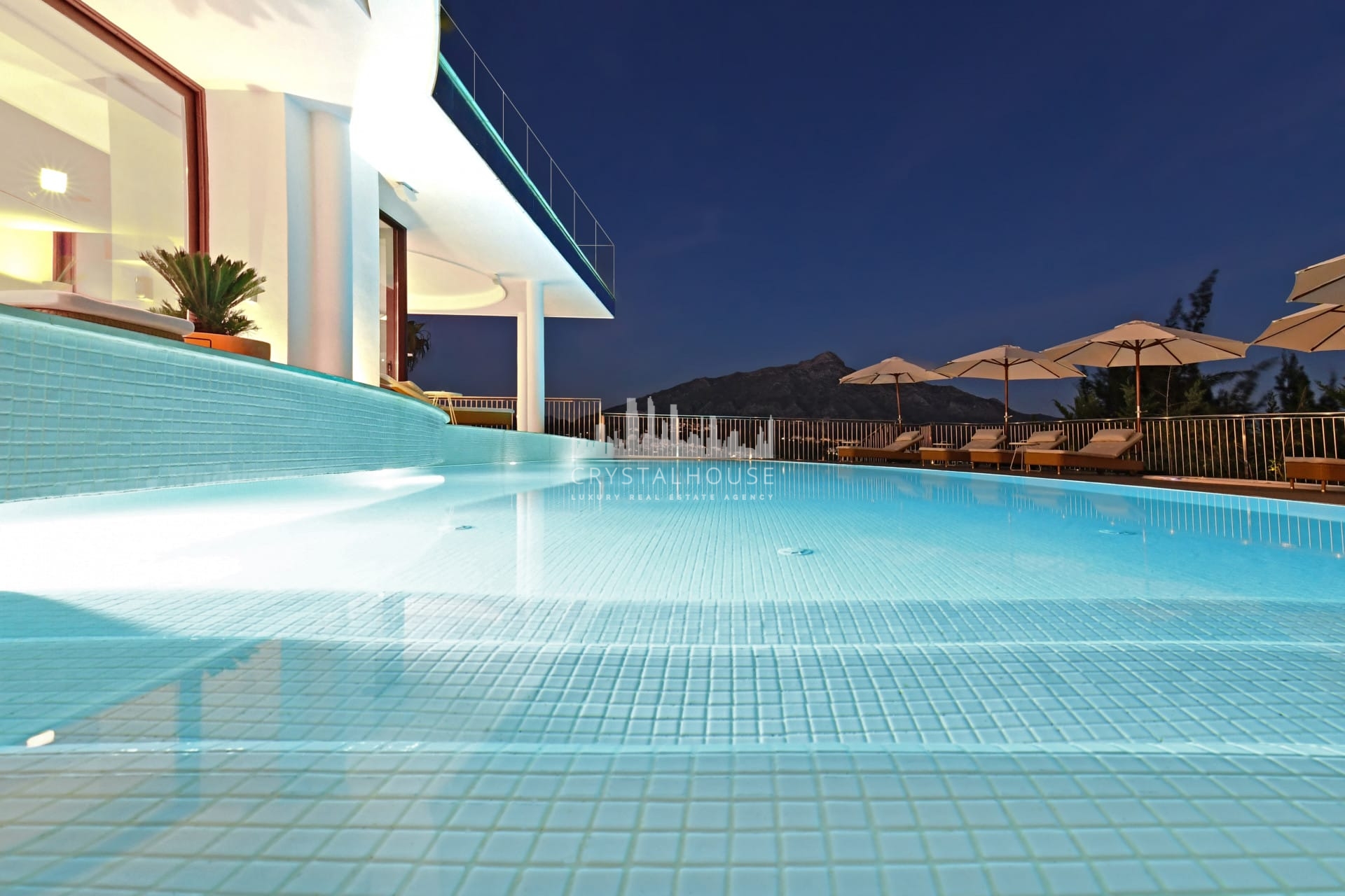 Outside, the expansive infinity pool merges with the horizon, while the rooftop jacuzzi and chill-out terrace boast stunning sunsets over La Concha mountain. A secluded gym, tropical landscaping, and privacy throughout complete this extraordinary residence.