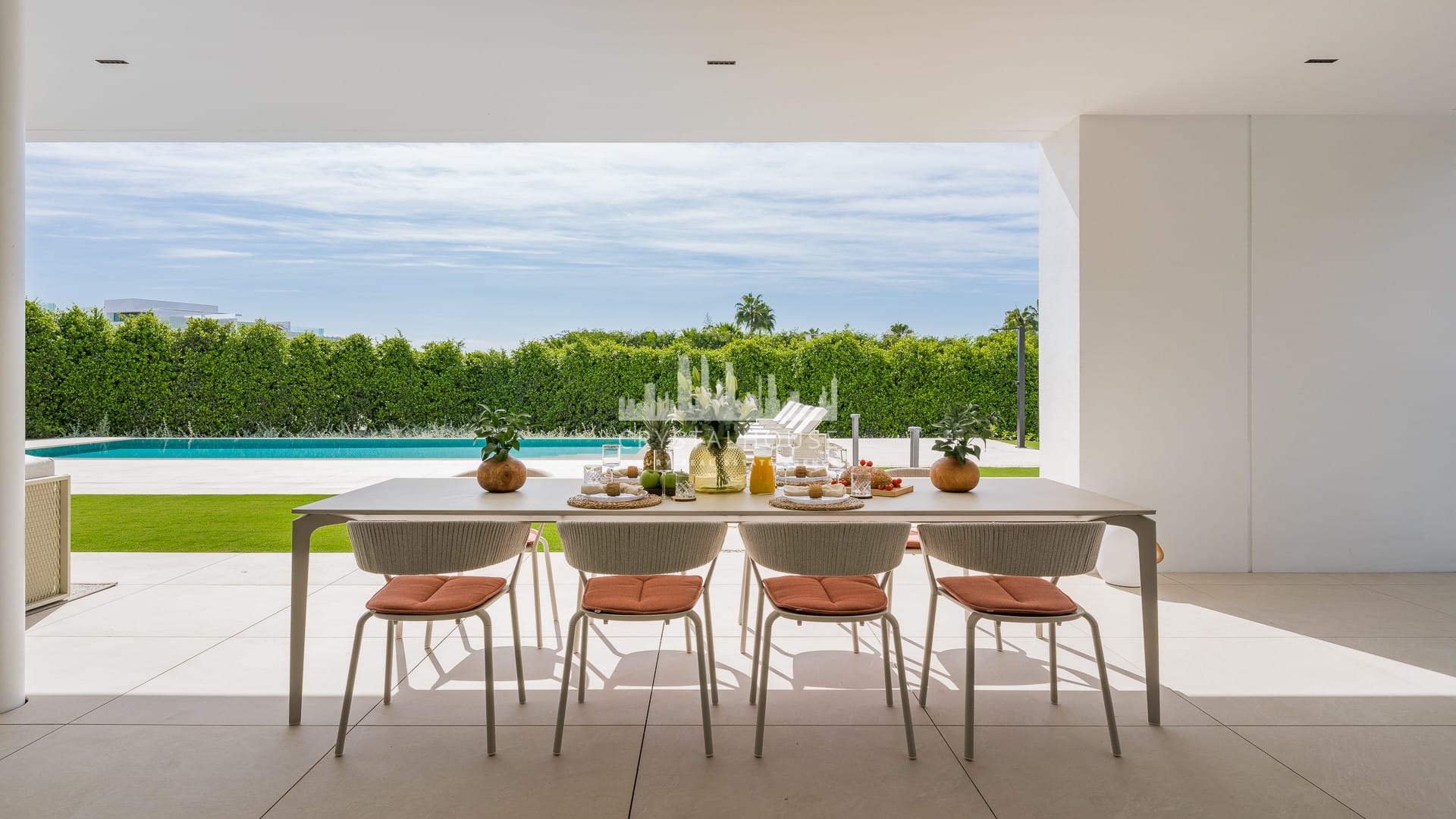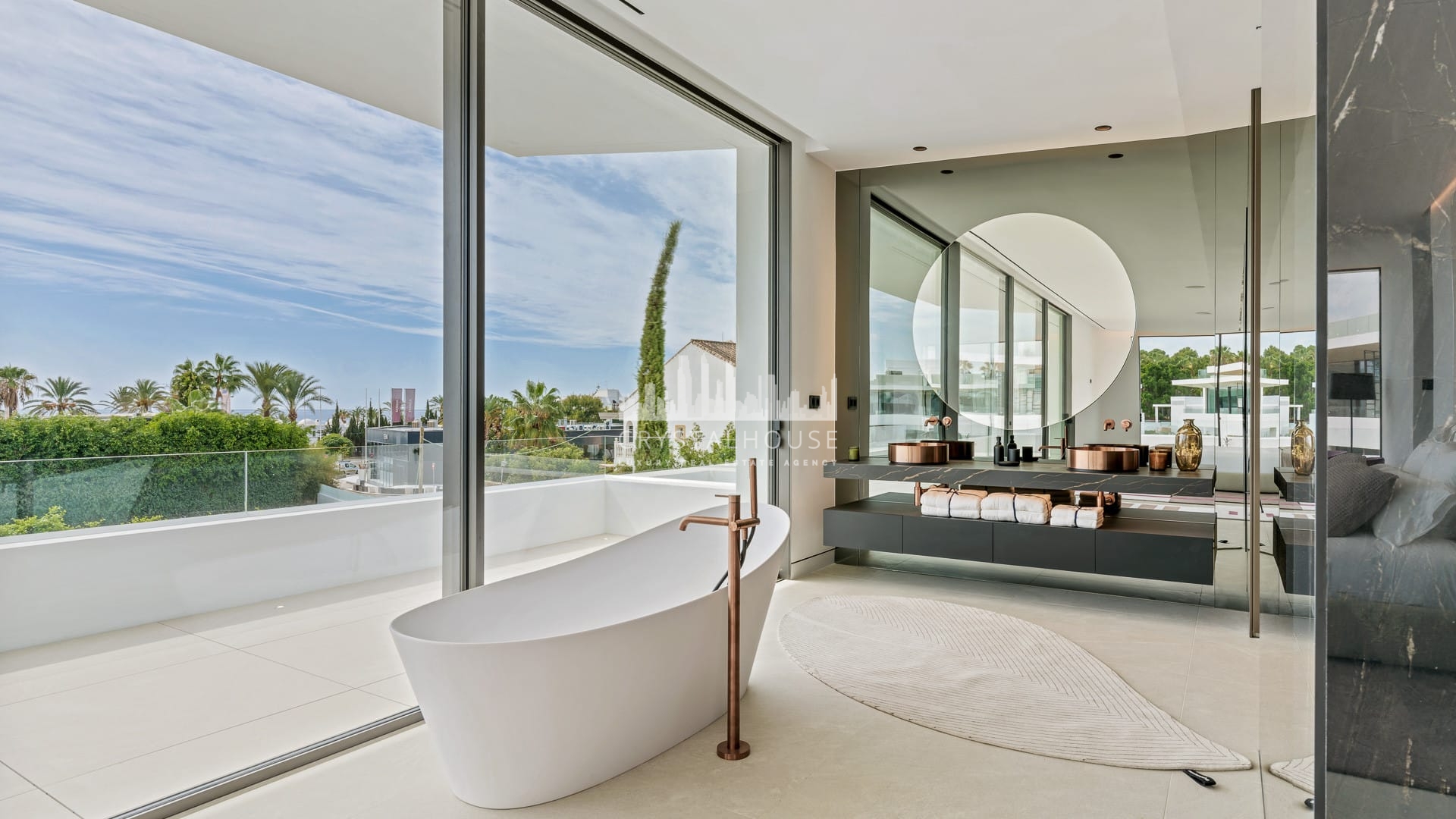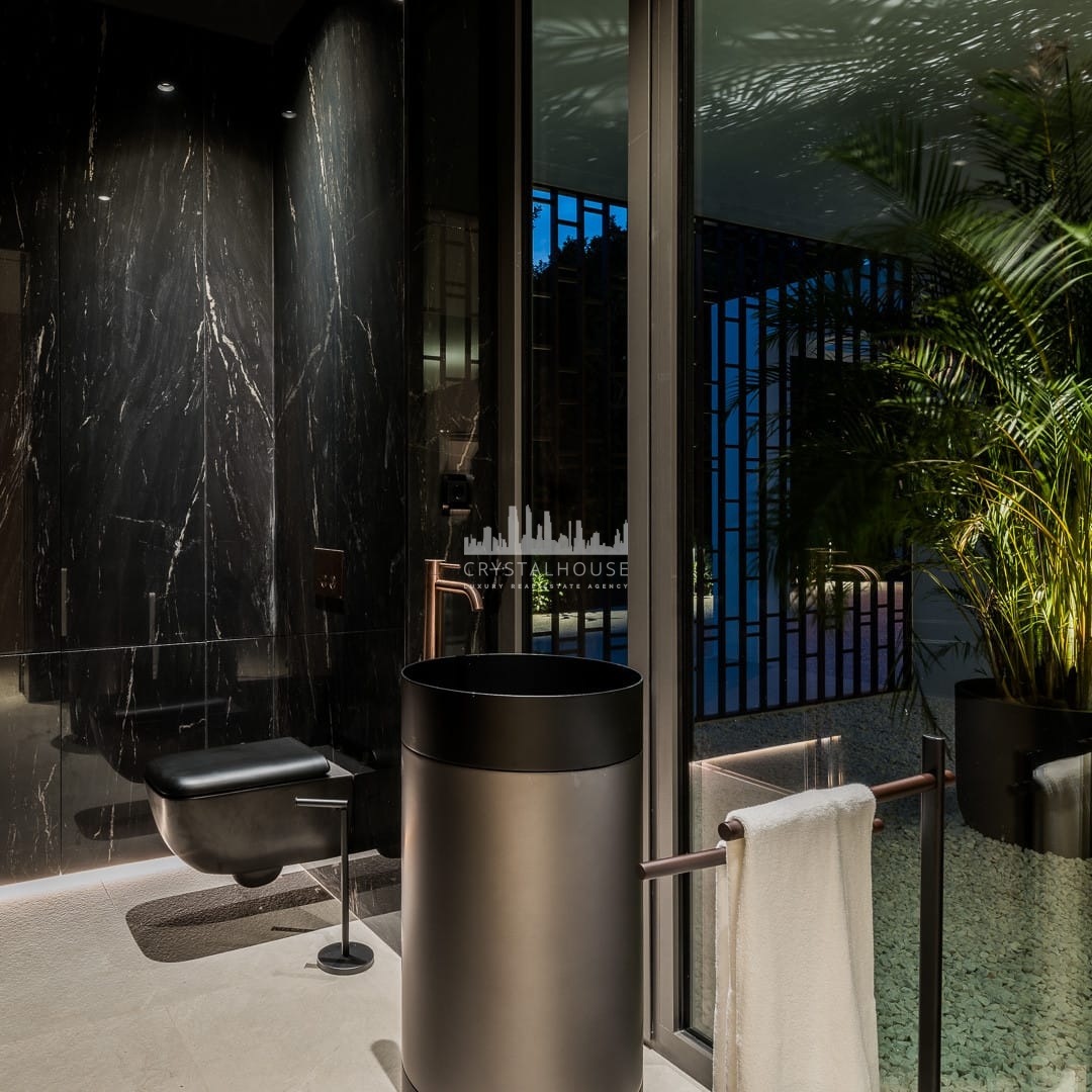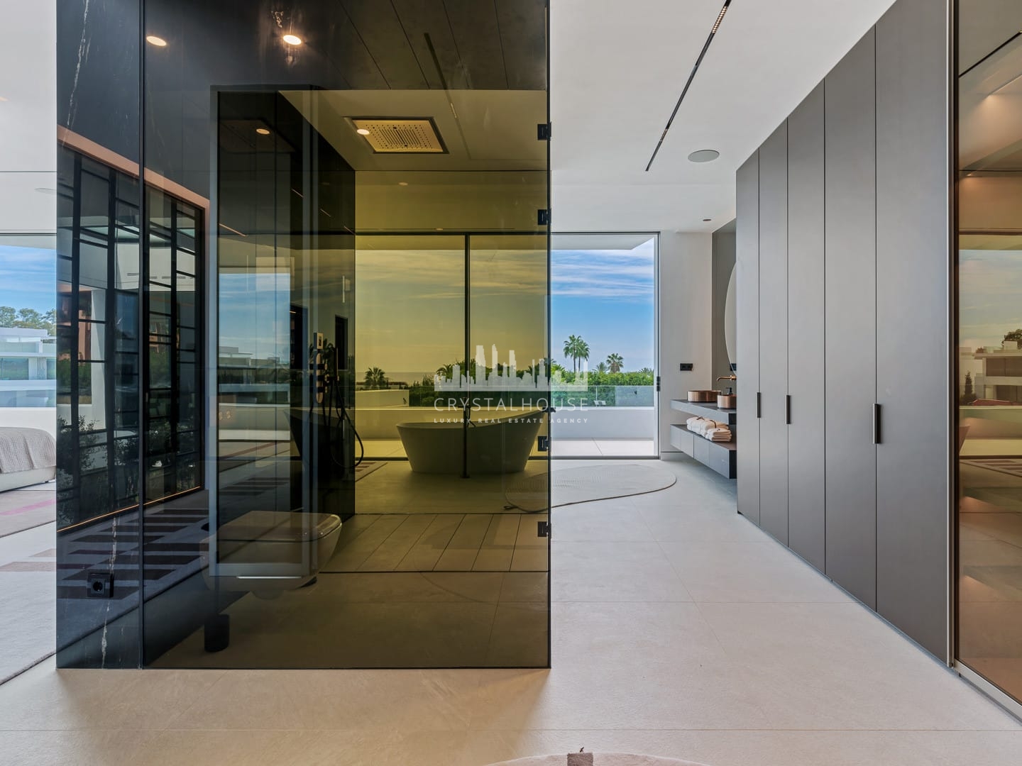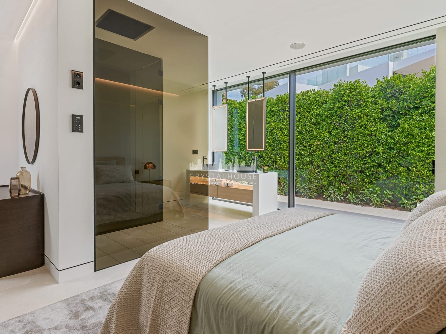 The villa comprises 5 spacious en-suite bedrooms and one guest toilet. The master suite features a walk-in closet, sea views, and a spa-like bathroom. Large glass walls flood every room with natural light and open to panoramic views of the Mediterranean and La Concha mountain.