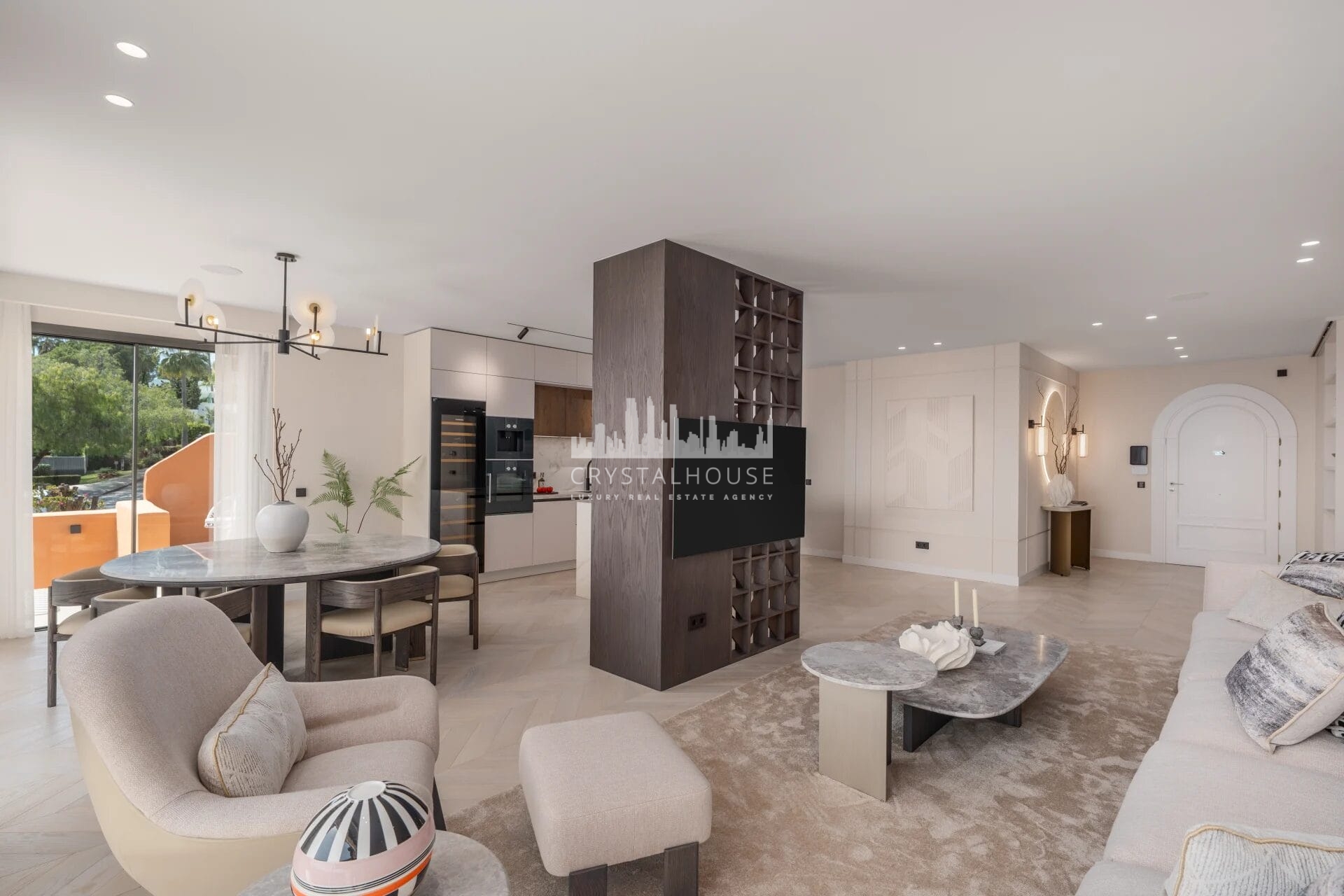 With meticulous attention to detail, the property has been fully upgraded to meet the highest standards, featuring spacious living areas, high-end finishes, and panoramic views of the surrounding area.nnThe apartment boasts two luxurious master ensuite bedrooms, each designed with elegance and privacy in mind. These spacious retreats offer ample wardrobe space and sleek contemporary bathrooms.nnThe open-concept living space is perfect for entertaining or relaxing with family and friends. Large windows flood the apartment with natural light and frame the stunning views of the nearby golf courses, mountains, and Mediterranean coastline. The expansive living room leads seamlessly into a modern kitchen, equipped with top-of-the-line appliances, custom cabinetry, and a large island that serves as the heart of the home. The dining area provides ample space for hosting gatherings, while the sleek design of the apartment complements its surrounding natural beauty. The other two bedrooms are generously sized and share access to a stylish guest bathroom, ensuring comfort for family or visiting guests.nnAdditional features include designer flooring, and integrated smart home technology that allows you to control lighting, climate, and security from the palm of your hand. The apartment also includes an extensive private terrace where you can enjoy outdoor dining or simply relax and soak in the stunning views.nnResidents of Les Belvédères enjoy an exclusive and peaceful environment, with 24-hour security, lush communal gardens, communal swimming pool, gymnasium and tennis courts. Just a short drive from the vibrant heart of Marbella, this apartment offers the perfect balance of privacy, luxury, and convenience, placing you close to world-class amenities, fine dining, shopping, and entertainment.