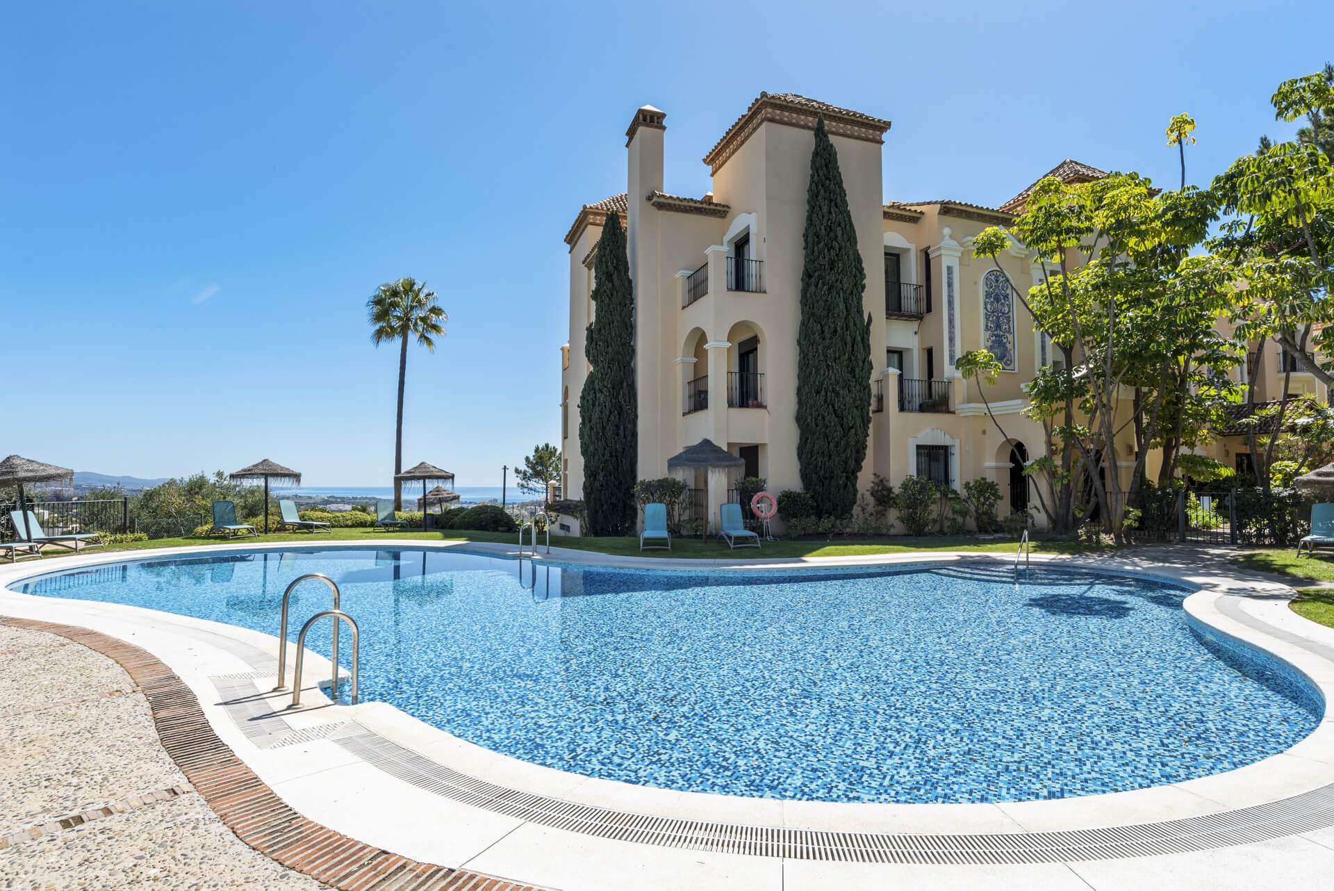 Step into this exclusive gated community, where a dedicated doorman is on duty 12 hours a day, providing peace of mind and a secure environment. The beautifully maintained communal areas feature expansive green spaces and a large swimming pool, perfect for relaxing and enjoying the Mediterranean lifestyle.