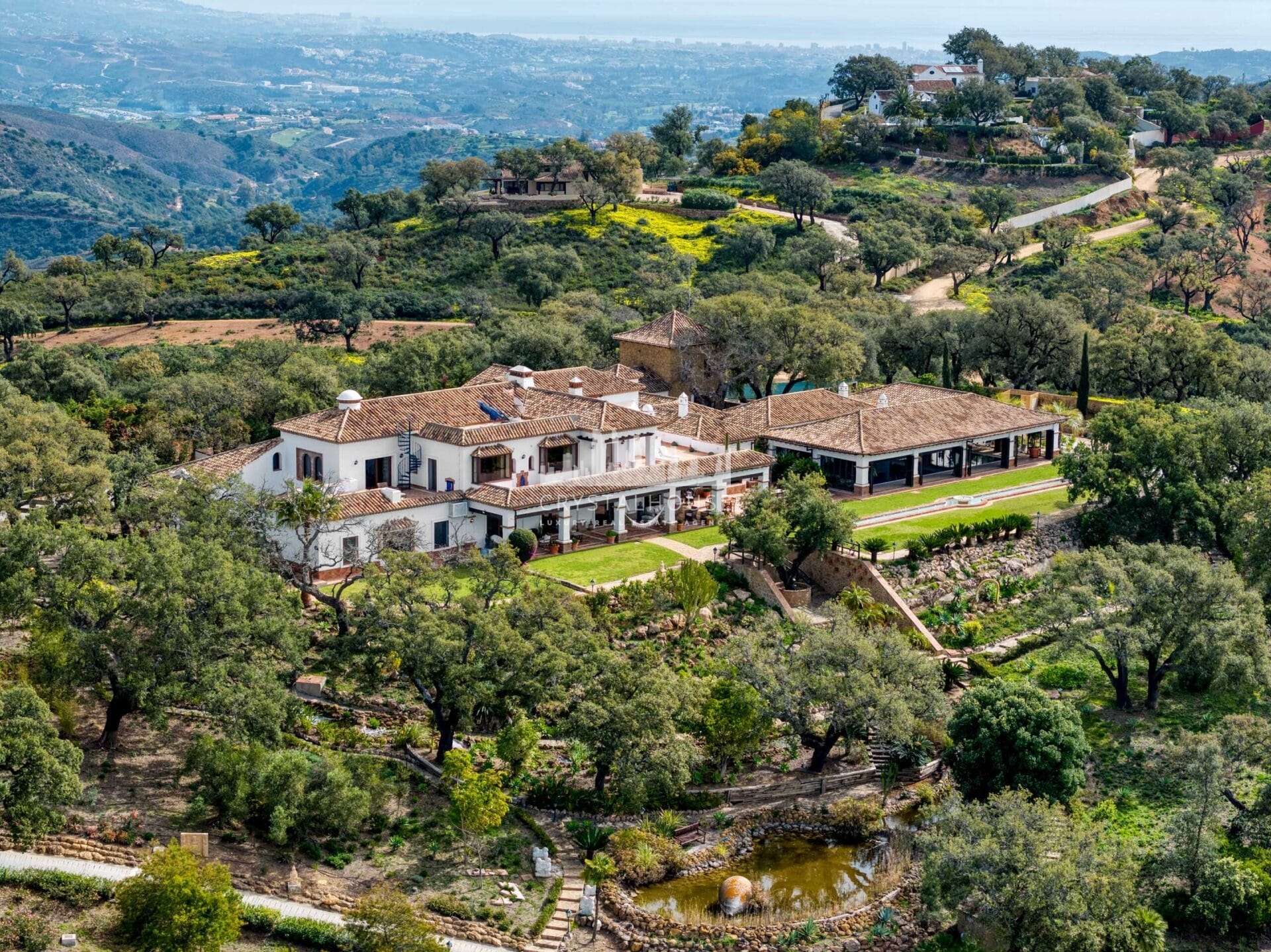 The property is surrounded by an impeccably maintained garden, with fruit trees, mature plants, ponds, graceful fountains, sculptures and serene water features. Besides, there is a small house offering panoramic 360-degree views, serving as a dedicated space for painting or hobbies.