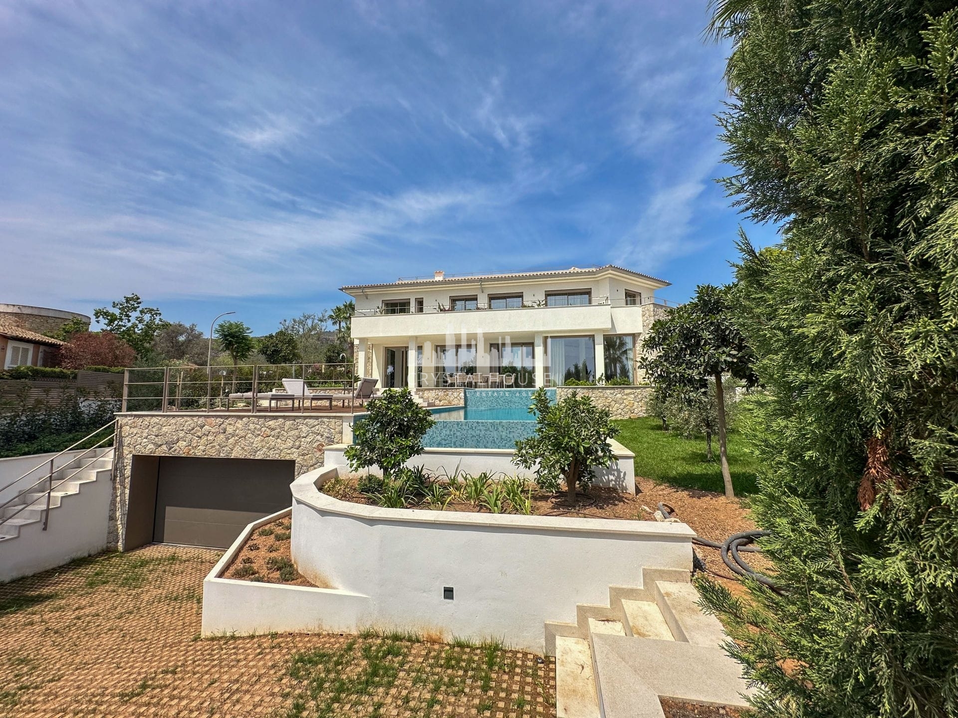 The outdoor area is a true highlight, featuring a private swimming pool that invites you to unwind and enjoy the Mediterranean climate. The villa also includes a garage with space for up to four cars, equipped with electric charging points, and additional parking spots outside, ensuring convenience for residents and guests alike.