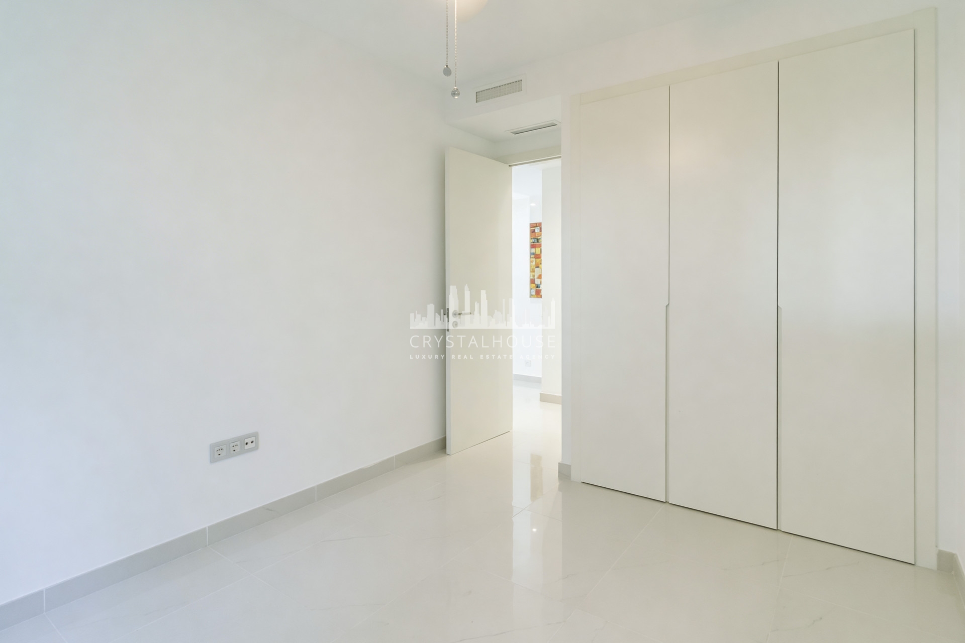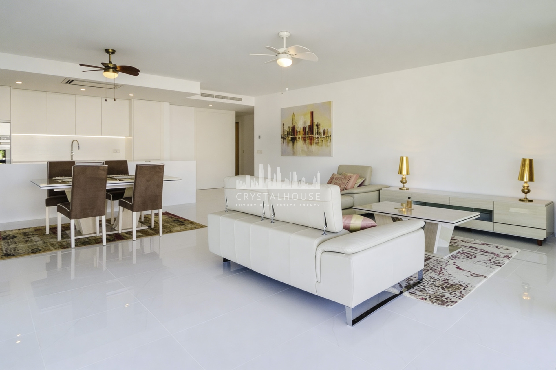 * Stylish minimalist architectural appearance with white ceramic tiles, white fitted wardrobes, white kitchen island and bathrooms