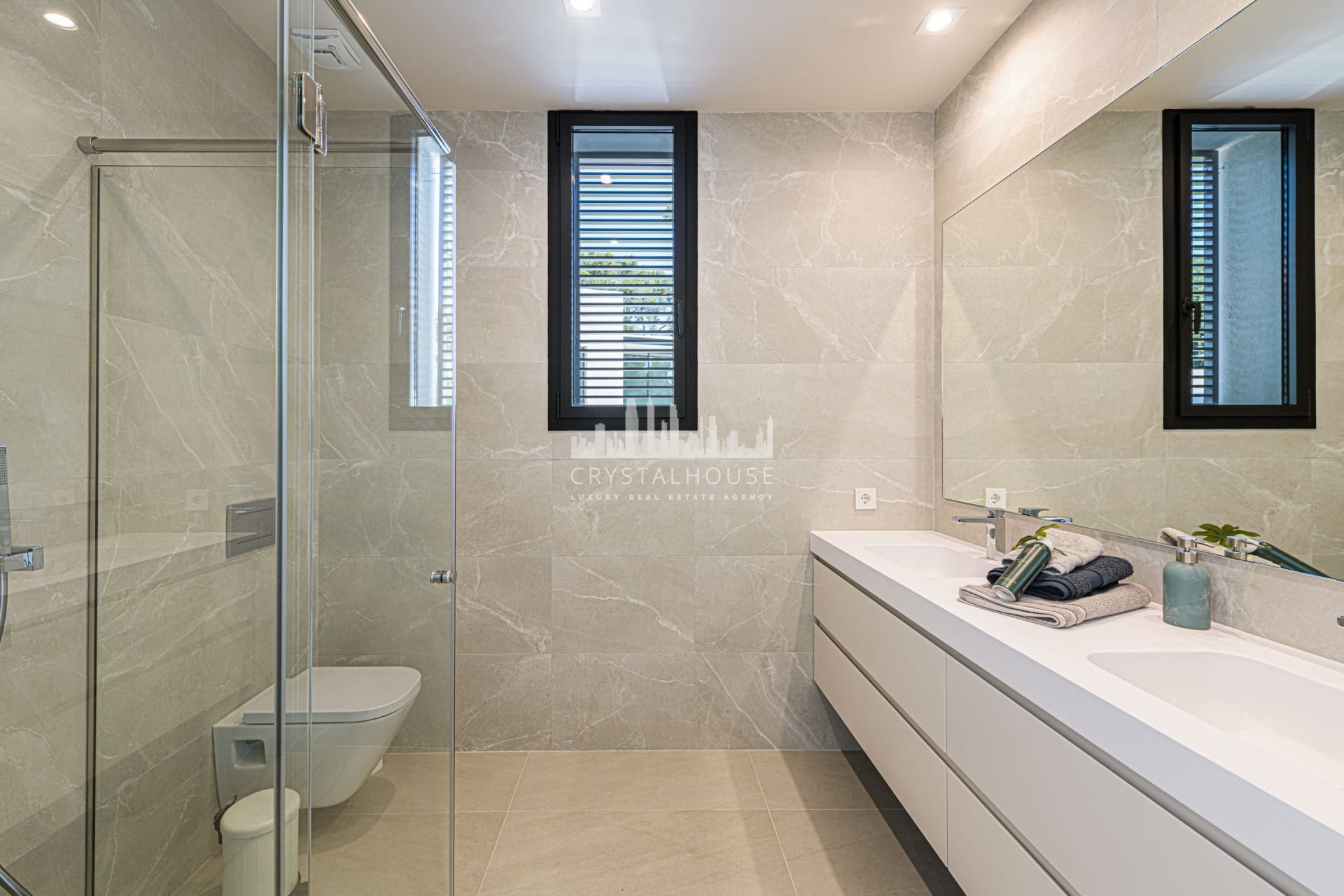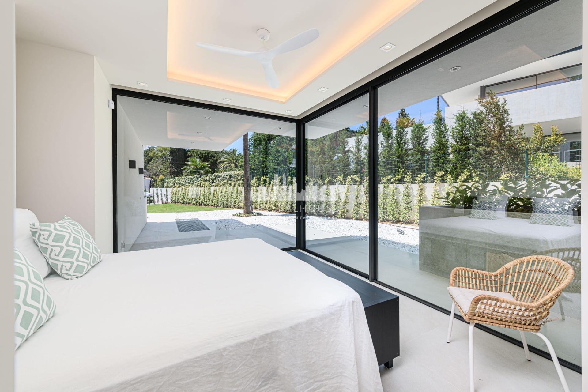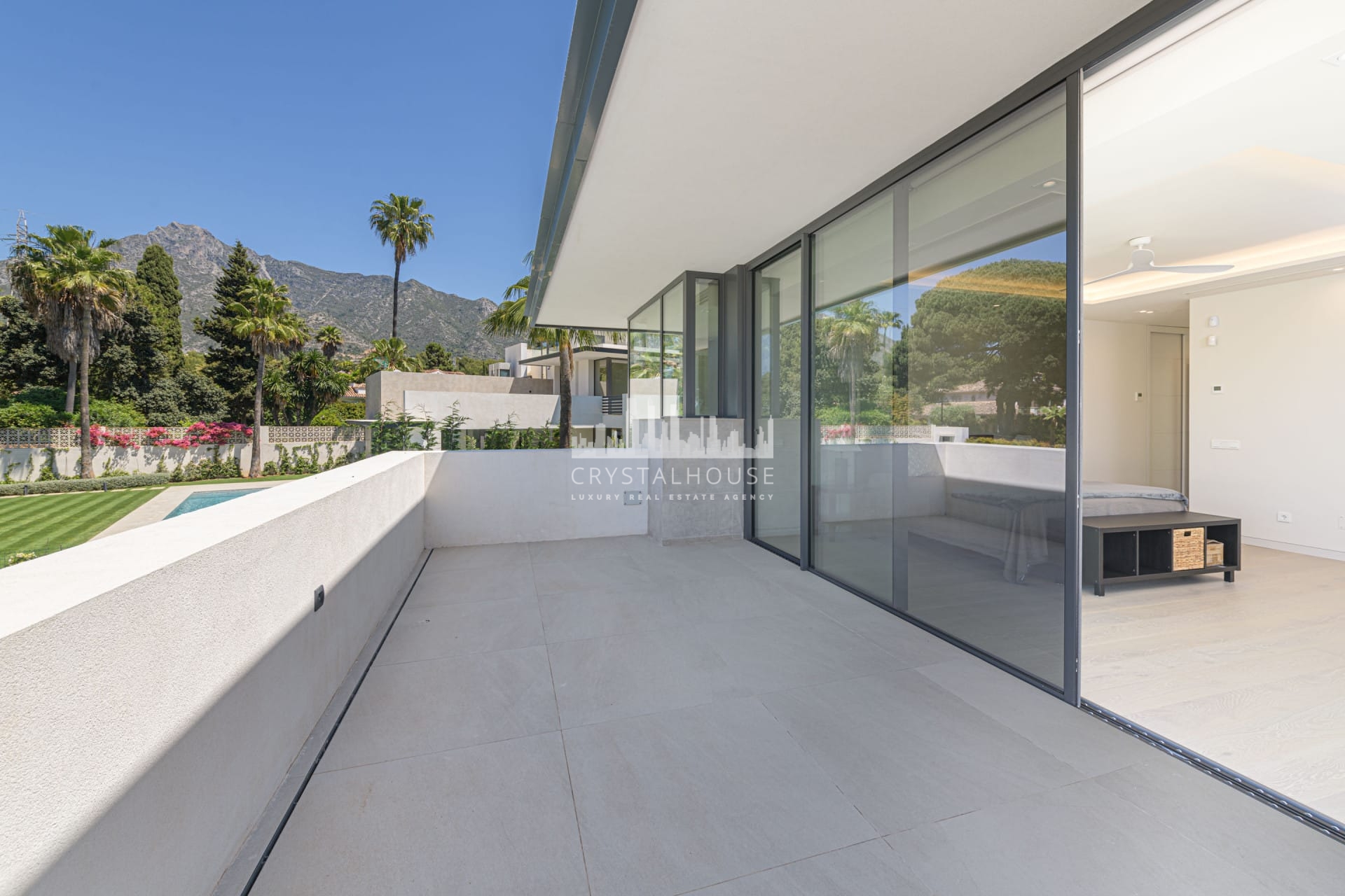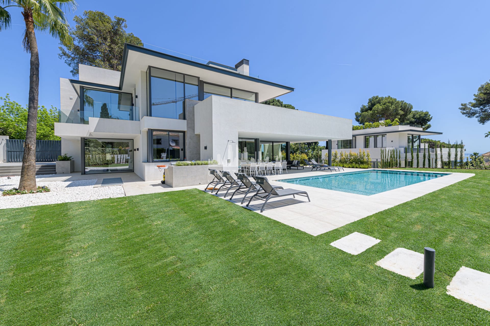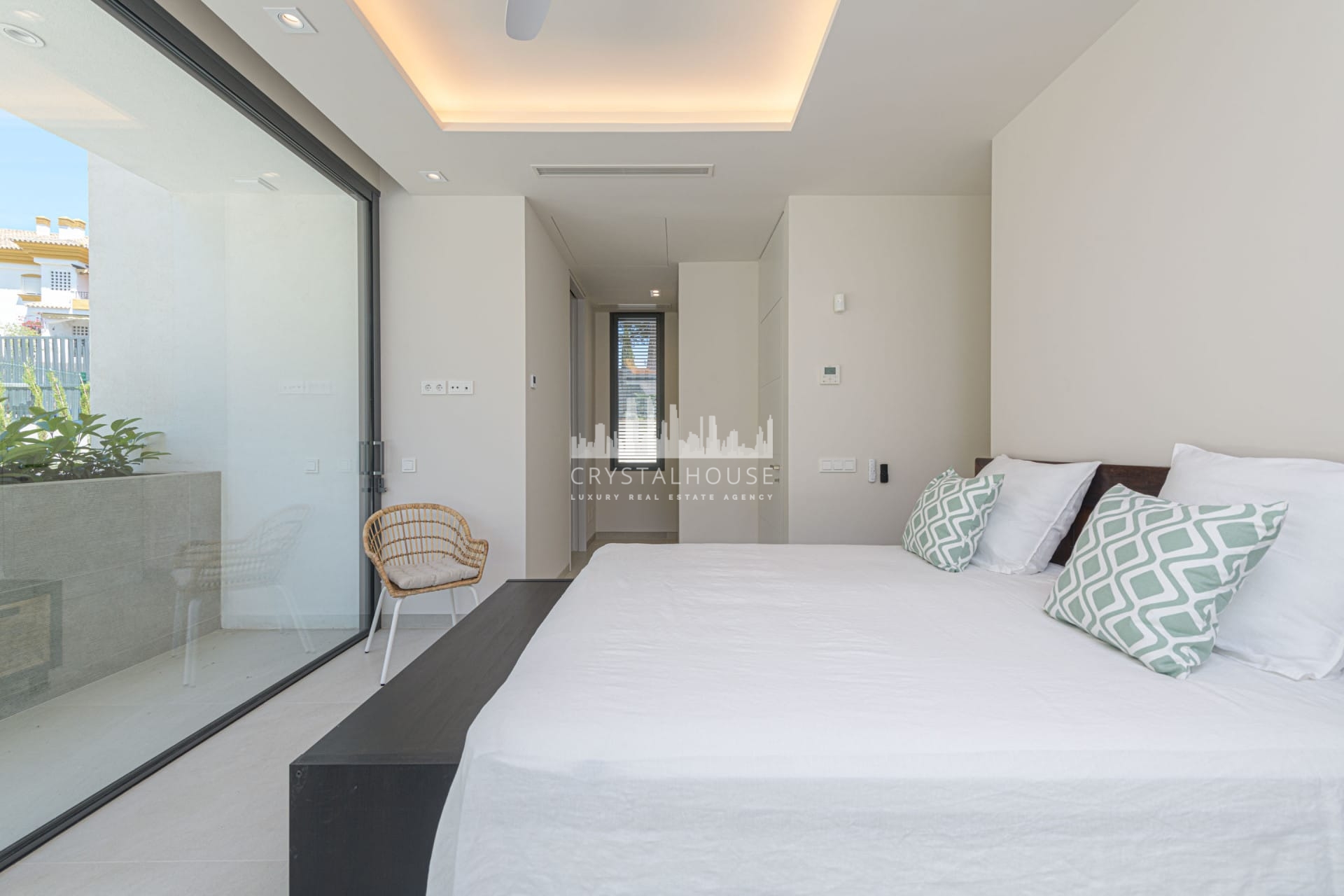 Brand-new modern villa for sale in La Carolina, Marbella with 5 bedrooms, 6 bathrooms, and 1 guest toilet. This magnificent villa is built over 3 levels, including a basement where you can find the oversized garage and gym area.