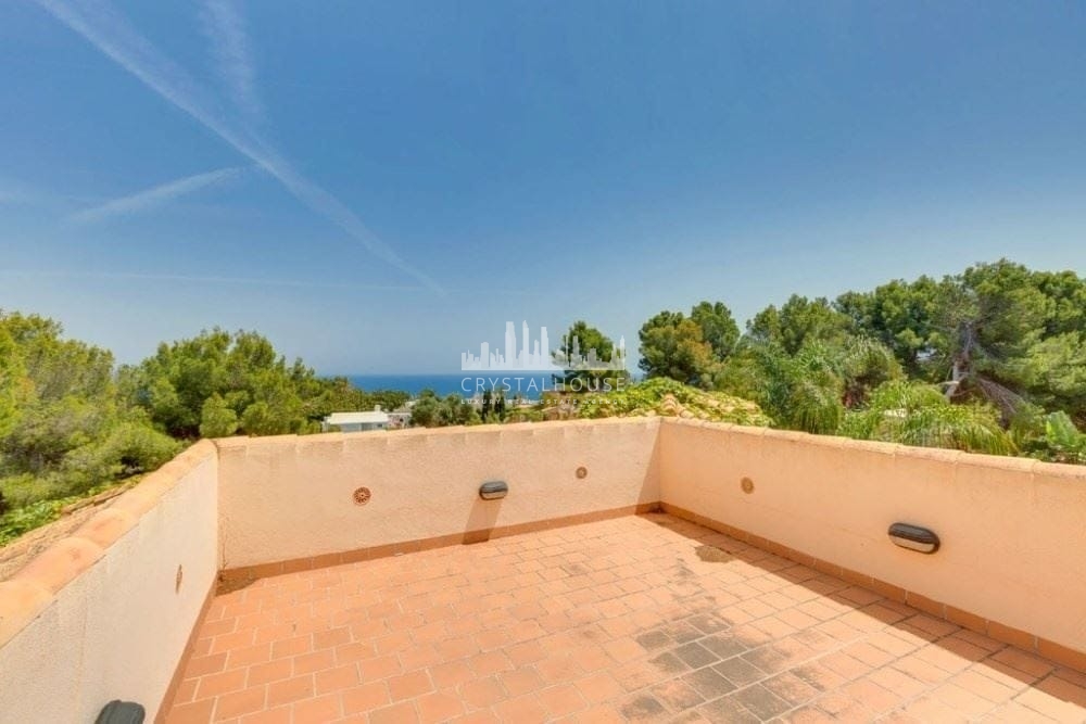 Bright luxury villa in Sol de Mallorca, quiet residential area close to the sea. The house has a built area of 690 sqm with 1.600sqm land. The distribution of the house is as follows: The basement has gymnasium, with large window to view underwater pool, garage for 3 cars, machine room and 3 storage rooms, and dumb waiter for wood. The ground floor has a bright openplan lounge/dining room with chimney, fully fitted kitchen with ample cupboard space, seperate bedroom and shower room, laundry and office. First floor leads from impressive wooden winding staircase to 4 bedrooms ensuite with terrace overlooking pool and the bay.( master bedroom with walk in dressing area, bathroom ensuite with large shower). All over house is piped music and hot&cold air conditioning, alarm, underfloor heating, Outside is a covered terrace with built in BBQ by 12x6mtr. pool and lots of outside storage and parking.