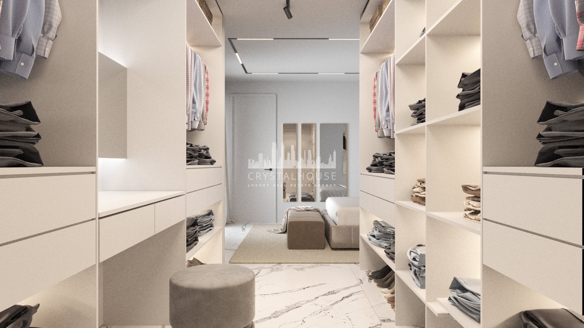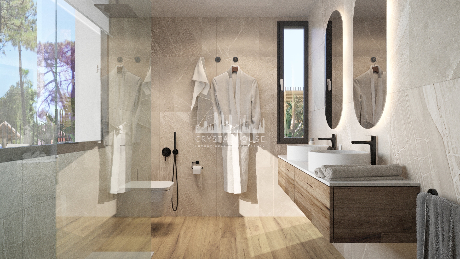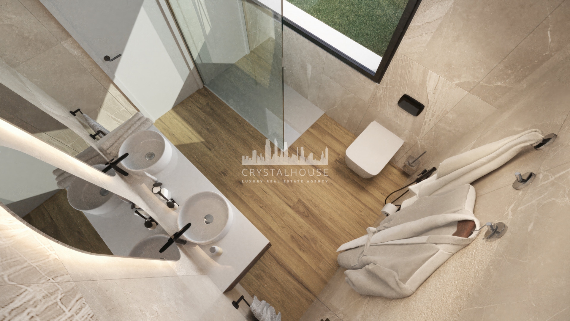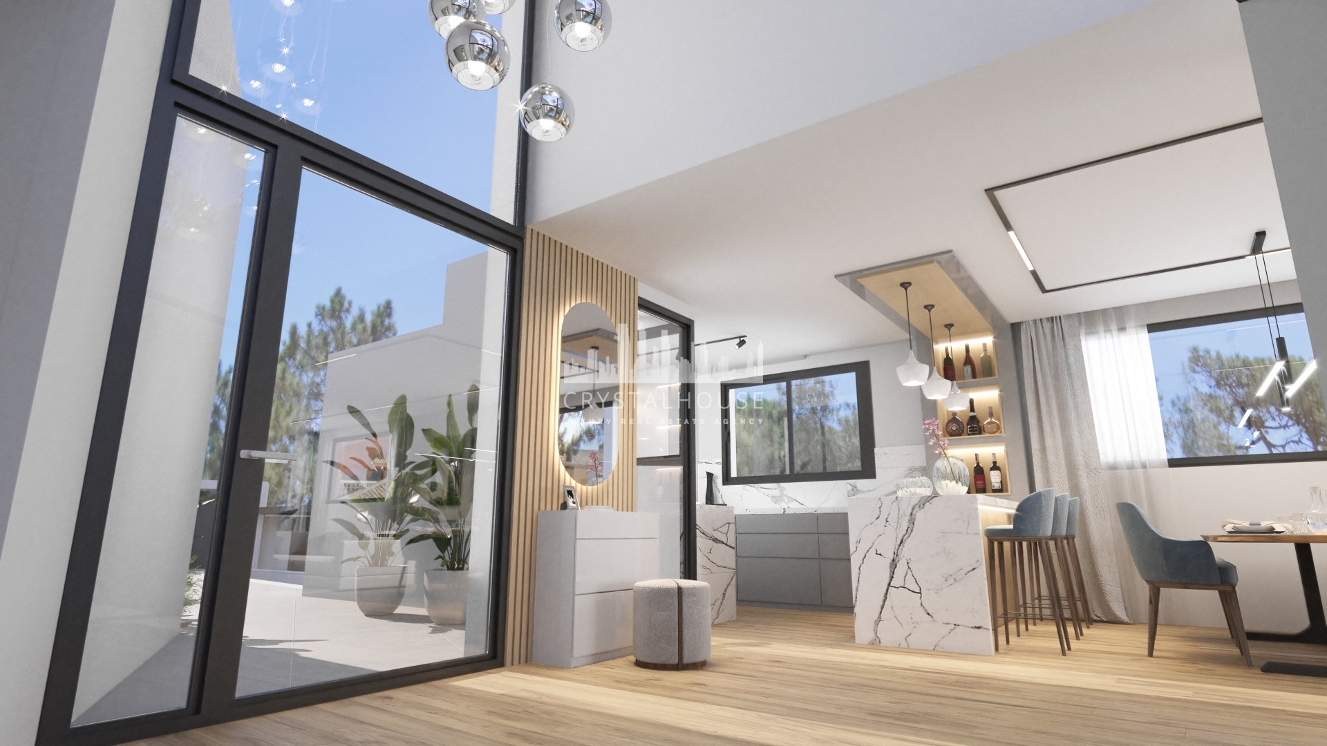 The villa’s interior is equally as impressive. The master bedroom boasts a spacious walk-in closet, providing ample storage space for your belongings. The open-plan living room seamlessly connects to the kitchen and dining area, making it the heart of the home. A cozy fireplace adds a touch of warmth to the space, while large, glass, sliding doors lead out to the terrace, creating a harmonious indoor-outdoor living experience.