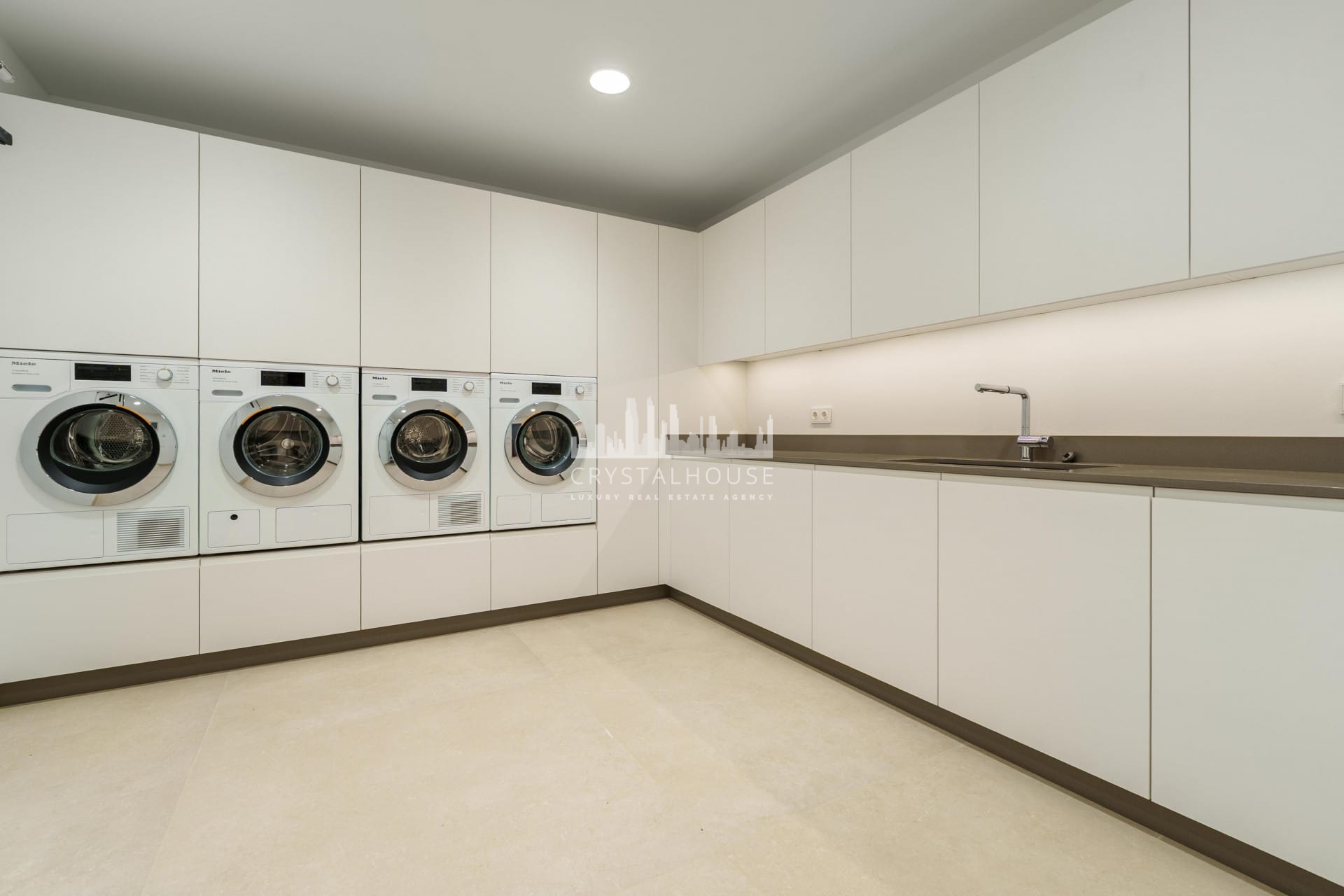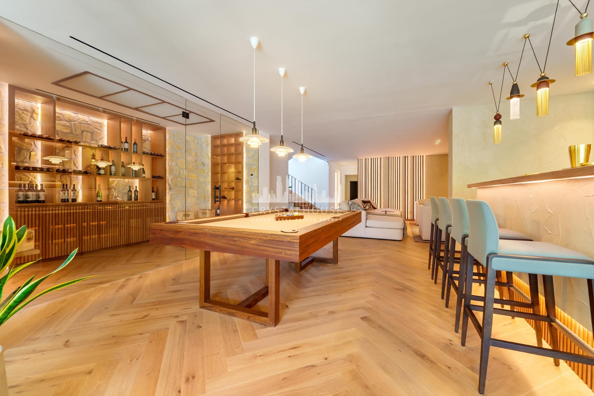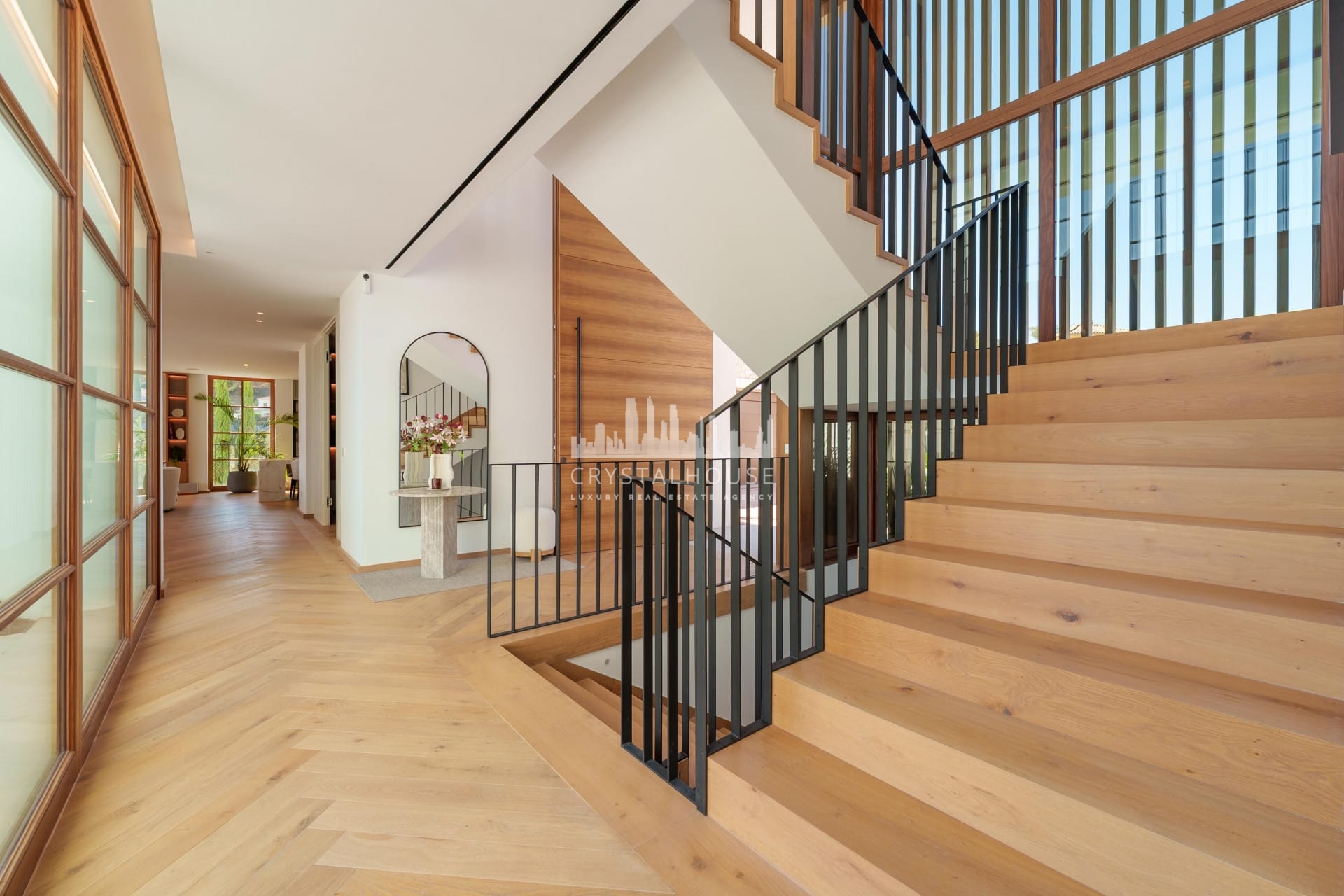 The lower levels house an entertainment wing with billiards, TV lounge, gym, wine cellar, massage room, three guest toilets, a four-machine laundry, and a private elevator for seamless access. Underfloor heating, individually controlled A/C, and smart home integration (Apple HomeKit & Lutron) ensure year-round comfort.