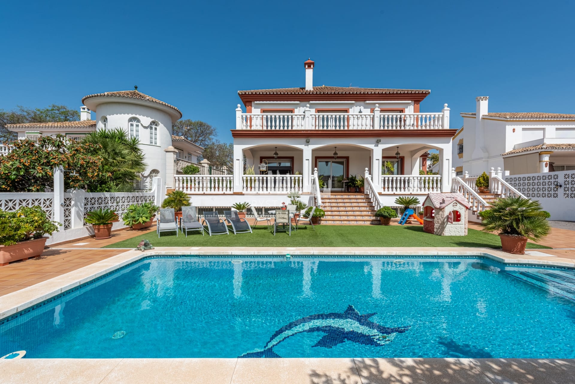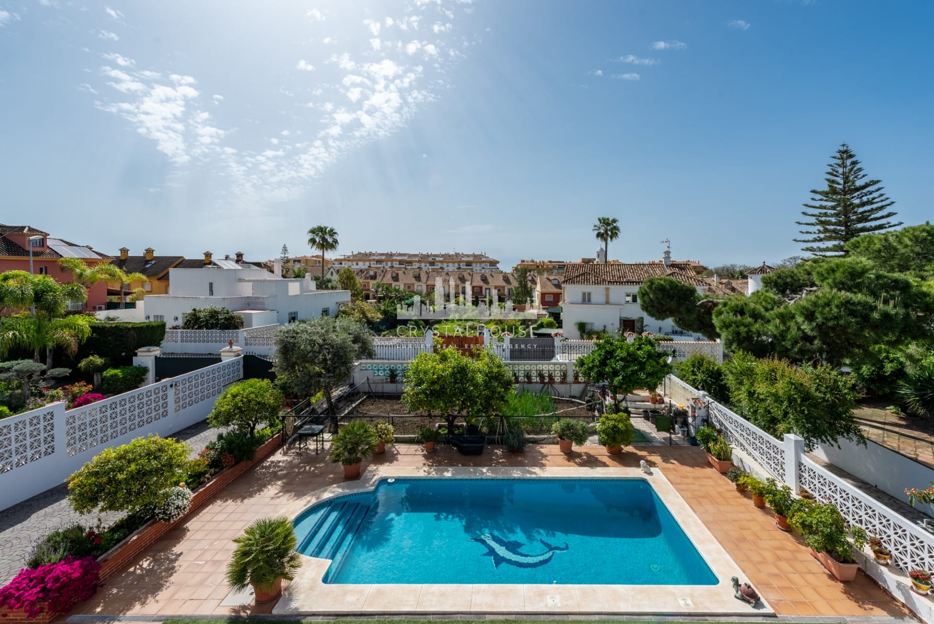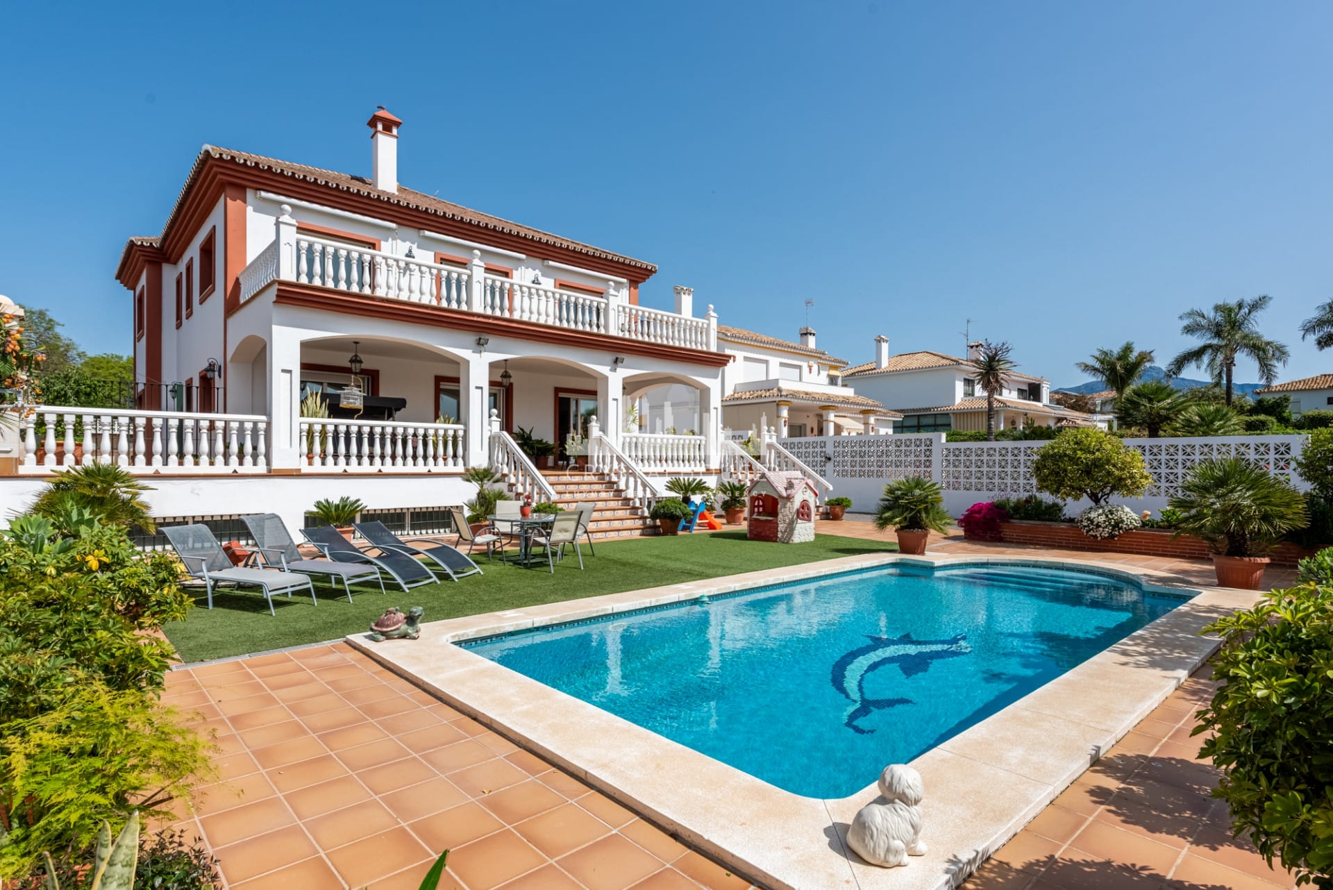 Tradycyjne materiały, takie jak solidne drzwi z sosny, terakota na gankach oraz marmurowe podłogi we wnętrzach, podkreślają ponadczasowy andaluzyjski charakter willi.