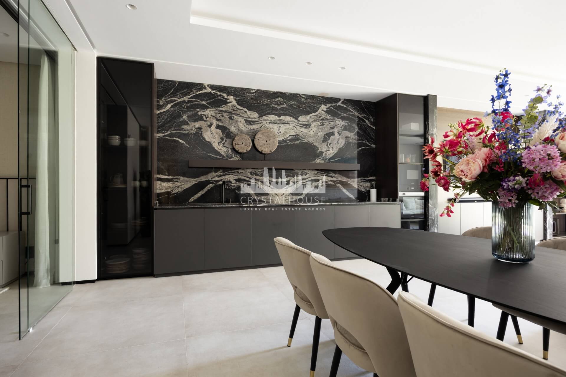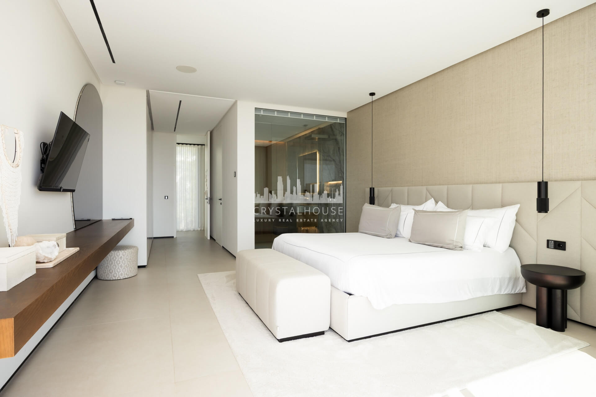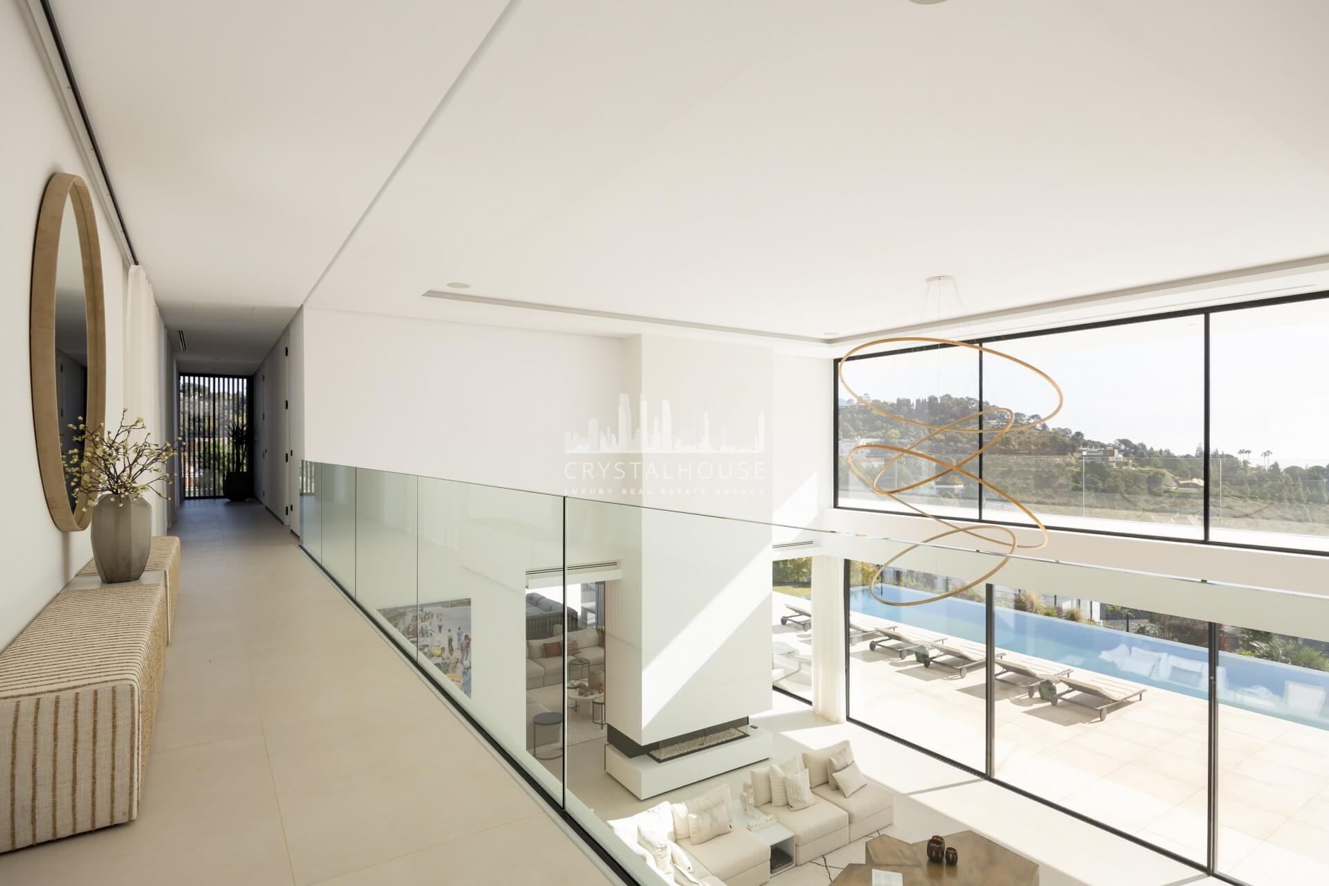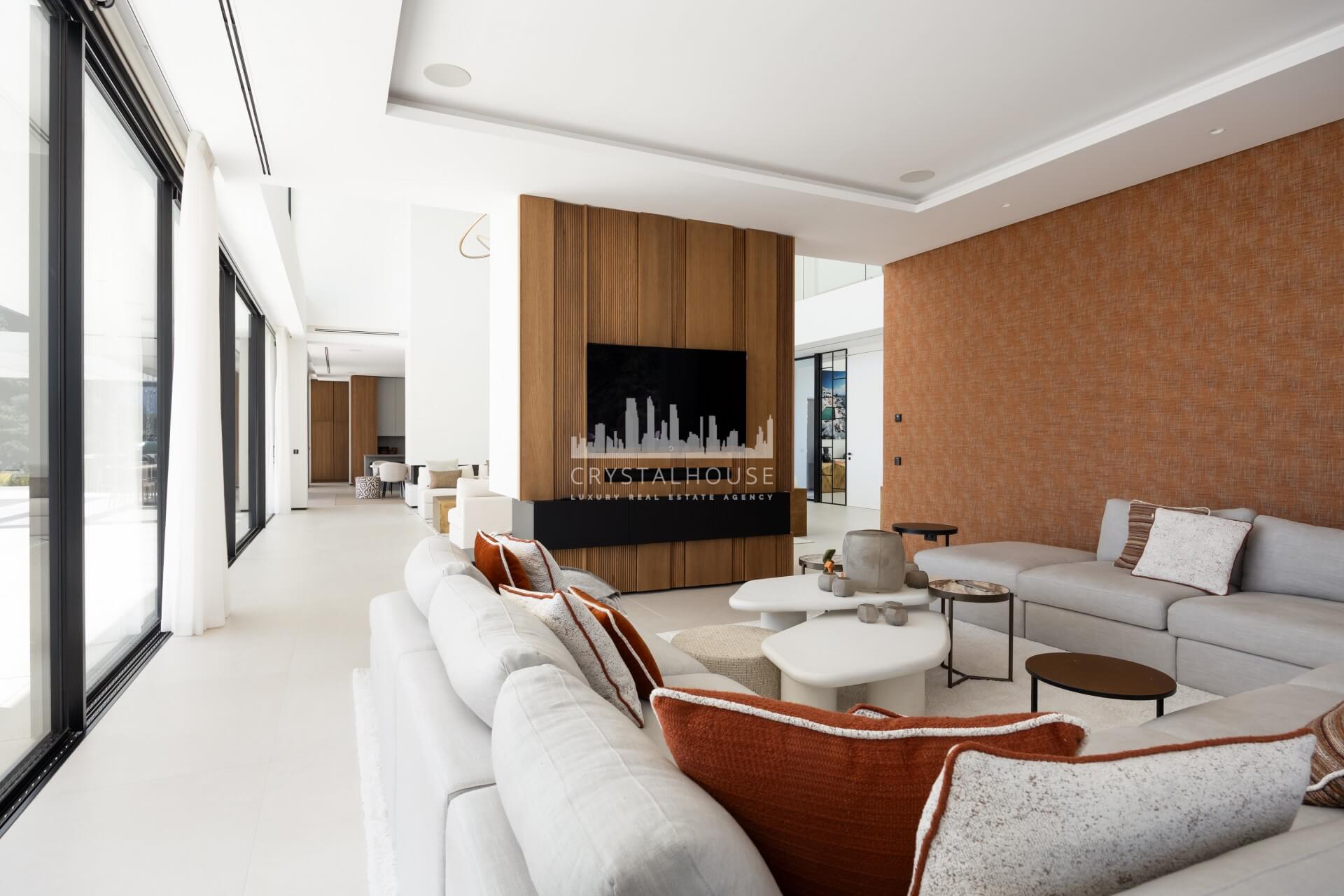 Thoughtfully designed to embrace its surroundings, the villa centers around a light-filled open-plan living space where panoramic mountain and sea views take focus. A striking entrance leads into a spectacular double-height living area, seamlessly connected to an elegant lounge, formal dining space, and a sleek designer kitchen. A beautifully appointed guest suite completes this level. Expansive floor-to-ceiling windows open onto generous terraces and a stunning infinity pool, creating a seamless indoor-outdoor flow and allowing the views to be enjoyed from every angle.