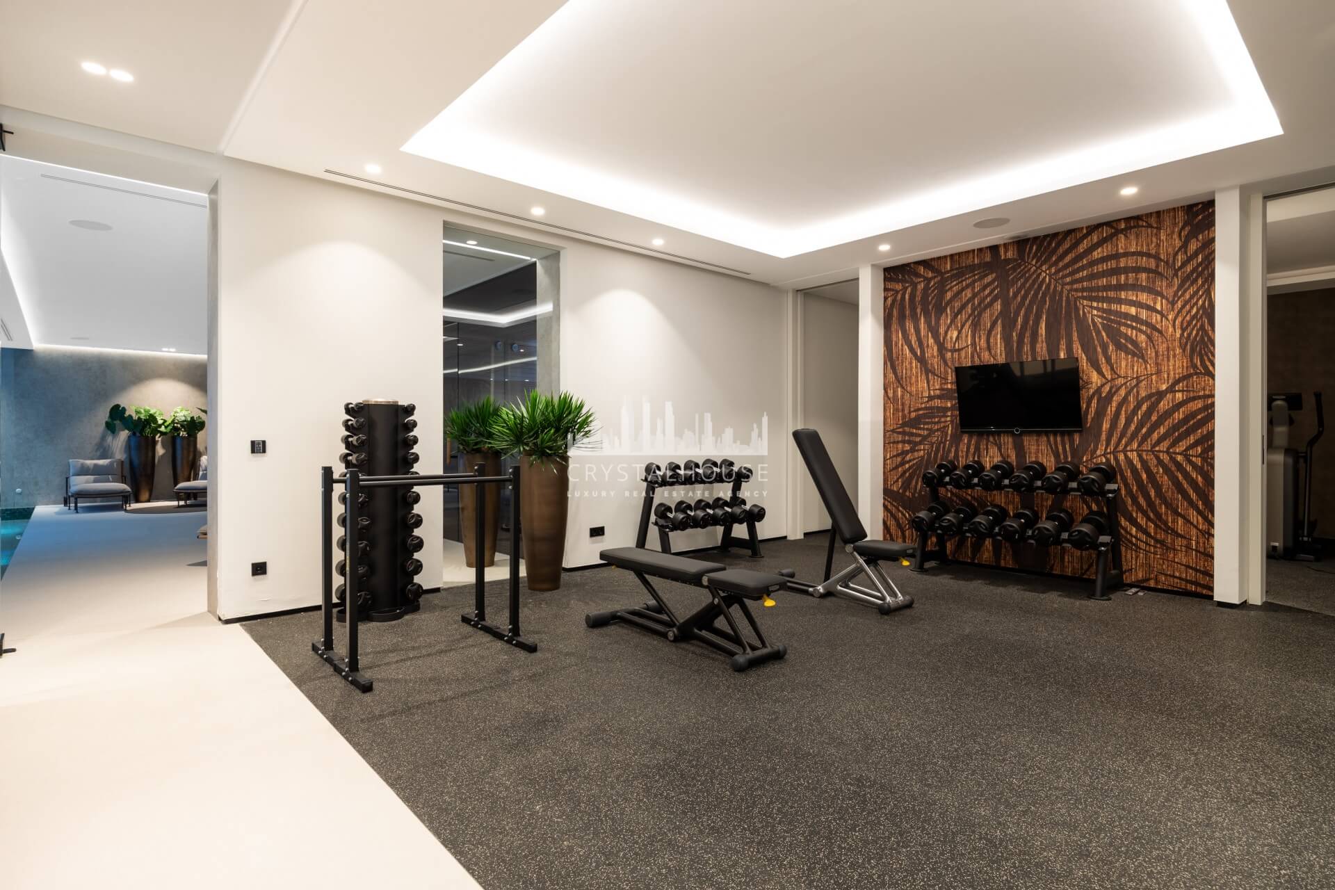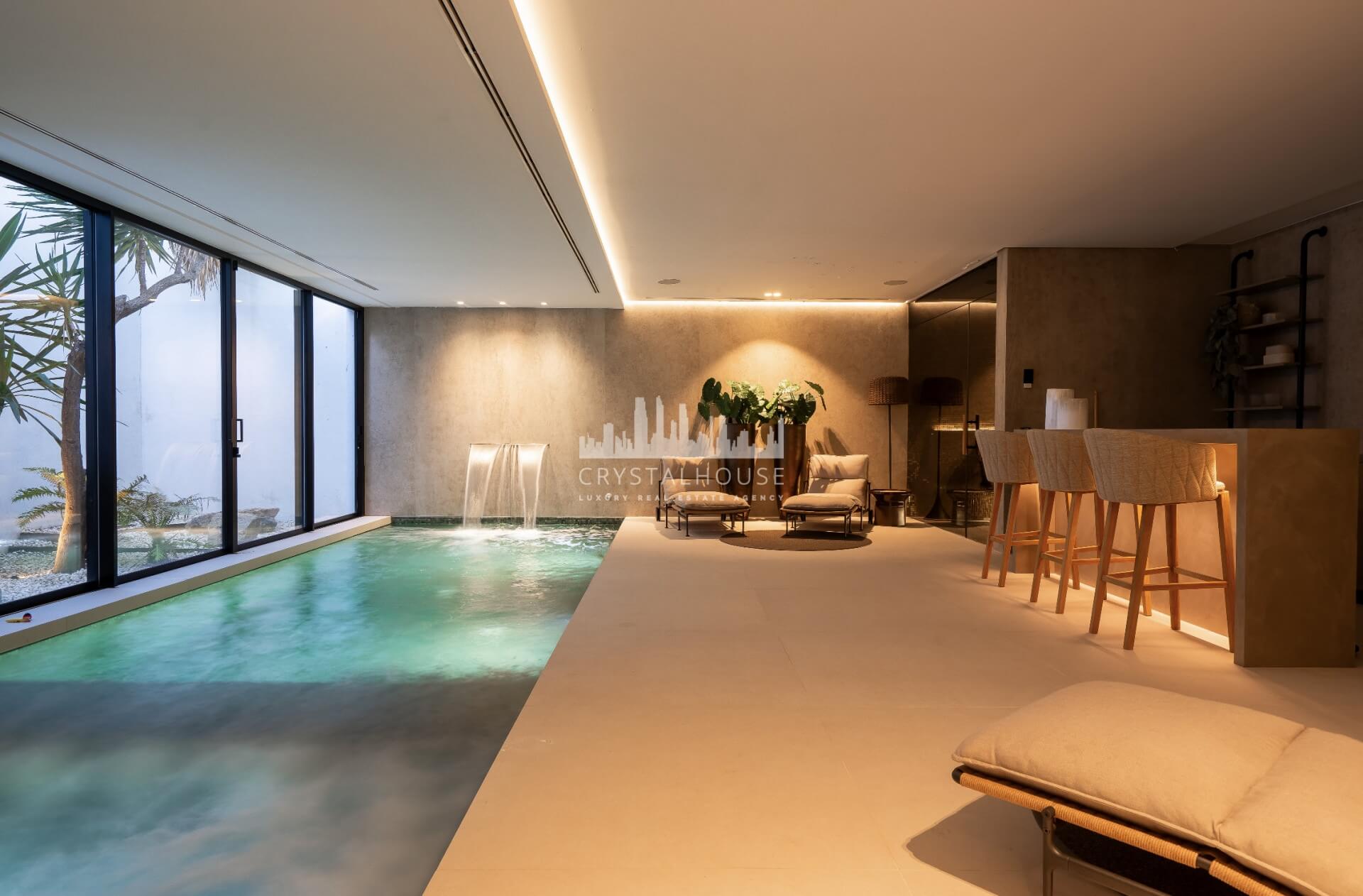 The lower level is designed for leisure and wellness, offering an impressive private spa with a heated indoor pool, sauna, hammam, and a fully equipped gym. This floor also features a stylish bar, perfect for entertaining. In addition, there are two further guest suites and a fully self-contained apartment with its own living room, fully equipped kitchen, bedroom, and bathroom—creating a private and versatile space ideal for guests