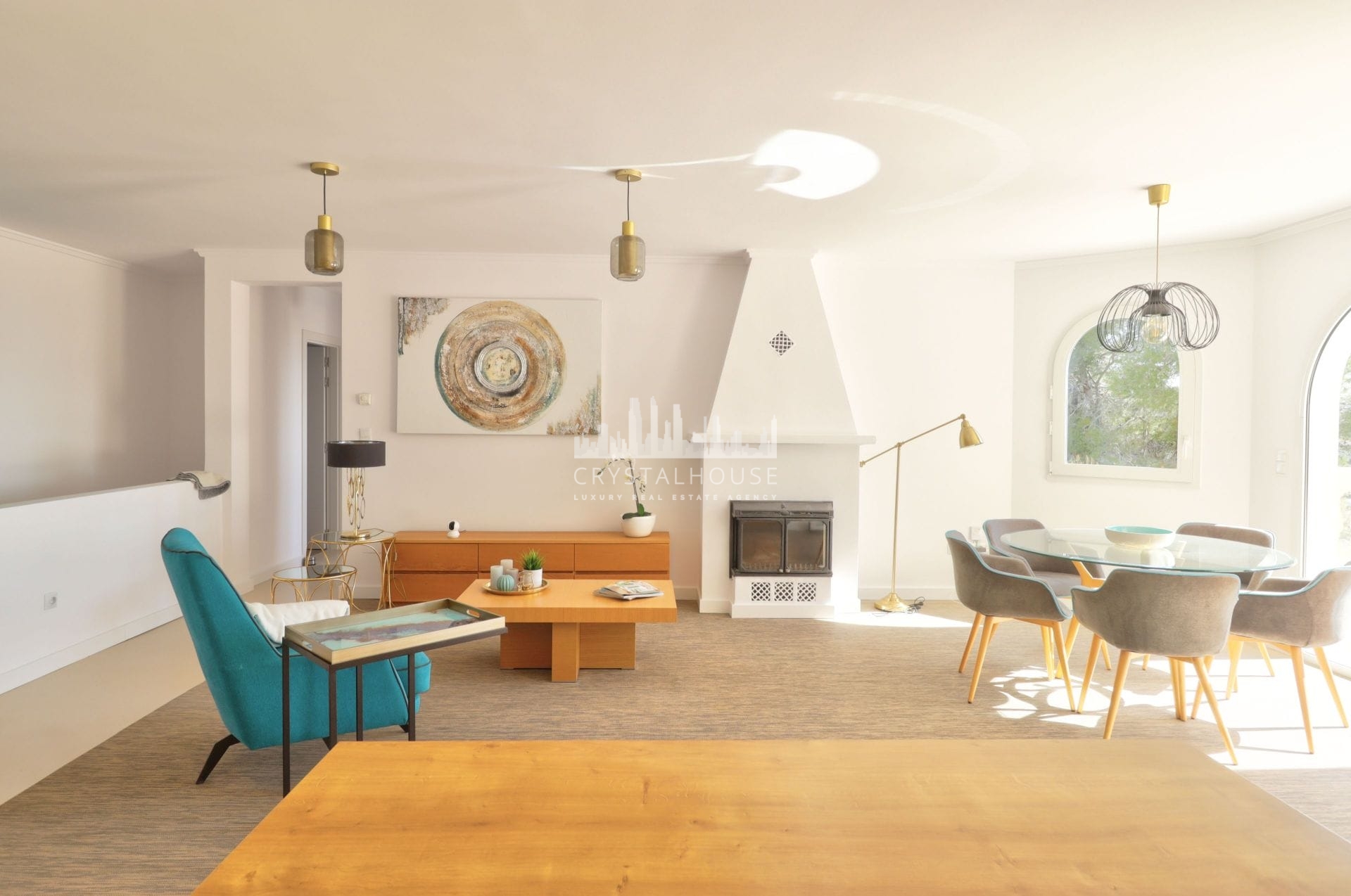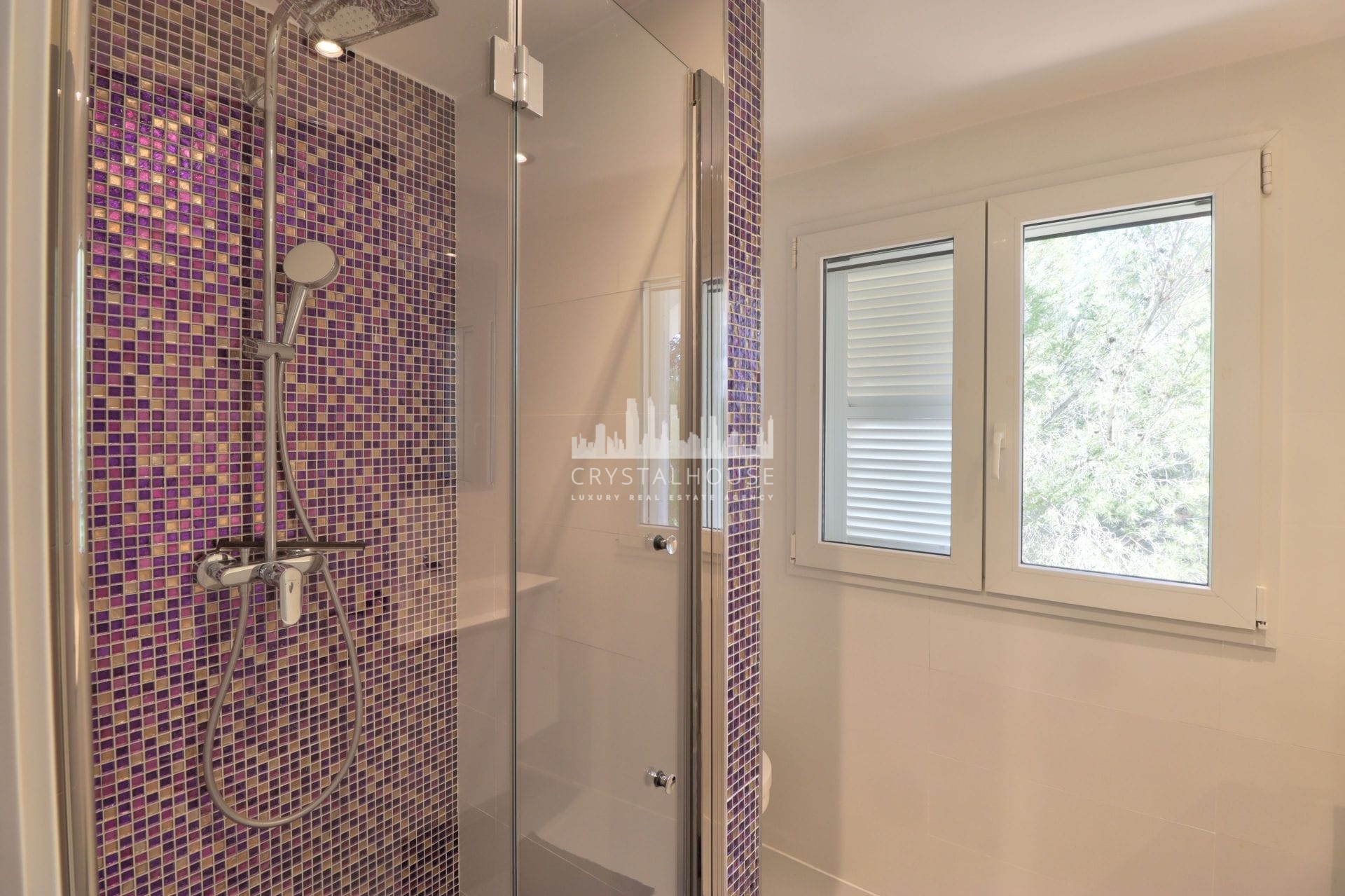 Outdoors, the villa features a private swimming pool surrounded by mature greenery, offering an ideal setting for lounging or hosting guests in complete privacy. The pool area also benefits from sea views, enhancing the property’s relaxing Mediterranean atmosphere.