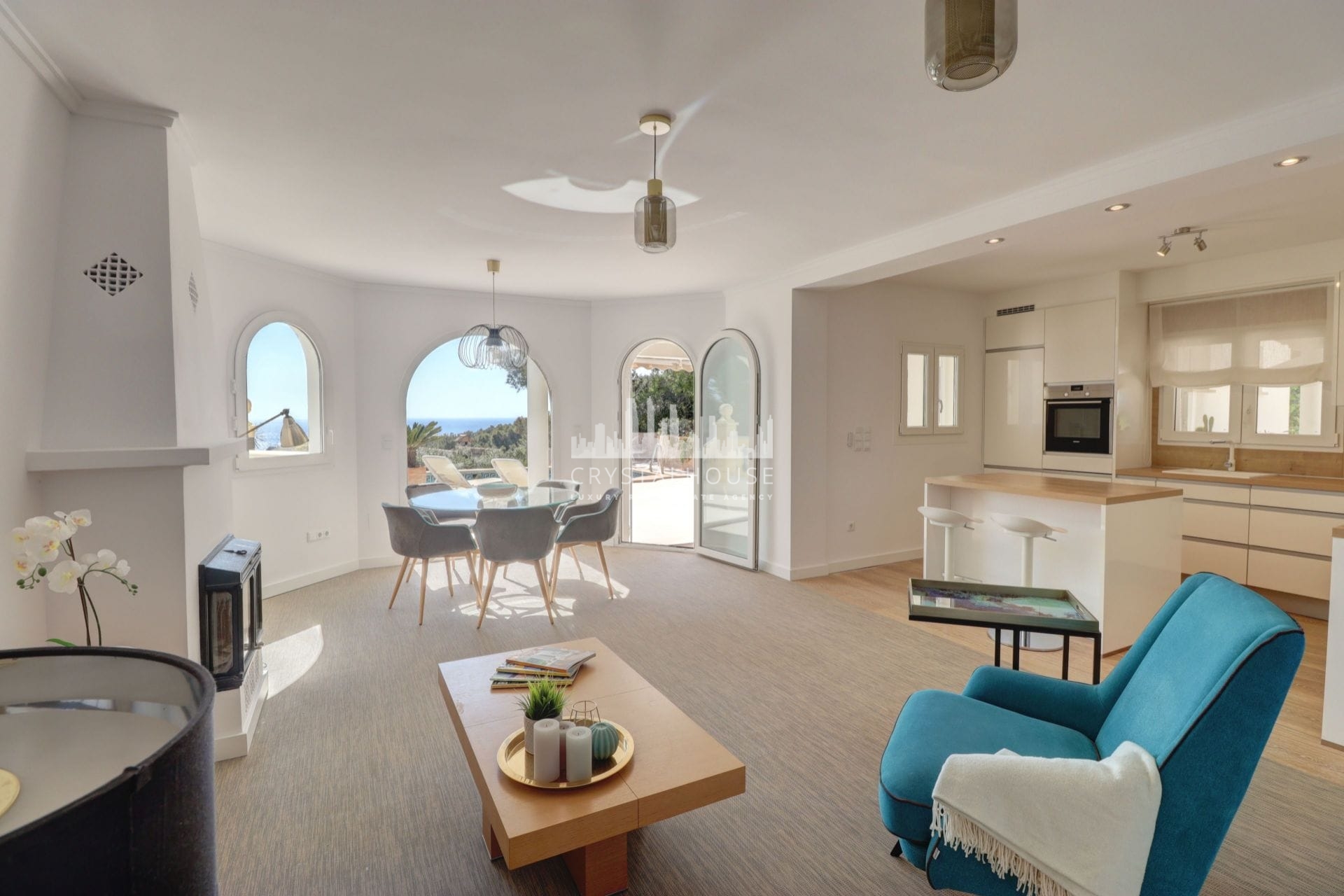 The villa is thoughtfully distributed across two levels, featuring four spacious bedrooms and two bathrooms. Several areas within the property, including the living room, bedrooms, and the poolside terrace, offer stunning views of the sea, while the surrounding mountains create a serene backdrop for daily living. Large windows and an open-plan layout invite natural light into every corner of the home, enhancing its warm and welcoming ambiance.