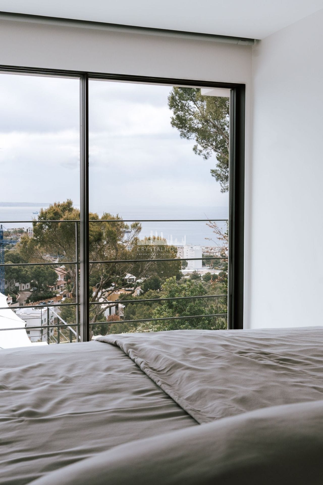 A modern entrance gate takes you to the inner courtyard. A beautiful wooden door takes you to the large living area. This has a spacious and cozy living/dining area with fireplace, an open high-quality kitchen, an office, a guest toilet and a pantry. You can also access the 63m² terrace, from which you can enjoy lovely views over Palma’s bay.
