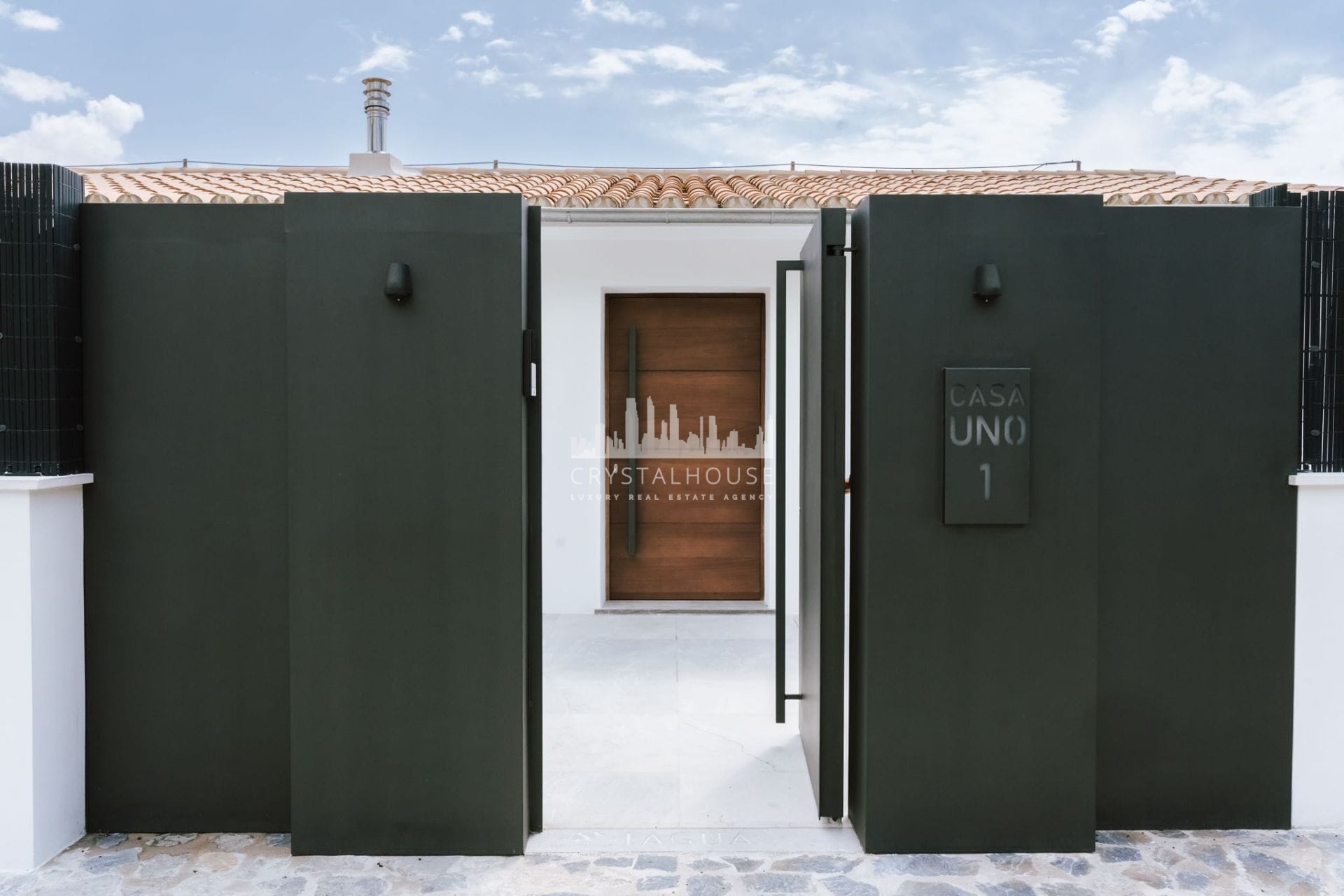 A staircase takes you to the bedrooms. In addition to the sensational sea views and courtyard on this level, the property has three bedrooms. One of them is in the large guest apartment with its own entrance and dressing room. The guest apartment is connected to the master bedroom by a terrace. The master bedroom has its own wardrobe and a splendid en suite bathroom. Next to the master bedroom is the third bedroom. From the courtyard you can reach the pool area with terrace through two stairs (on each side of the house) and from there you can admire the Mediterranean style garden.