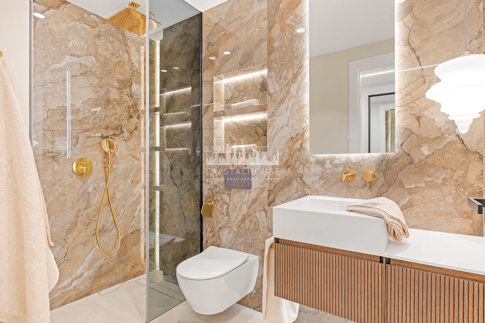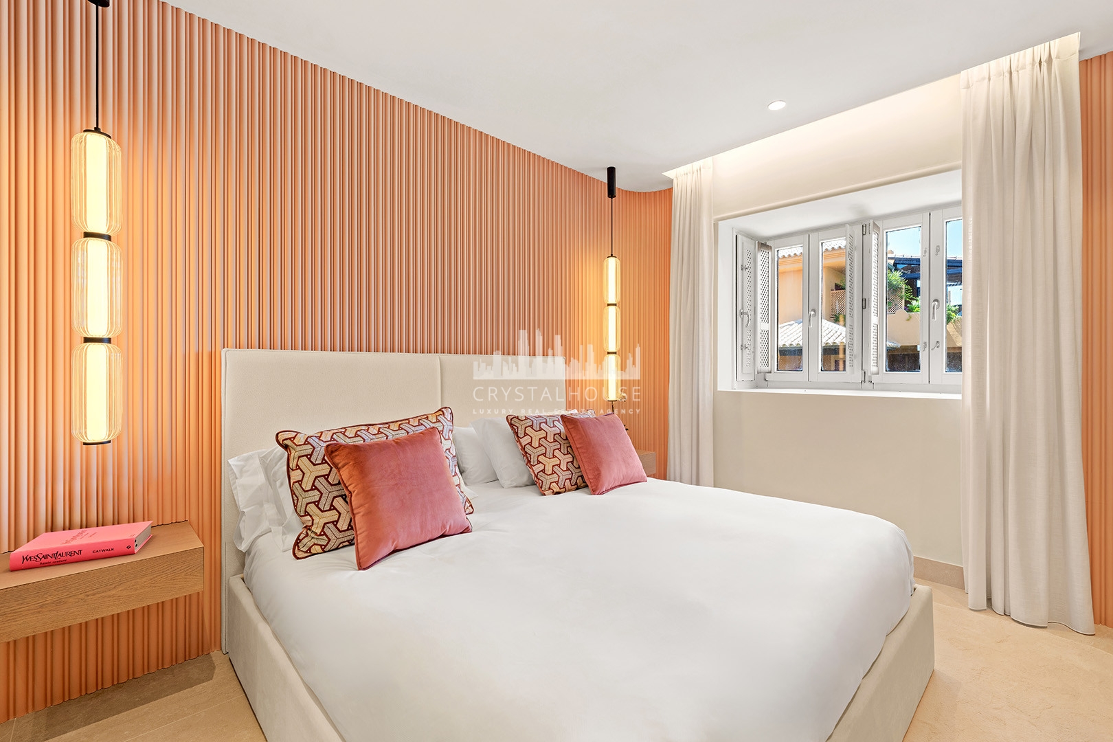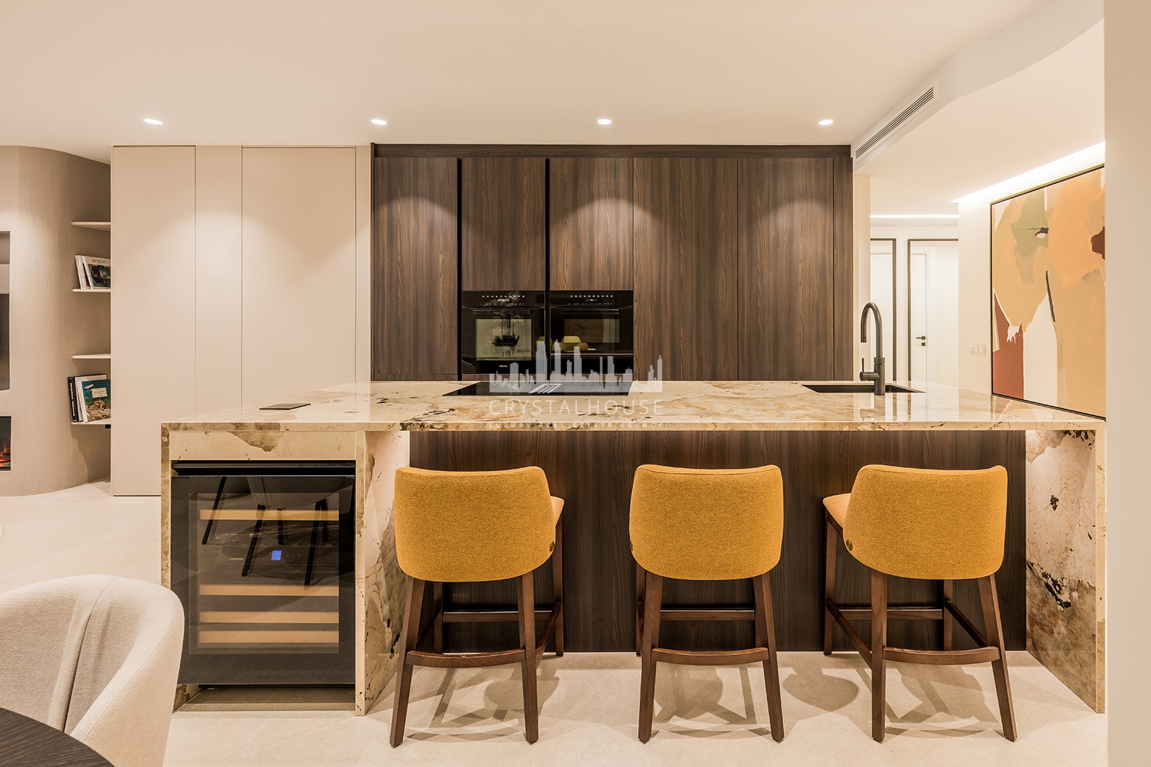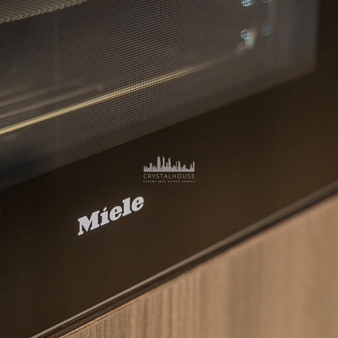 This bright 187 m² apartment boasts a brand-new open-concept designer kitchen with premium German appliances and luxurious extras, including a Bang & Olufsen sound system, an electric fireplace, and a freestanding bathtub.