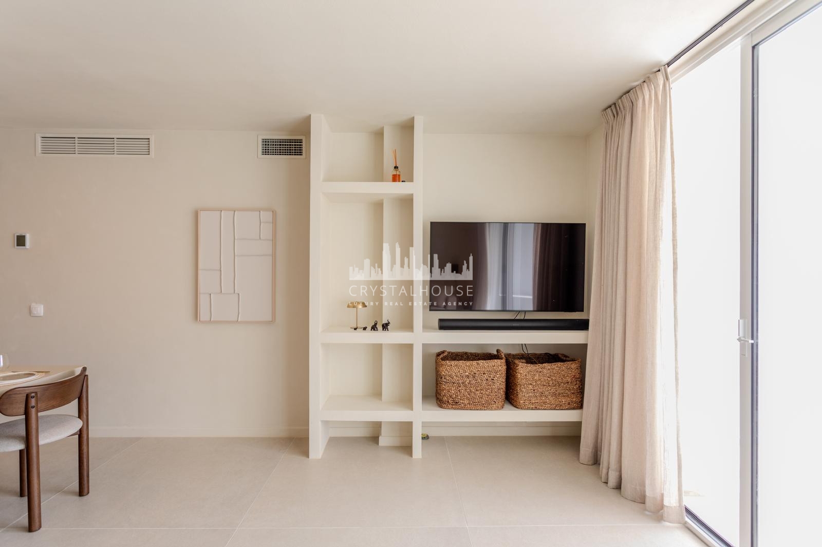 The bathrooms are entirely finished in microcement with built-in fixtures, creating a clean and sophisticated look. Large-format 120×120 tiles have been used throughout the property, seamlessly extending from the interior living areas to the outdoor terraces.