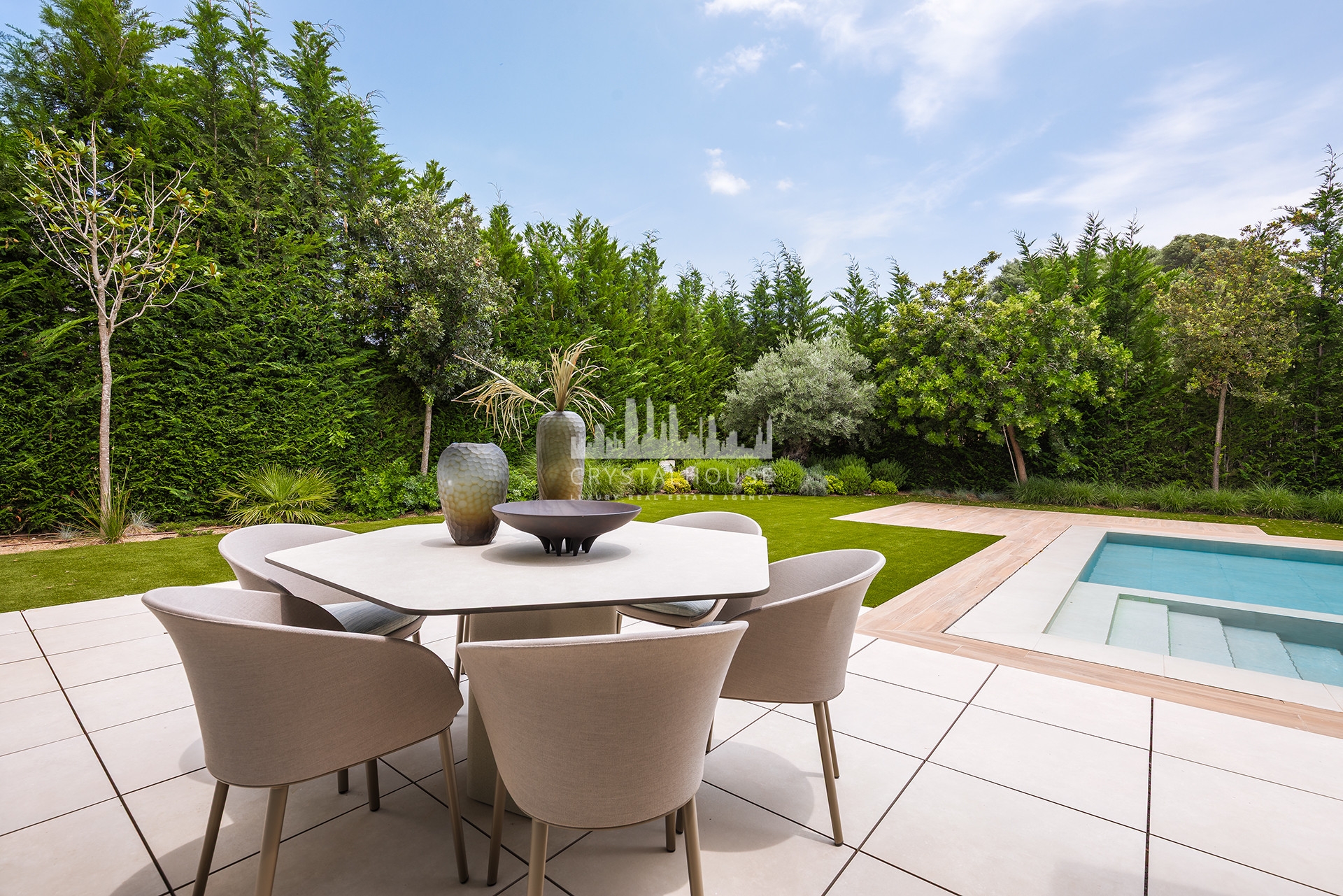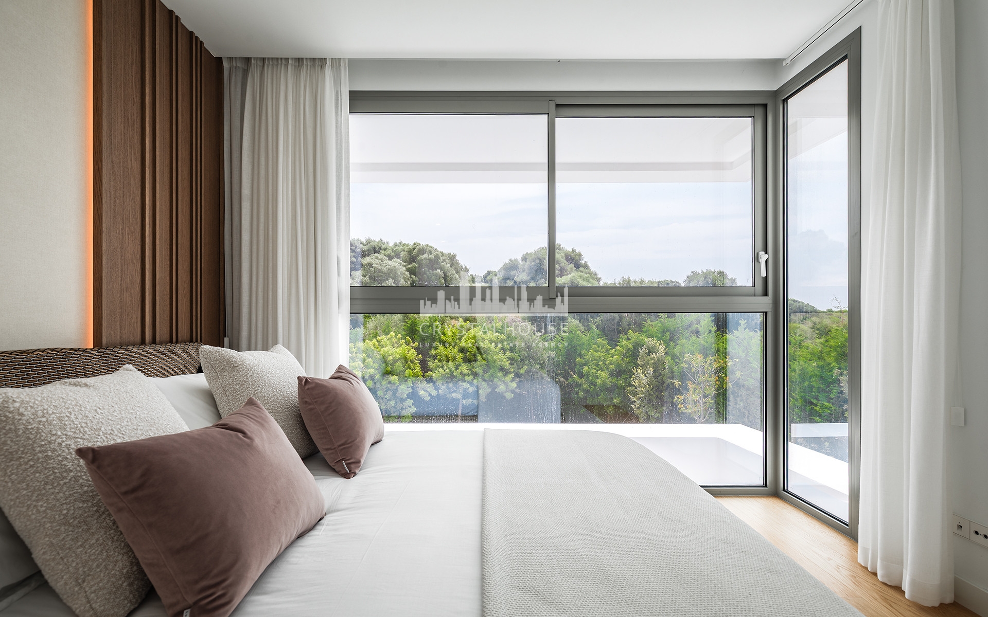 The villa comprises five generously sized bedrooms, all with en-suite bathrooms, in addition to a guest toilet. Interiors are finished with natural wood flooring, underfloor heating, and electric blinds, providing a perfect balance between style and functionality.