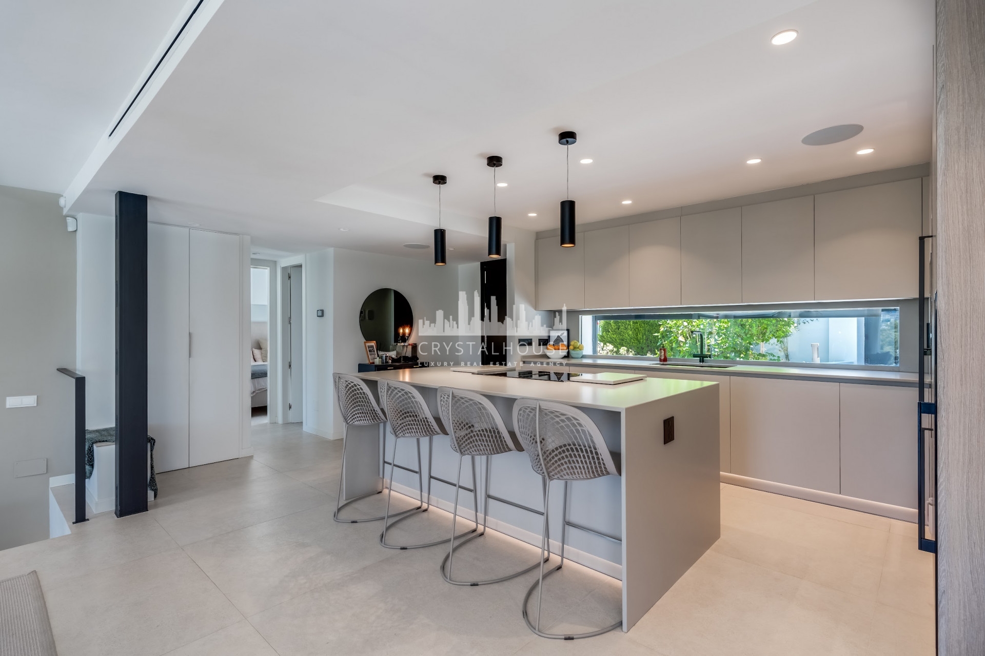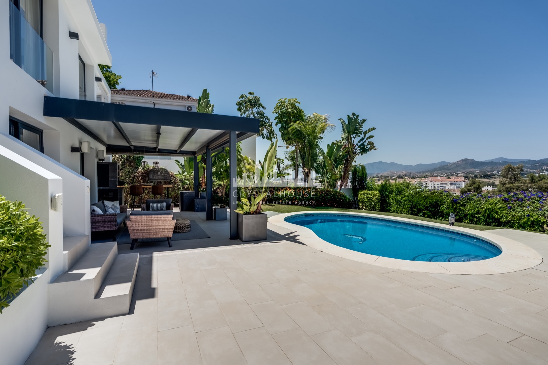 On the lower level, you’ll find two additional bedrooms with en-suite bathrooms, a utility/laundry room, and direct access to a beautiful west-facing terrace with heated swimming pool, pergola, and outdoor bar — the perfect spot to relax and entertain while enjoying the afternoon sun.
