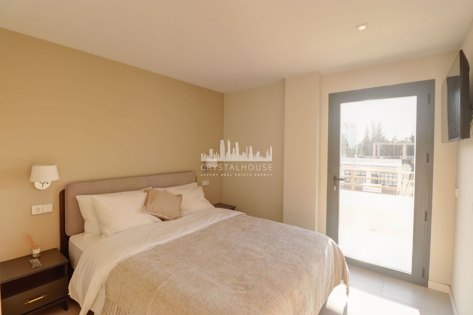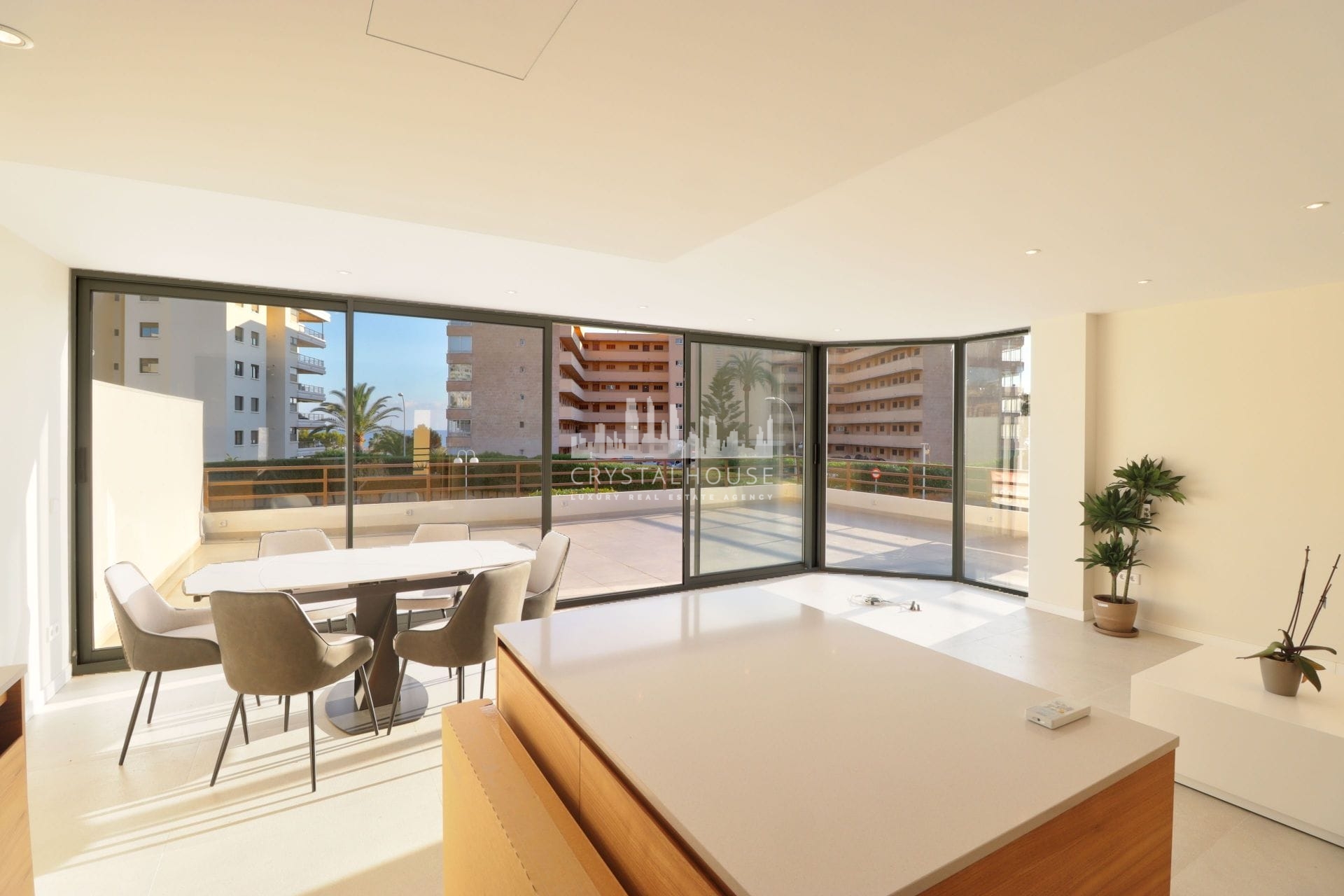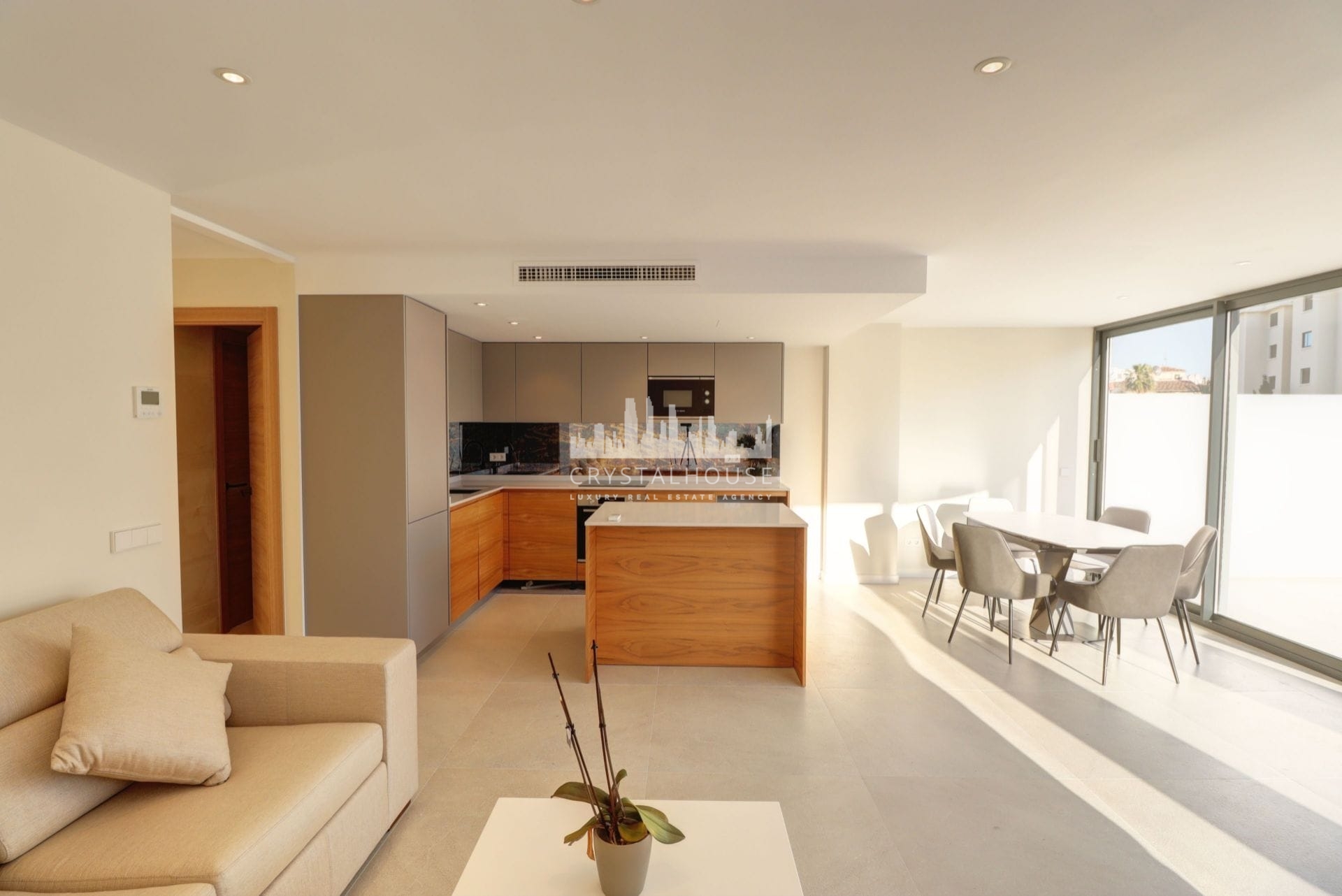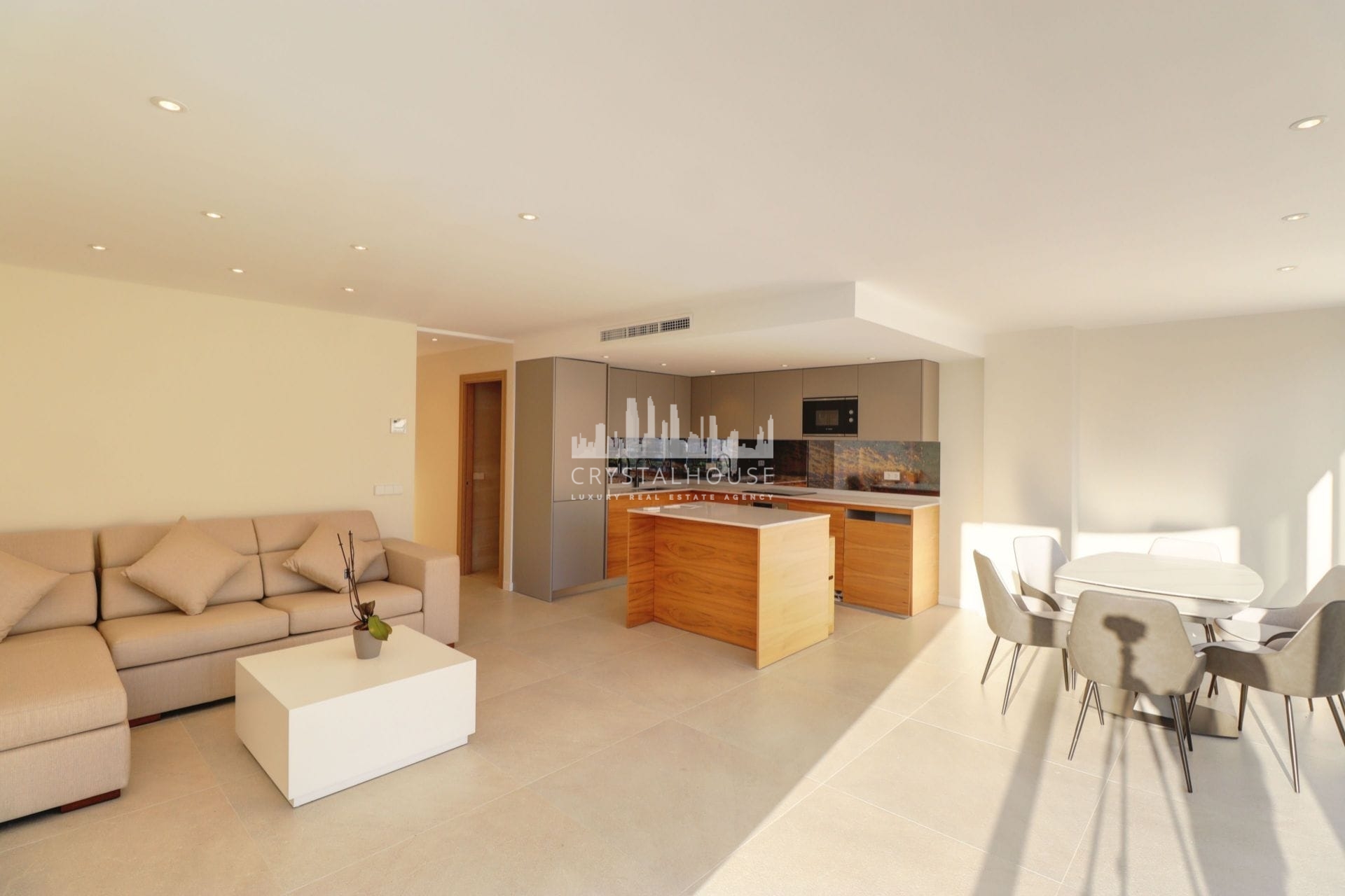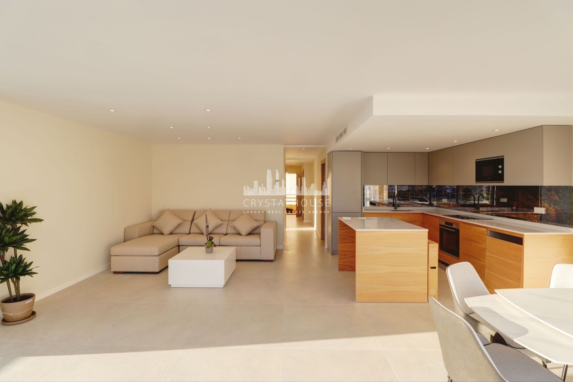 The bright and spacious living-dining area seamlessly integrates an open-plan kitchen, fully equipped with modern appliances. Expansive windows allow for abundant natural light and open onto a generous sun-soaked terrace, perfect for relaxing or entertaining.