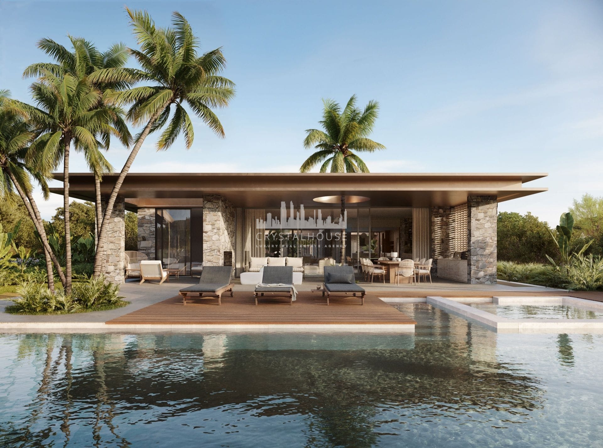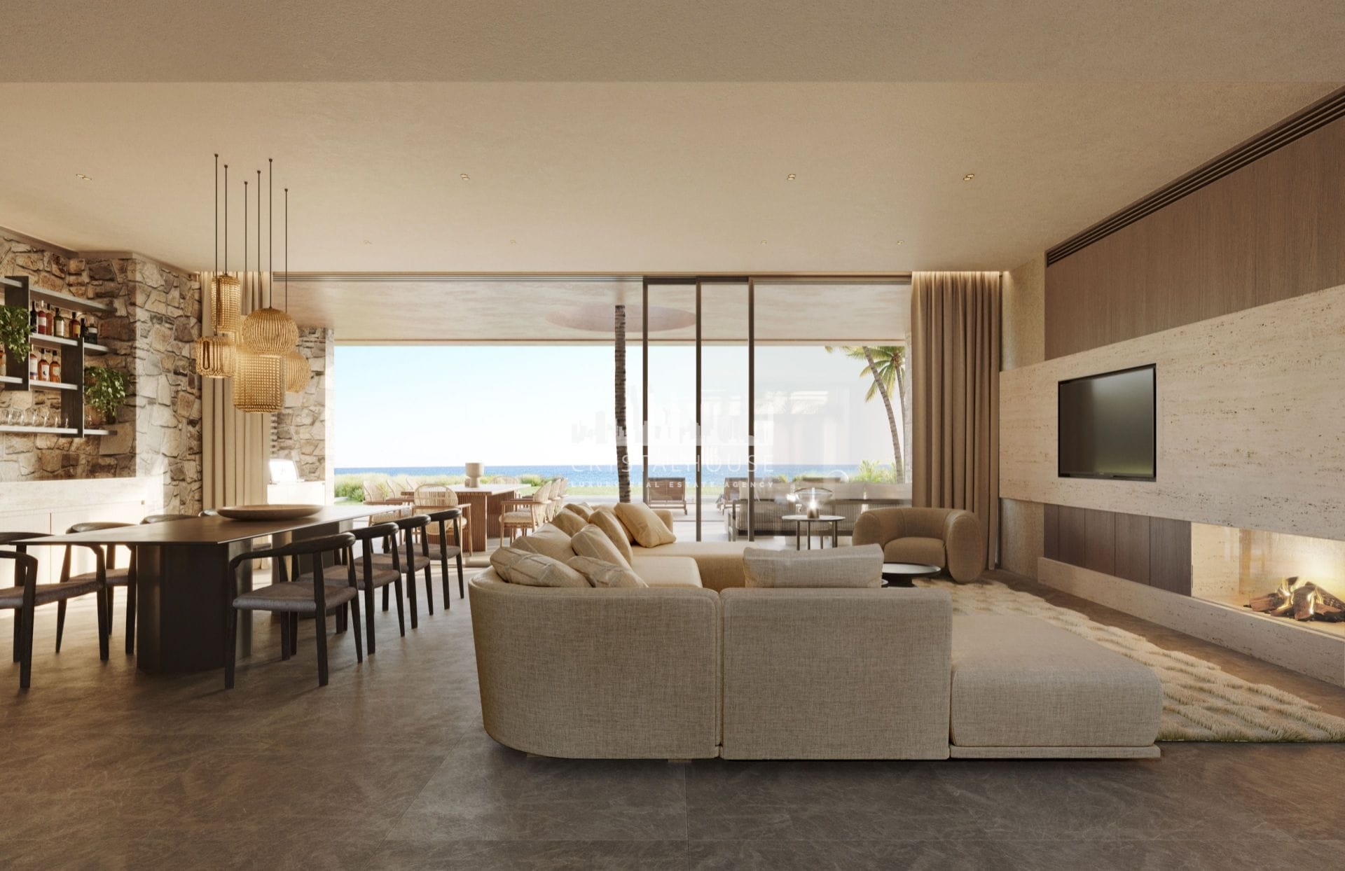 The interior design incorporates natural and earthy colors, with dark wood features and natural stone elements. Large glass doors open to wide terraces, contributing to the natural light within the property. The layout integrates the dining, living, and cooking areas in an open format.