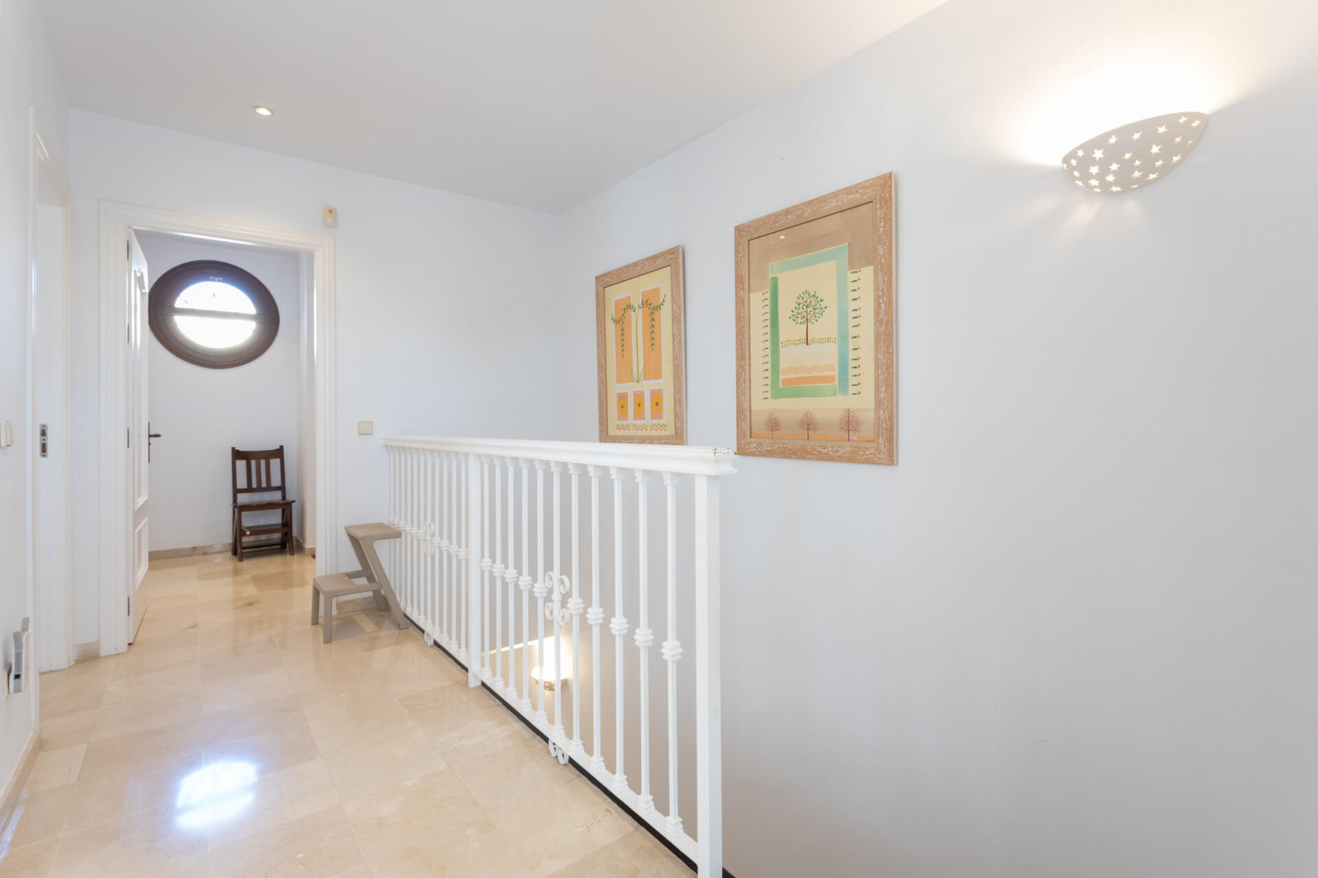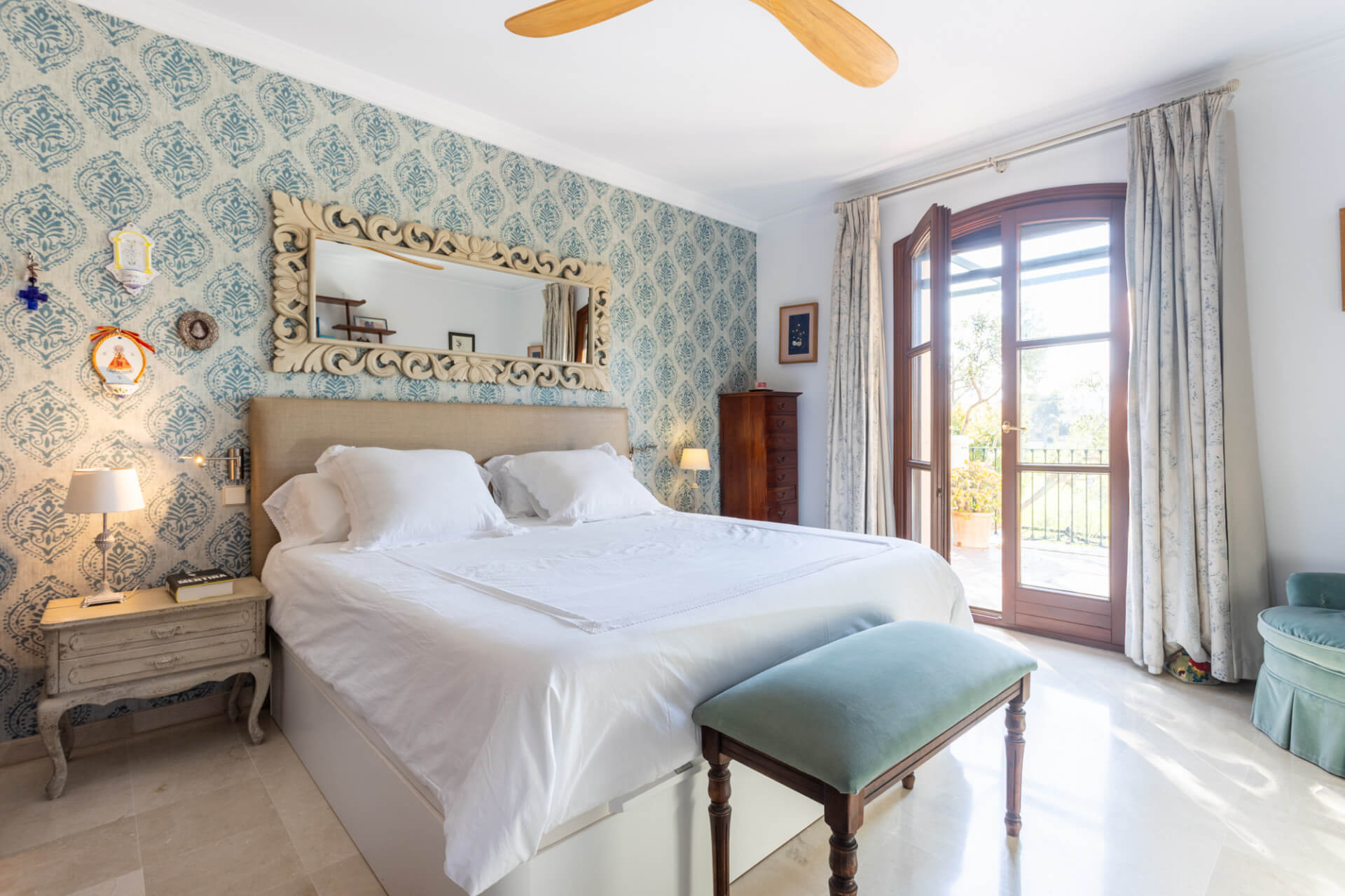 On the upper floor is the sleeping area with three bedrooms. The master bedroom has an en-suite bathroom and access to a pleasant private terrace with open views of the golf course. The other two bedrooms, one of which also has a terrace, share a full bathroom.