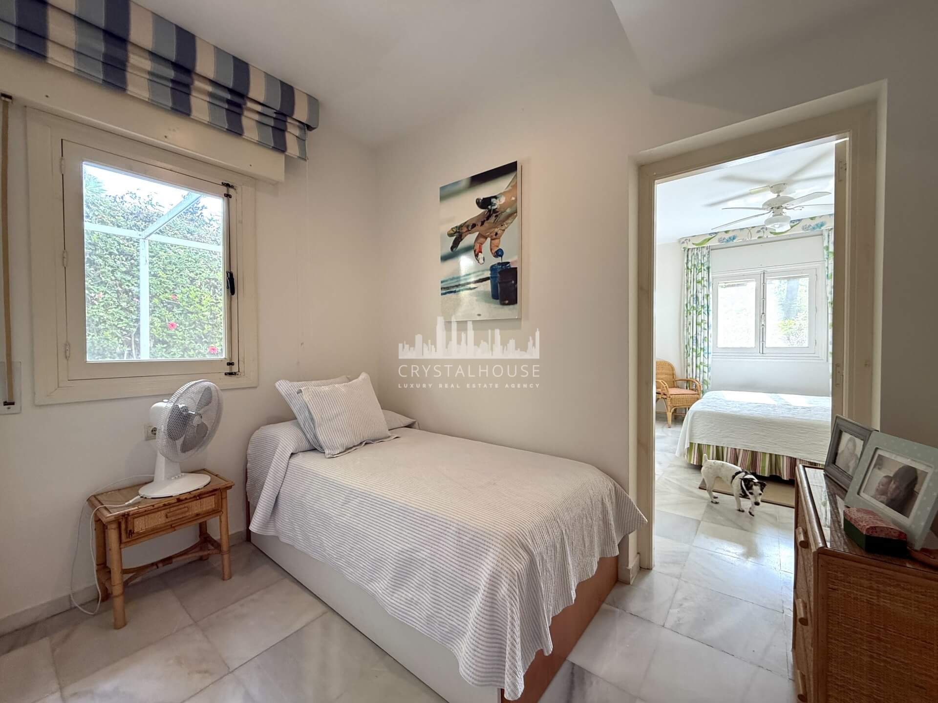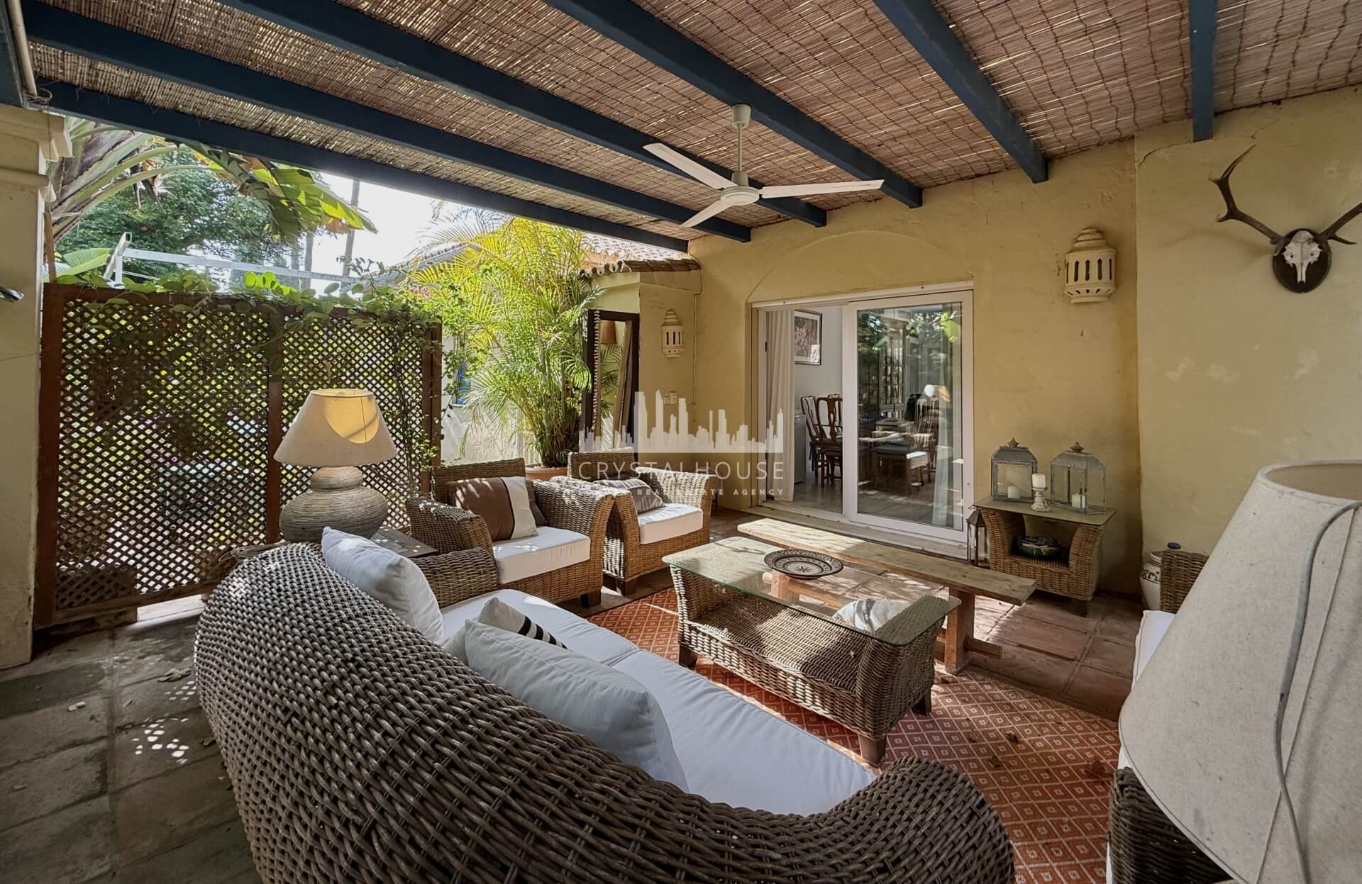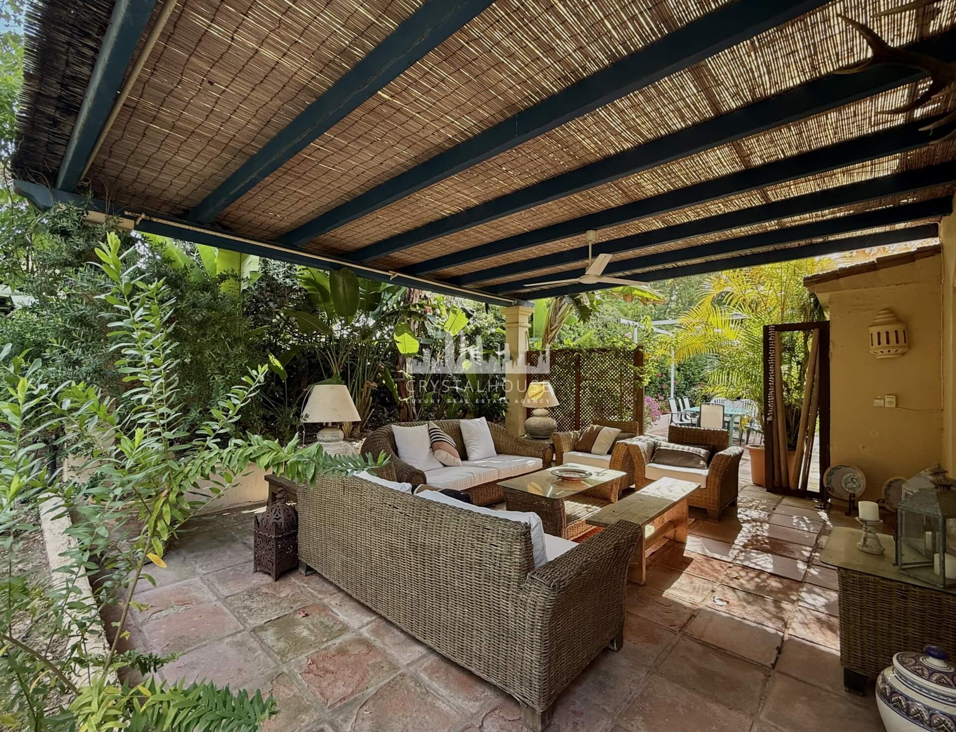 Built on a private plot of over 1,000 m², the villa is part of Triana Villas, a gated community of only 20 homes. The property benefits from a mature garden, a communal swimming pool, and a quiet residential environment.