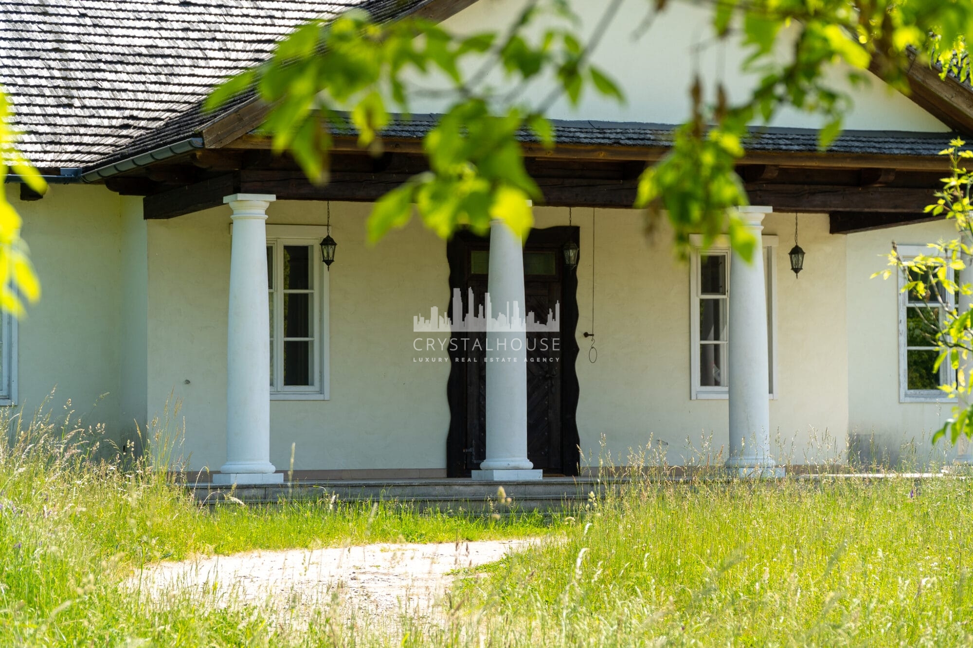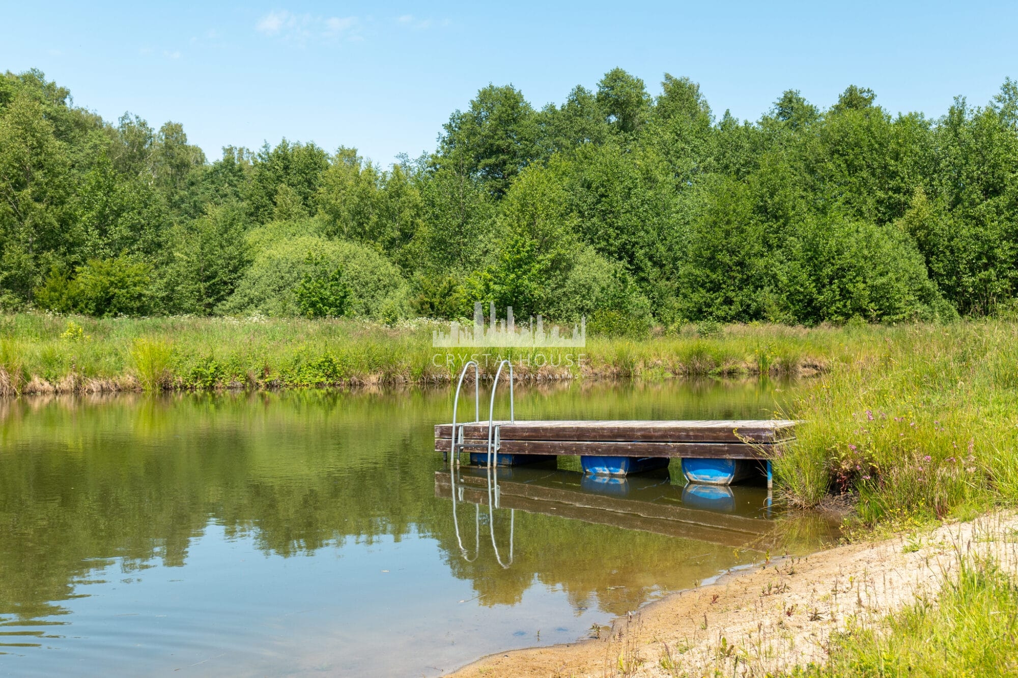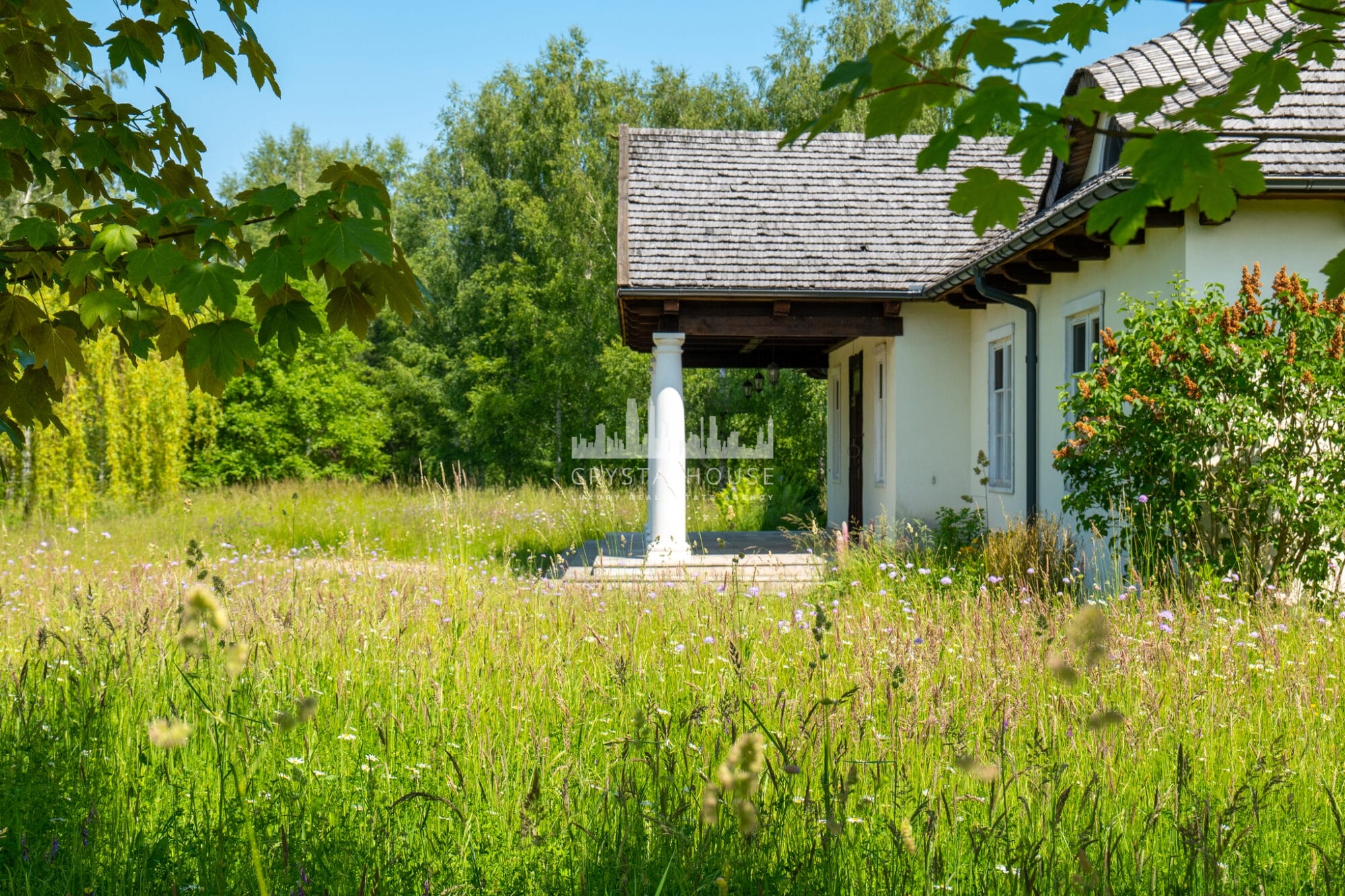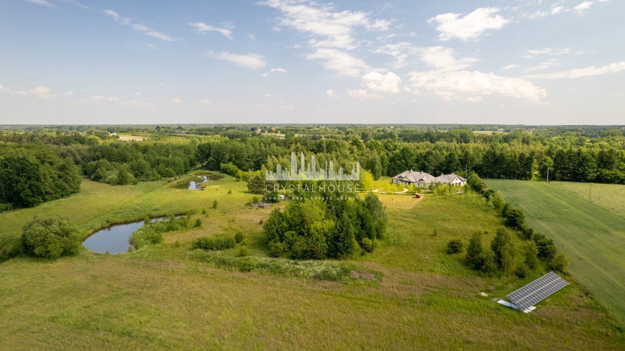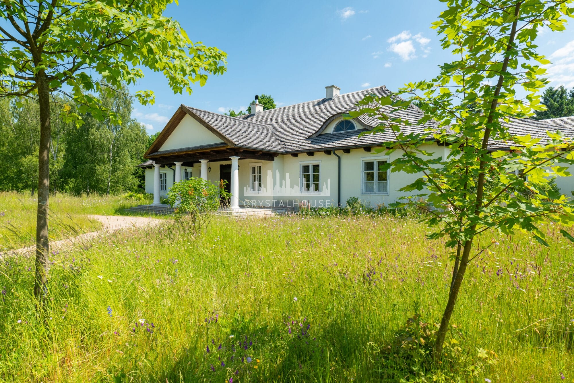 Posiadłość rozciąga się na 10 100 m², obejmując zadbany ogród, łąki i las. Co ważne, malownicza, 550-metrowa aleja klonowa prowadzi do domu, a staw kąpielowy z plażą i pomostem dodaje uroku. Dodatkowo, na terenie rośnie wiele gatunków drzew i krzewów, takich jak dęby, klony czy jaśminy, co tworzy wyjątkową atmosferę. Oprócz tego, bogata fauna, w tym łosie i jelenie, podkreśla naturalny urok otoczenia.