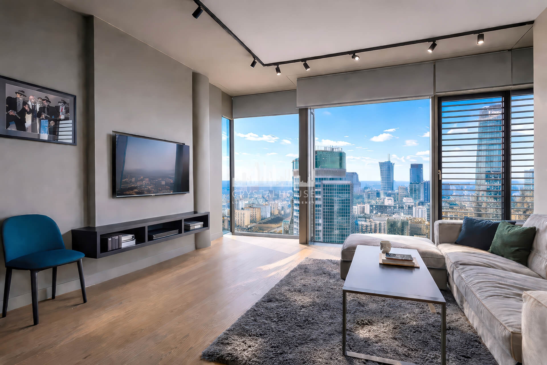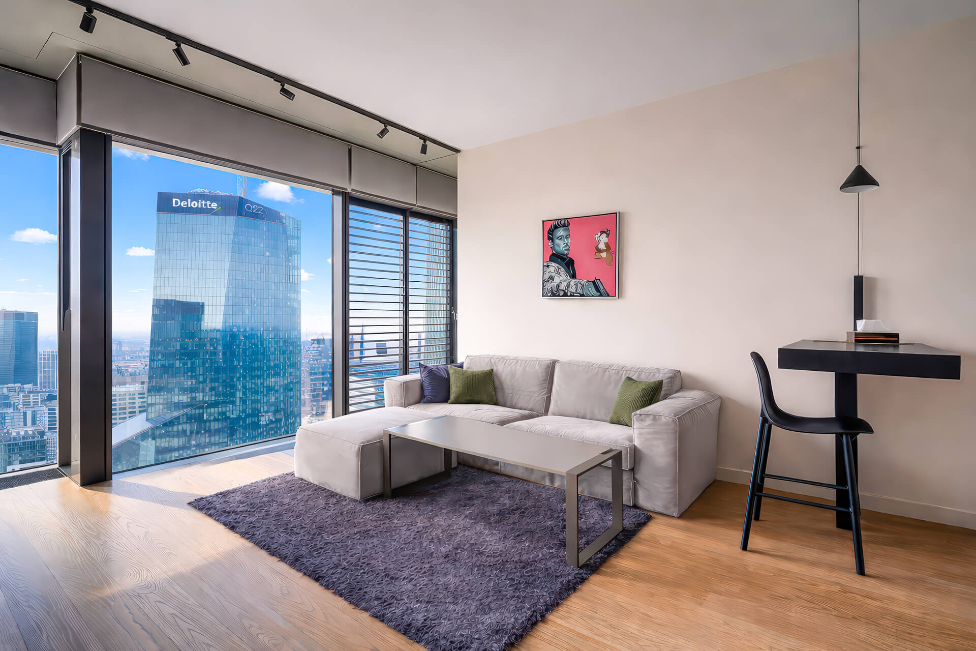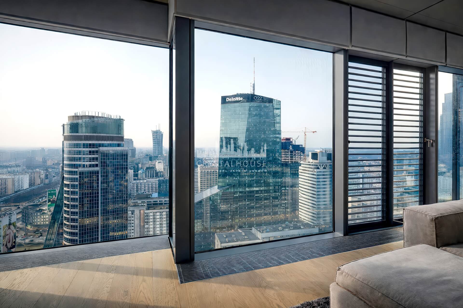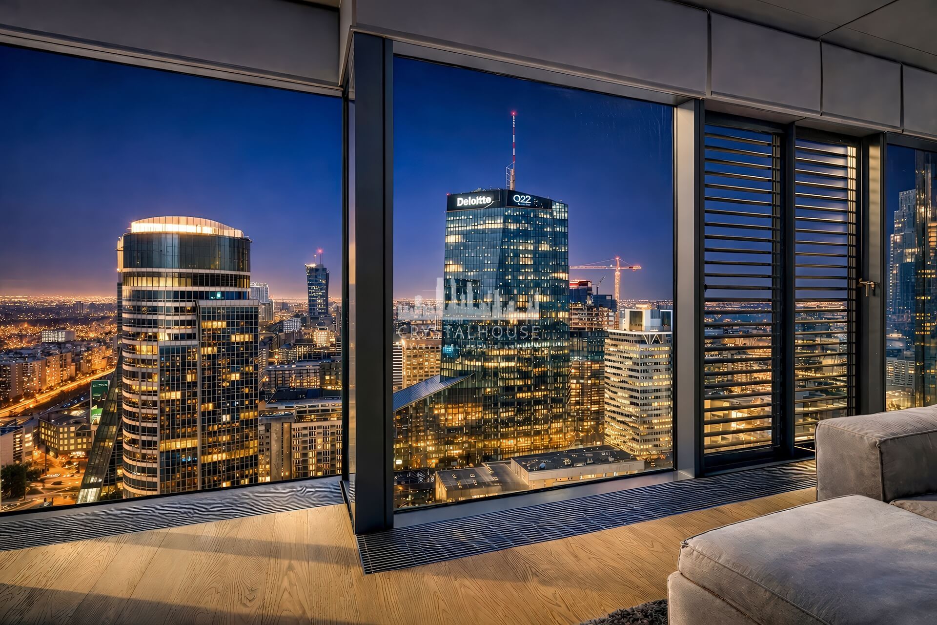 Dzięki panoramicznym przeszkleniom wnętrze jest doskonale doświetlone, a widok na dynamiczne centrum Warszawy podkreśla jego miejski, kosmopolityczny charakter.