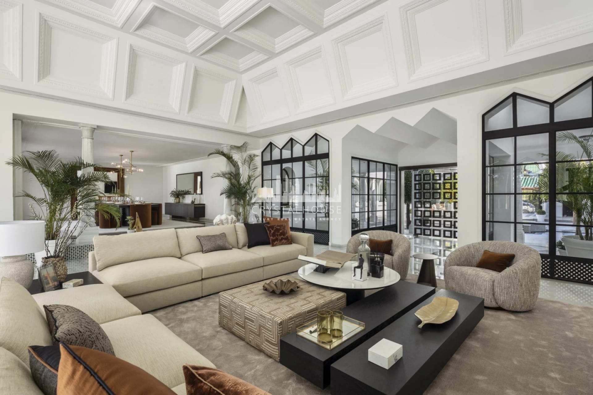 Po przybyciu, zachwycające patio, ozdobione dwoma fontannami, służy jako preludium do wykwintnych wnętrz, które następują. Obfitość okien i szklanych drzwi przesuwnych zapewnia, że naturalne światło zalewa przestrzenie mieszkalne, tworząc płynną harmonię między wnętrzem a zewnętrzem. Otwarta przestrzeń salonu i jadalni, z wysokimi sufitami, dodatkowo wzmacnia poczucie splendoru i przestronności.