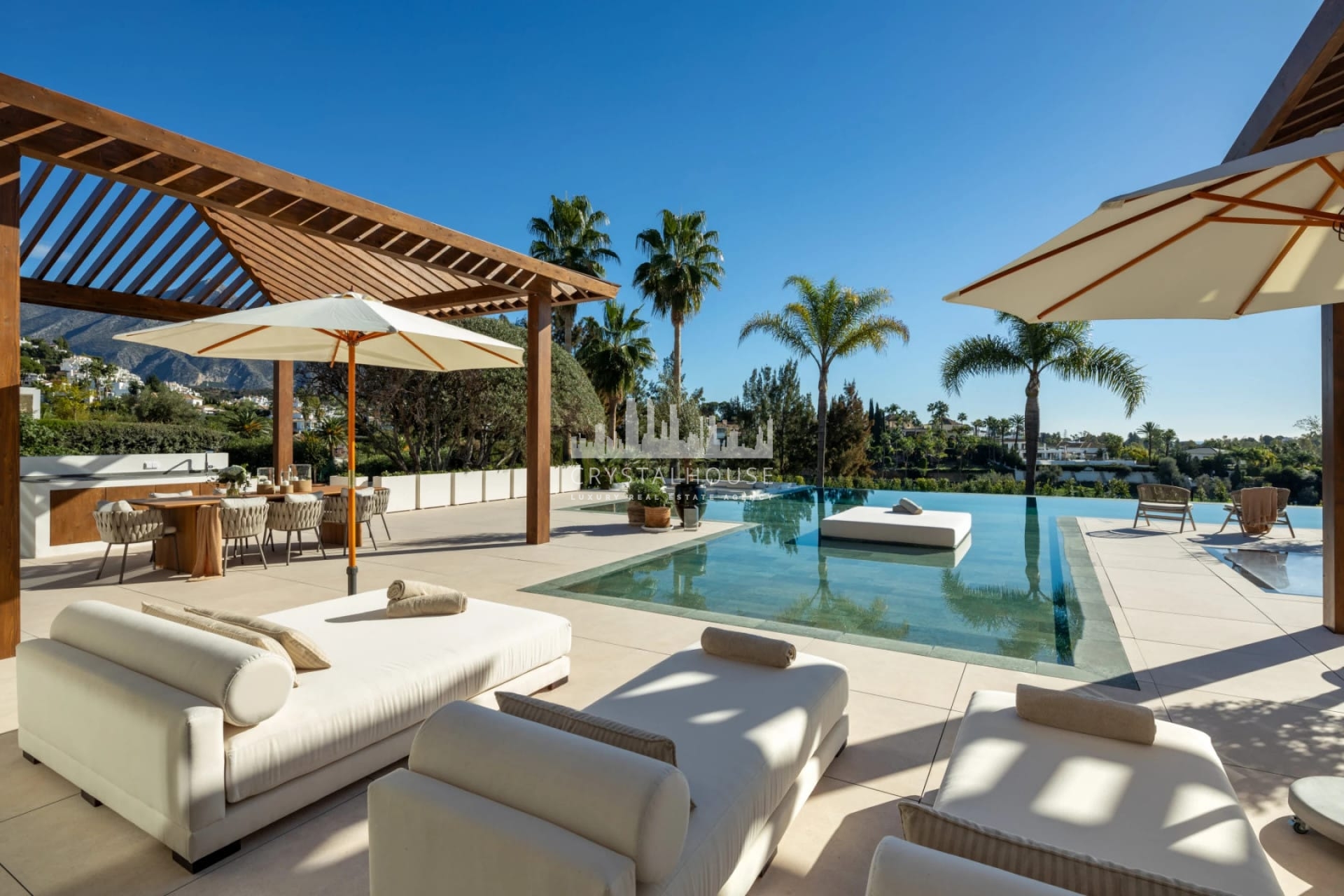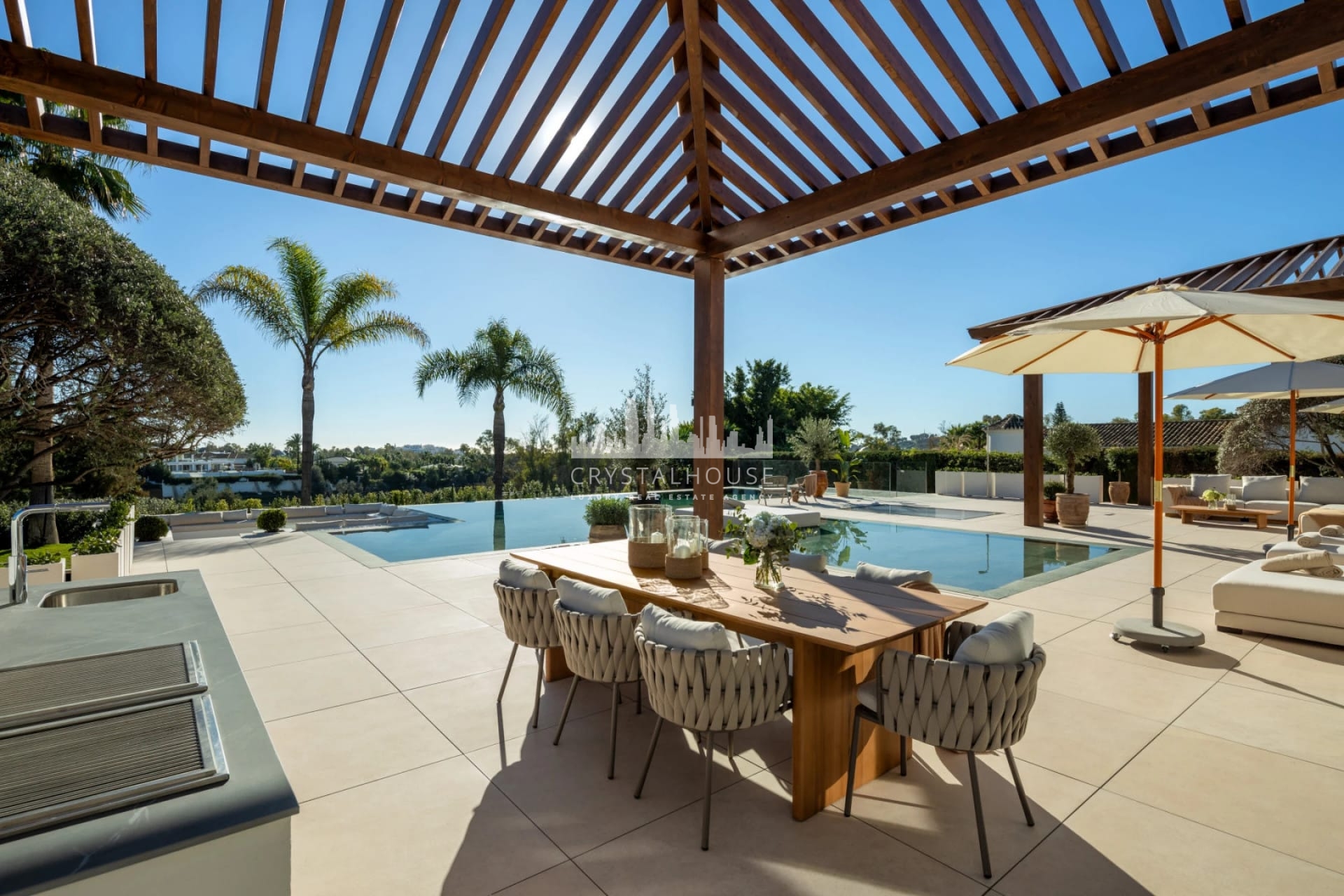 Położony na pierwszej linii działki golfowej, ten wspaniały dom oferuje zapierające dech w piersiach widoki na morze, zielone tory wodne i kultową górę La Concha. Jego płynne połączenie architektury i wzornictwa tworzy spokojną przystań, idealną dla osób poszukujących wyrafinowanego luksusu w Marbelli. Wewnątrz willa ma układ na otwartym planie, wzbogacony kojącą neutralną paletą i dużą ilością naturalnego światła. Nowoczesna kuchnia wyposażona jest w najnowocześniejsze urządzenia, a rozległe szklane drzwi prowadzą na przestronne tarasy, zapraszając do korzystania z uroków życia na świeżym powietrzu. Pięć luksusowych sypialni, w tym wspaniały apartament główny z dostępem do tarasu, garderobą i oszałamiającą łazienką, każdy szczegół jest wykonany z myślą o komforcie i stylu. Udogodnienia Villa Olivia podnoszą komfort życia na niezrównane wyżyny. Od basenu bez krawędzi z widokiem na pole golfowe po prywatne spa z jacuzzi i sauną, każdy zakątek został zaprojektowany z myślą o przyjemności. Nieruchomość posiada również kino domowe, w pełni wyposażoną siłownię i salę rozrywkową, dzięki czemu jest wyjątkowym miejscem dla rodzin, zapalonych golfistów i wymagających nabywców.