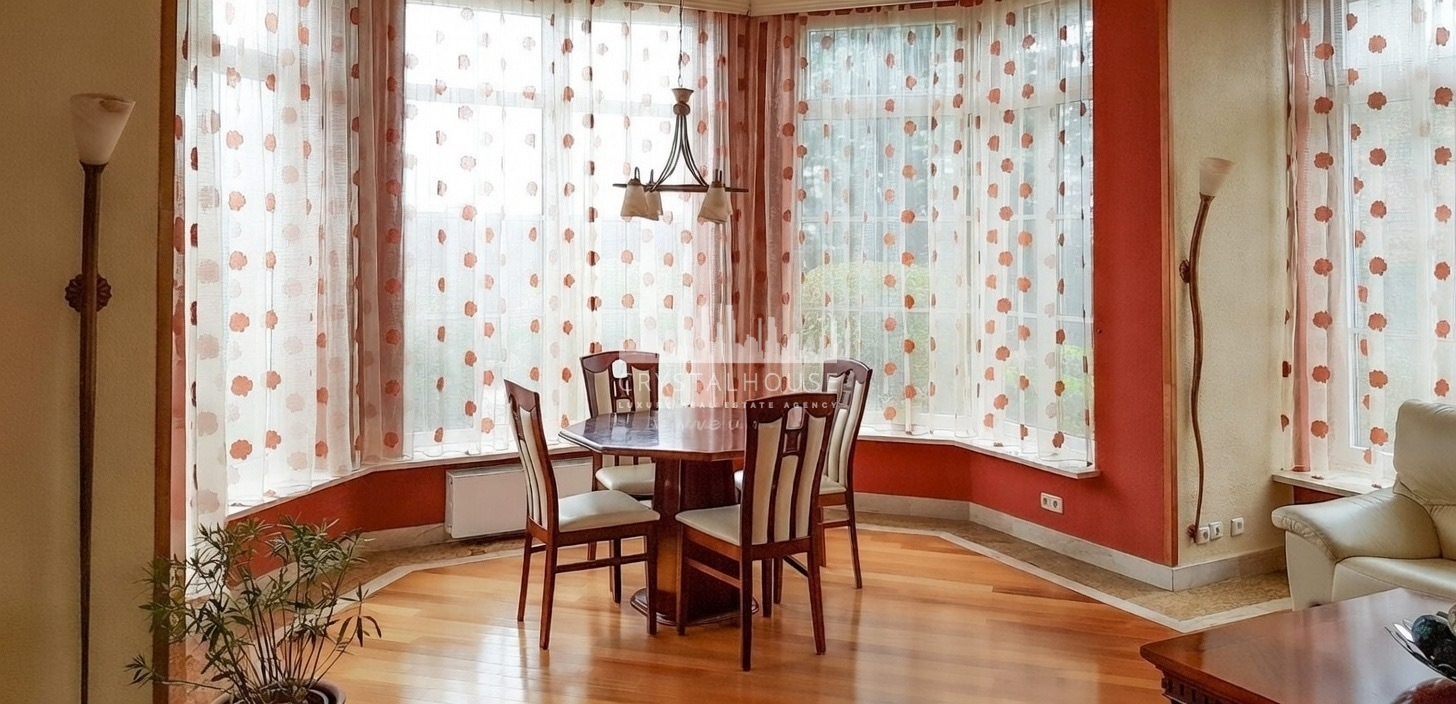 - jadalnia, z rodzinnym stołem w centralnej części. Również wyłożona dębowym parkietem.
