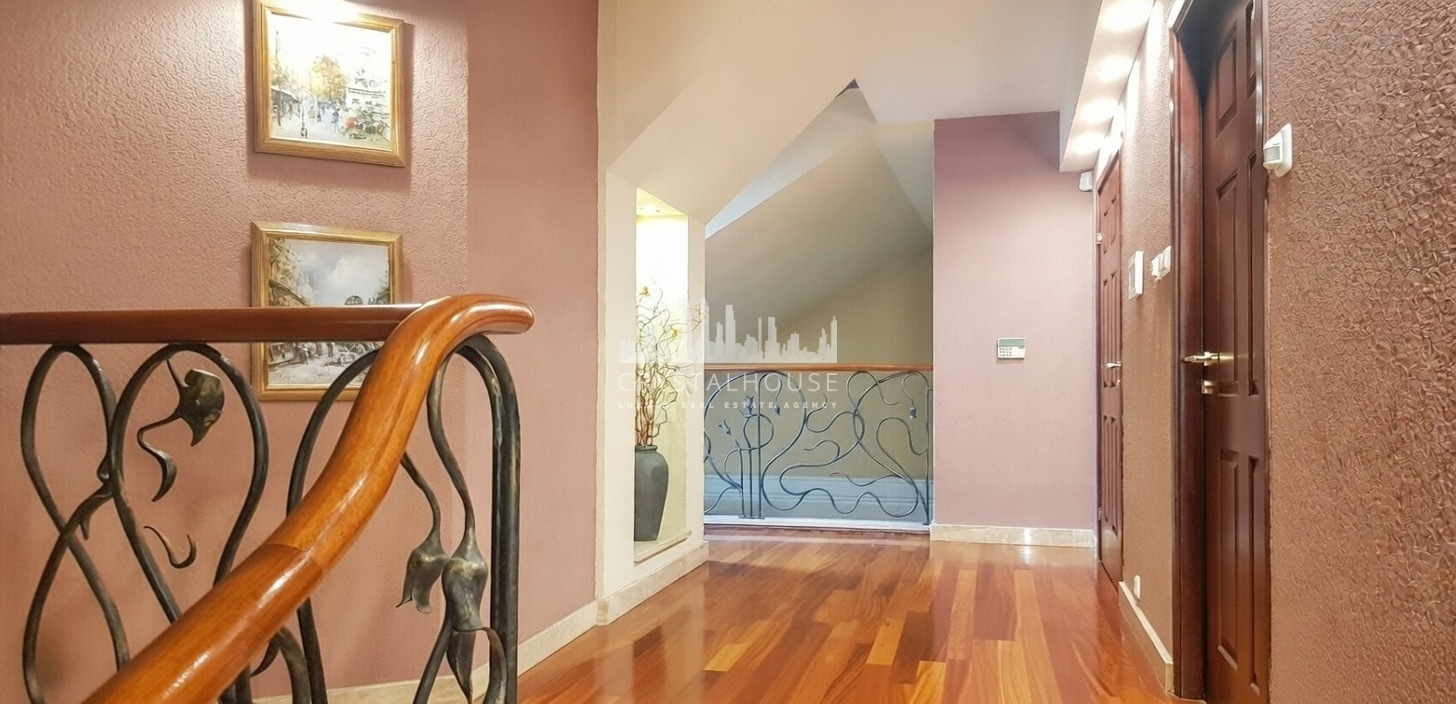 Podążając hallem znajdziemy się na pięknych, zaprojektowanych na zamówienie schodach prowadzących na piętro. Po drodze na półpiętrze znajduje się pokój z bezpośrednim wyjściem na górny taras. Ów pomieszczenie może pełnić funkcję np. gabinetu, pokoju gościnnego, lub sypialni.