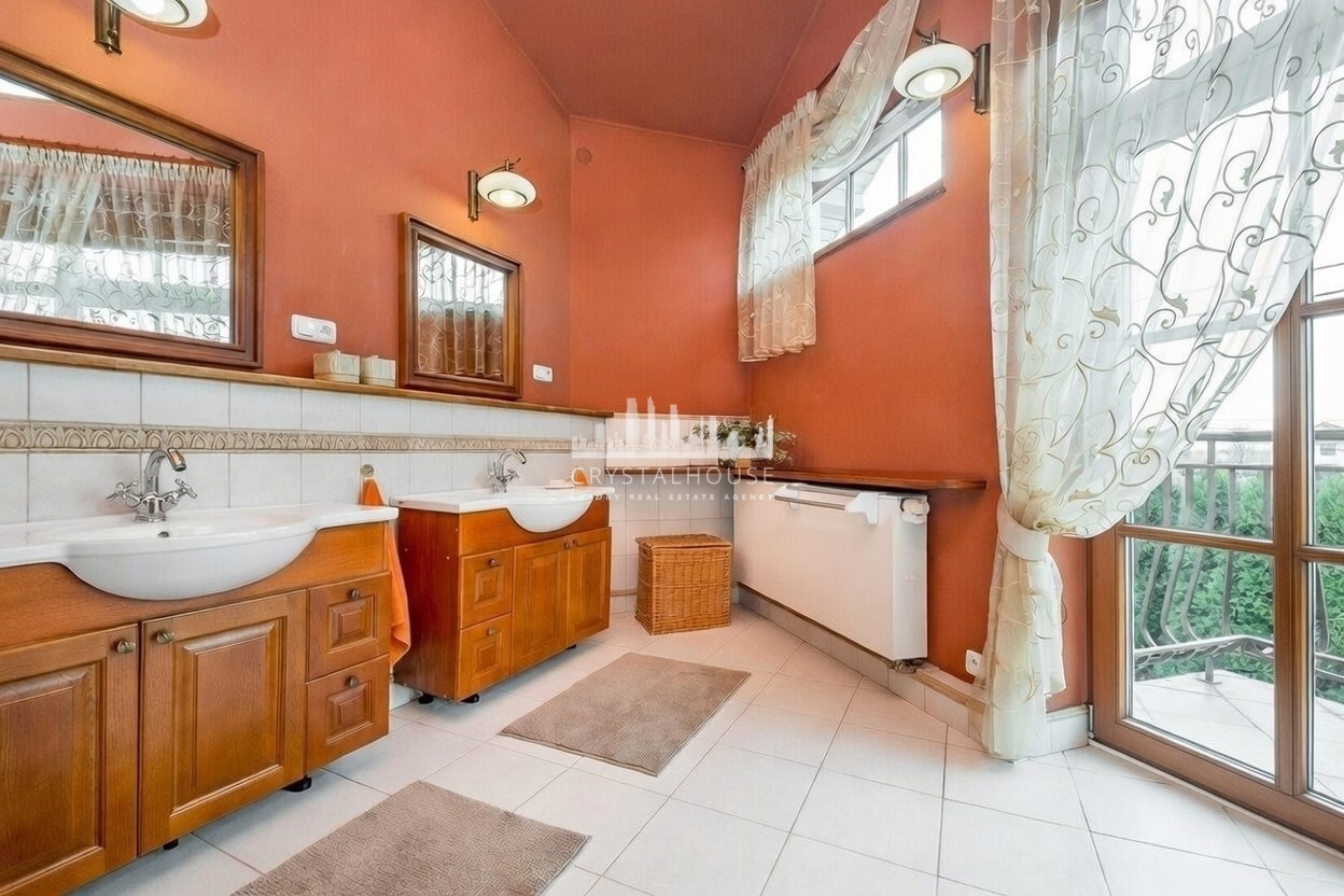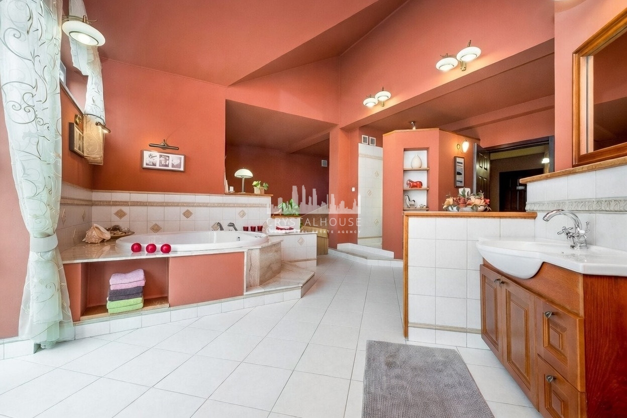 Na piętrze dysponujemy także dwupoziomowym salonem kąpielowym, o pow. 28m2. Na pierwszym poziomie znajdują się dwie oddzielne umywalki z szafkami, ubikacja, bidet, prysznic z biczami wodnymi i okrągła duża wanna z jacuzzi. Na drugim poziomie pokoju kąpielowego znajduje się w pełni wyposażona drewniana sauna na 6 osób, kącik wypoczynkowy i bezpośrednie wyjście na górny taras.