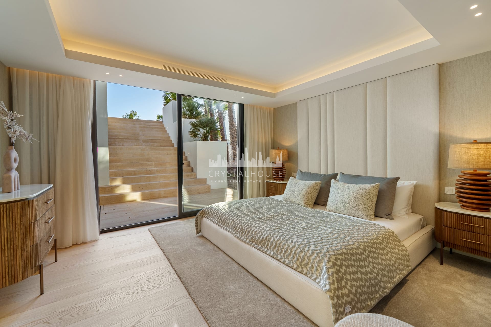 Wewnątrz budynku zaprojektowano sześć przestronnych sypialni z prywatnymi łazienkami wykończonymi w standardzie spa. Główna sypialnia posiada wyjście na prywatny taras, co zapewnia domownikom wyjątkową intymność. Ta konkretna willa Nueva Andalucía oferuje poziom komfortu spotykany jedynie w najlepszych hotelach świata. Zastosowana w całym projekcie przemyślana komunikacja wewnętrzna sprawia, że poruszanie się po domu jest niezwykle intuicyjne. W tym nowoczesnym domu rodzinnym zaimplementowano również zaawansowany system inteligentnego zarządzania. Pozwala on na zdalne sterowanie oświetleniem, temperaturą oraz bezpieczeństwem bezpośrednio ze smartfona.