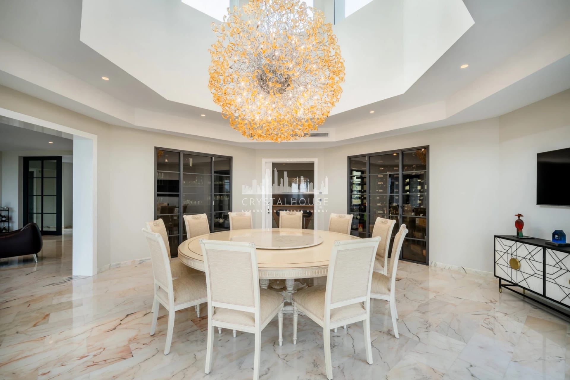 Posiadłość szczyci się rozległymi tarasami zaprojektowanymi do spożywania posiłków i relaksu na świeżym powietrzu, uzupełnionymi o prywatny basen zewnętrzny oraz w pełni wyposażoną zewnętrzną kuchnię z grillem. Parter płynnie łączy życie wewnętrzne z zewnętrznym, oferując bezpośredni dostęp do tarasów, co stanowi idealne miejsce do spotkań towarzyskich lub relaksu.