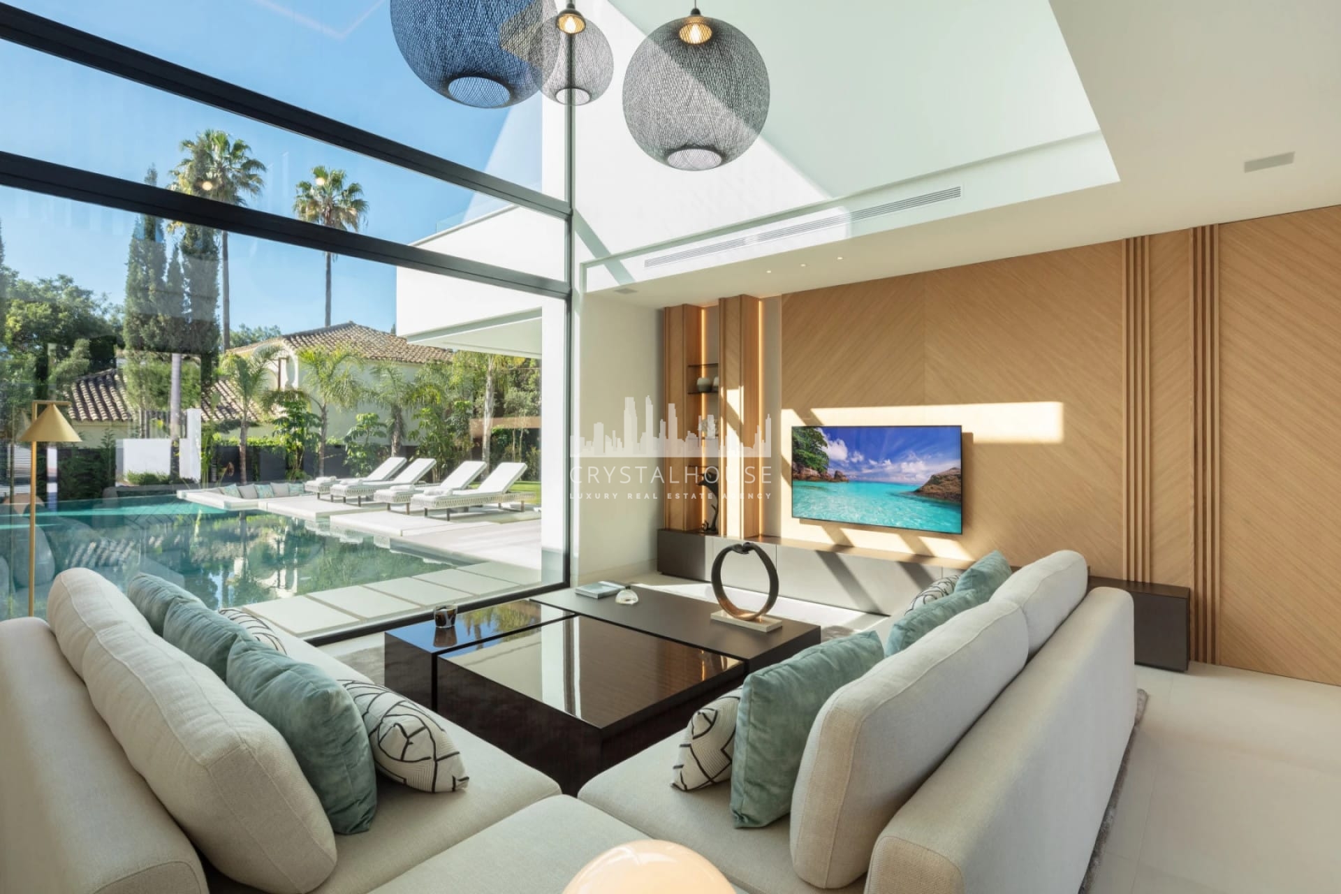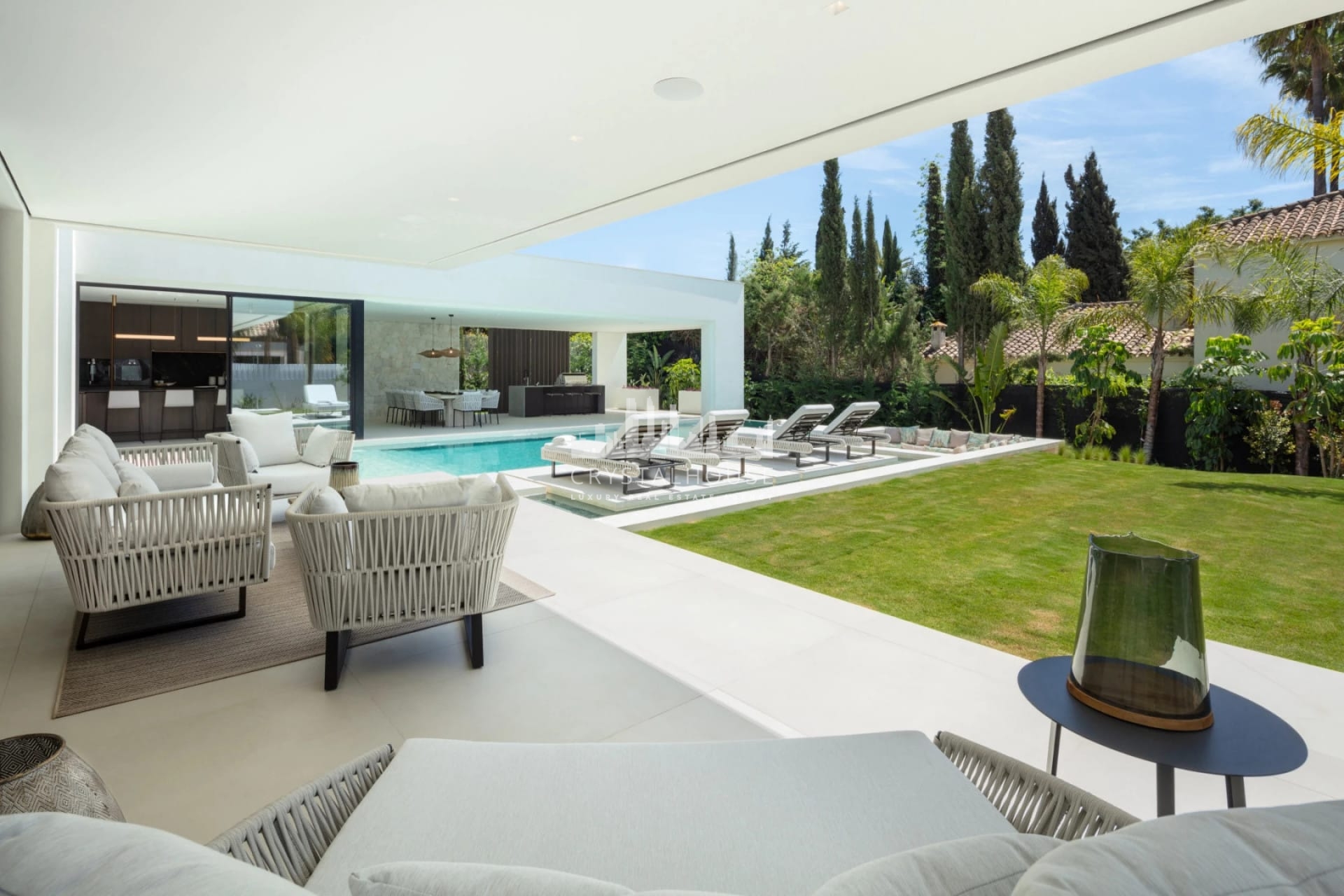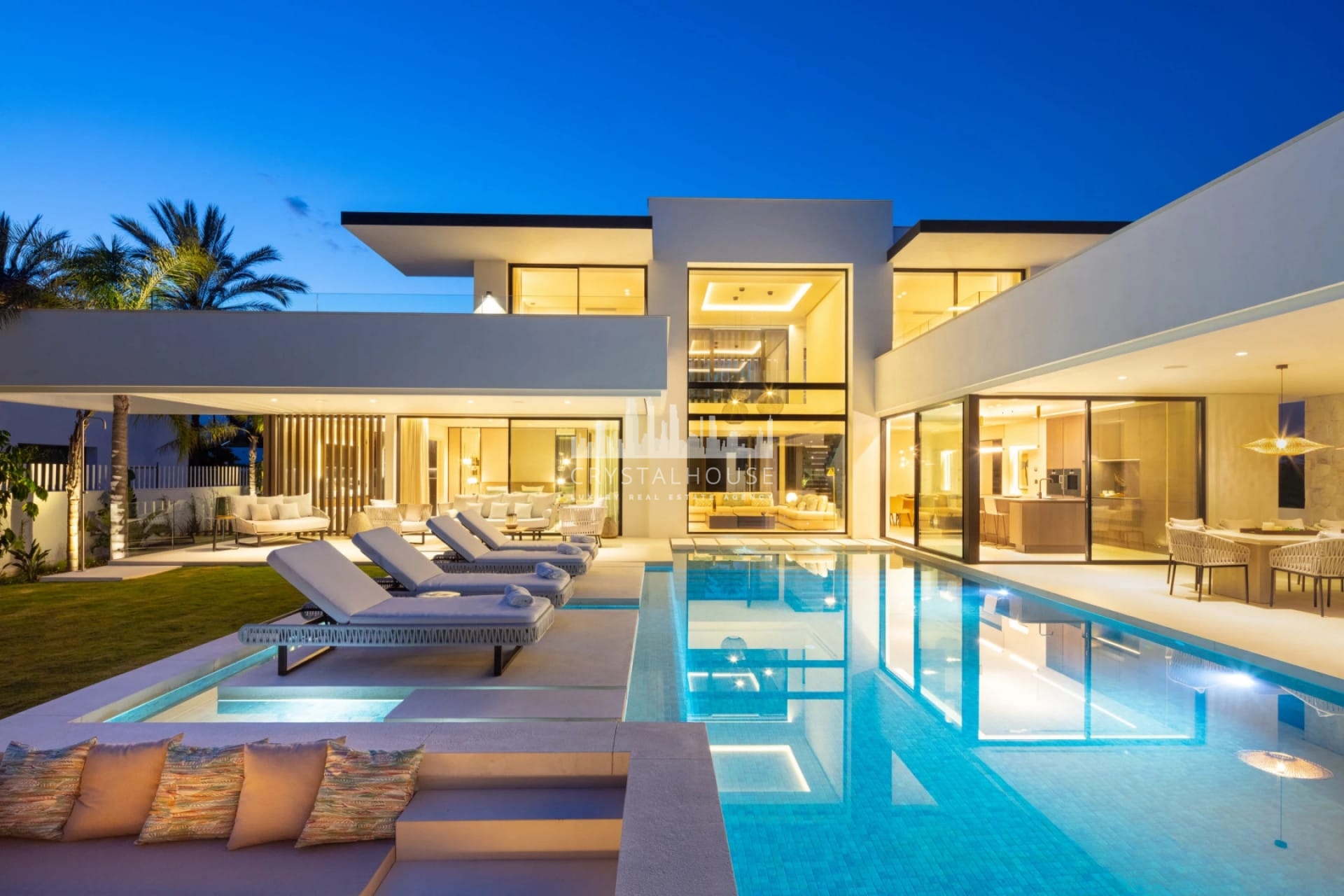 Nieruchomość posiada pięknie zagospodarowany ogród z prywatnym basenem i zatopioną strefą relaksu. Przestronne tarasy zapewniają aneks kuchenny na świeżym powietrzu, jadalnię i wiele miejsc wypoczynkowych, oferując idealne warunki do rozrywki lub relaksu na słońcu. Wnętrze ma otwarty plan z jasnym salonem, jadalnią i w pełni wyposażoną nowoczesną kuchnią z wysokiej klasy sprzętem AGD. Willa oferuje pięć przestronnych sypialni, w tym duży apartament główny z garderobą i łazienką z najwyższej jakości wykończeniami. Okna sięgające od podłogi do sufitu w całym domu tworzą płynny przepływ między wewnętrznymi i zewnętrznymi przestrzeniami mieszkalnymi. Dodatkowe udogodnienia obejmują poziom rozrywki ze stołem bilardowym, sauną i siłownią / salą do jogi. Położona w samym sercu Nueva Andalucía, Villa Sirius znajduje się zaledwie kilka minut od najlepszych pól golfowych, międzynarodowych szkół, sklepów i restauracji, co czyni ją doskonałym wyborem zarówno do stałego zamieszkania, jak i pobytów wakacyjnych.