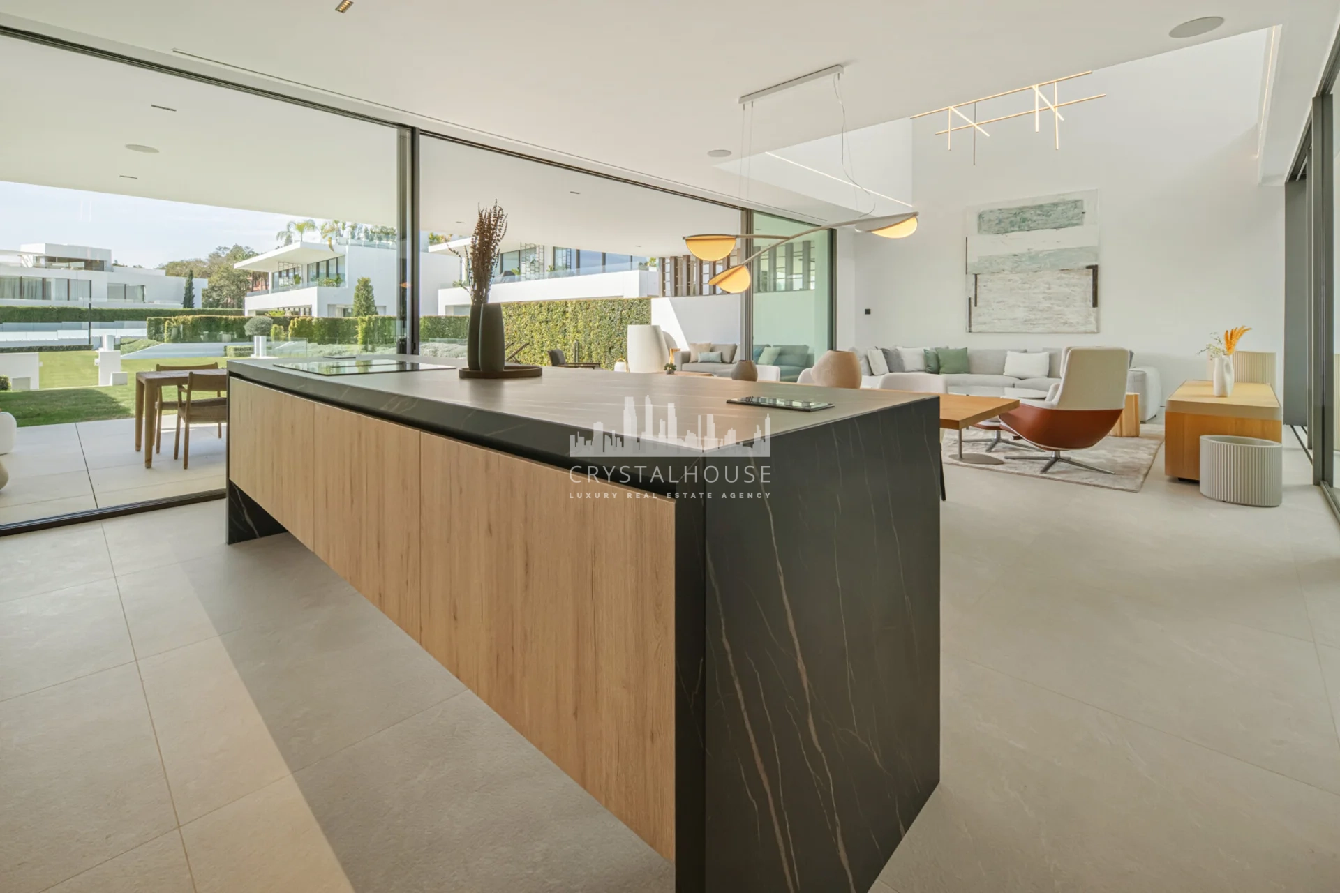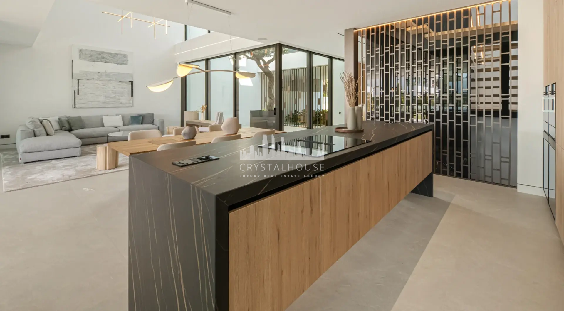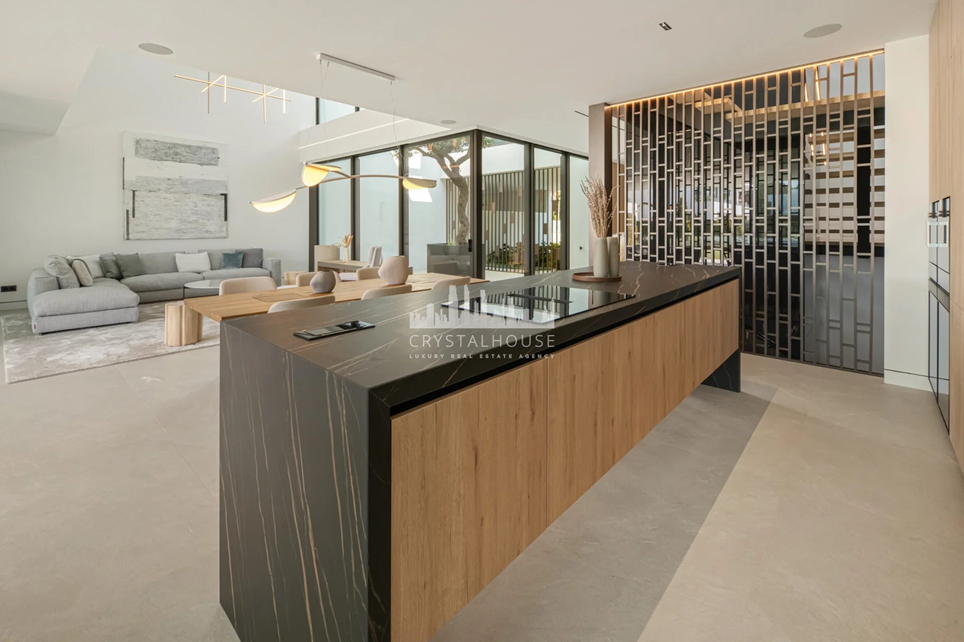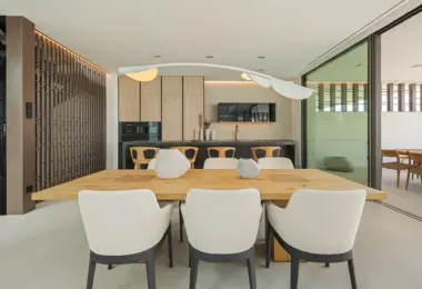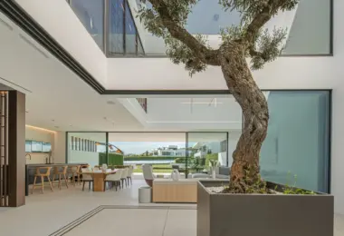 Wybierając ten nowoczesny budynek z 3 sypialniami suite i 4 łazienkami, stawiają Państwo na trwałość i nowoczesny design. Ta rezydencja w Marbelli wykorzystuje przemyślany układ ukierunkowany na krajobraz. Gwarantuje to doskonałe doświetlenie wnętrz przez cały rok. Sercem parteru jest przeszklone patio z dojrzałym drzewem oliwnym. Wokół niego skupia się życie domowników w salonie o podwójnej wysokości. Wykończenia z naturalnego dębu podkreślają prestiżowy charakter nieruchomości na Golden Mile. Panoramiczne przeszklenia płynnie łączą wnętrze z tarasami o powierzchni 240 m². Całość tworzy spójną komunikację wewnętrzną idealną dla rodziny.