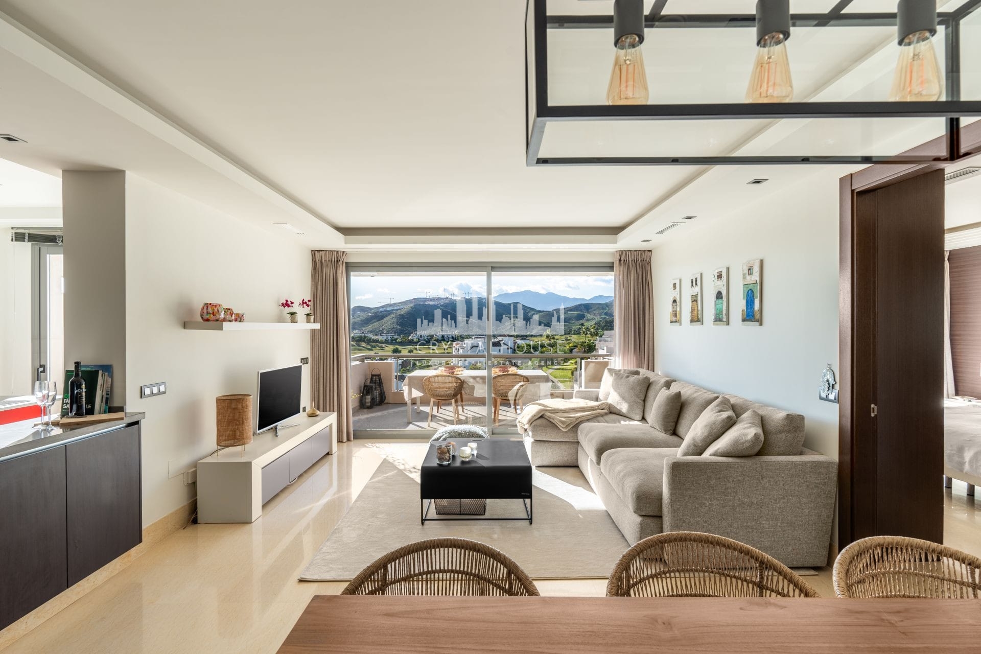 Apartament położony jest na wysokim piętrze i oferuje piękne panoramiczne widoki na góry, pole golfowe i morze. Przestronny taras jest idealnym miejscem do spożywania posiłków na świeżym powietrzu, opalania się lub po prostu relaksu, podziwiając spektakularne zachody słońca.