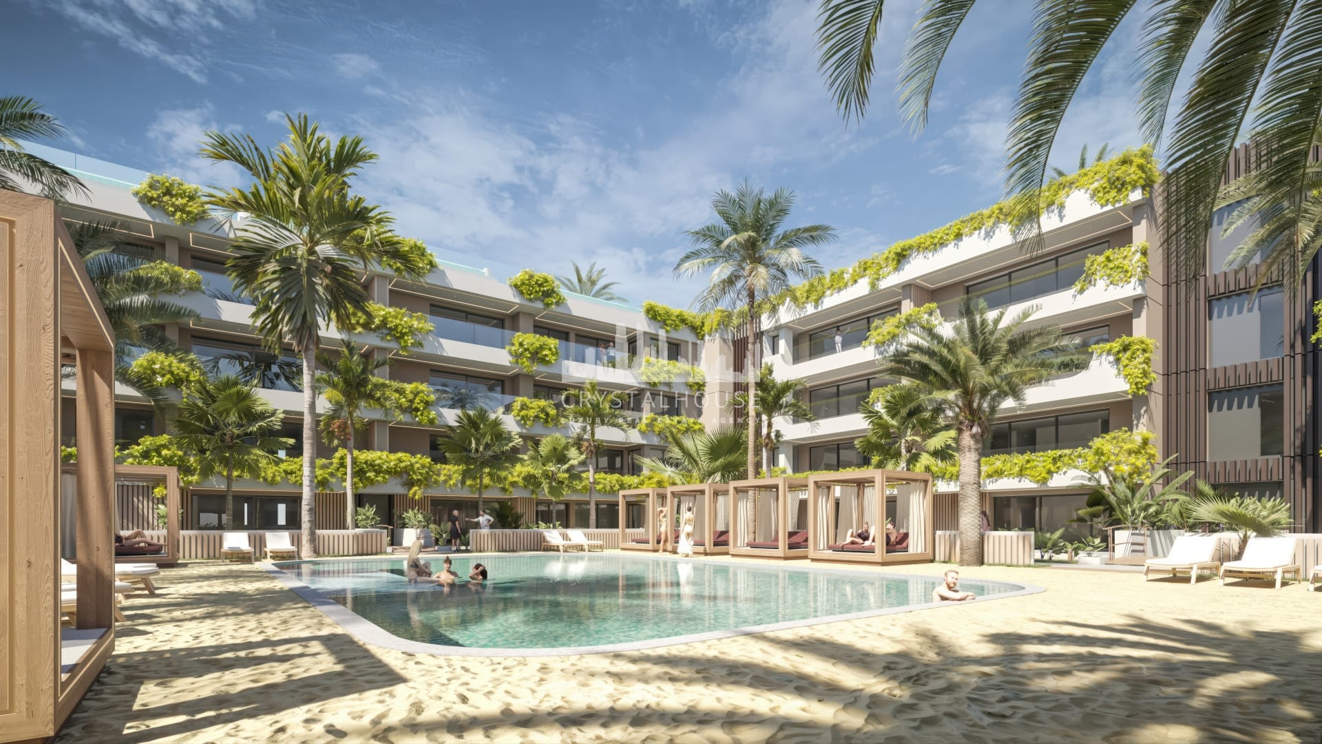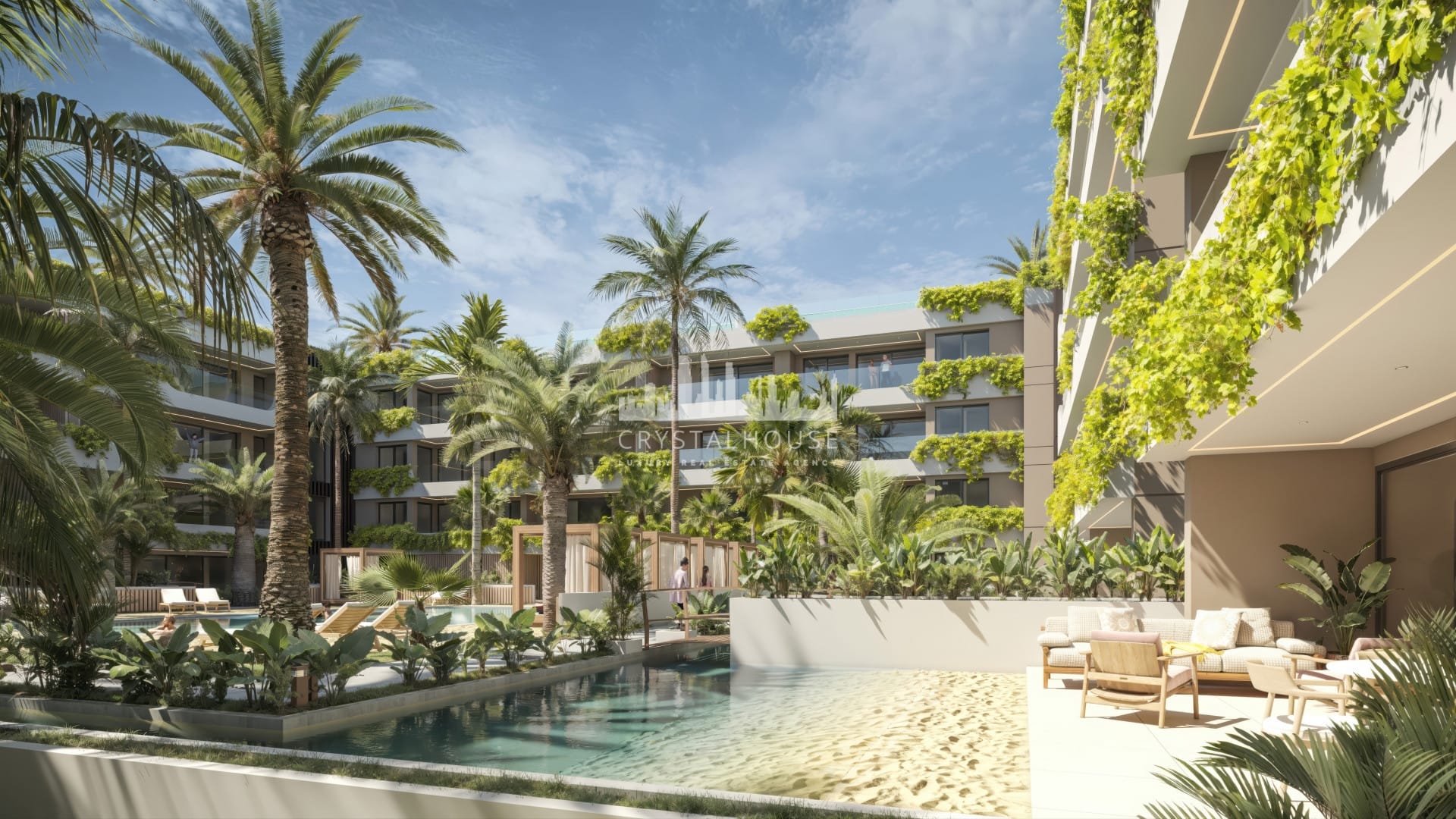 Jasne przestrzenie z otwartym designem, przestronne tarasy i panoramiczne widoki. Na parterze apartamenty posiadają prywatne ogrody i baseny w stylu plażowym, natomiast penthouses mają solarium i prywatny basen.